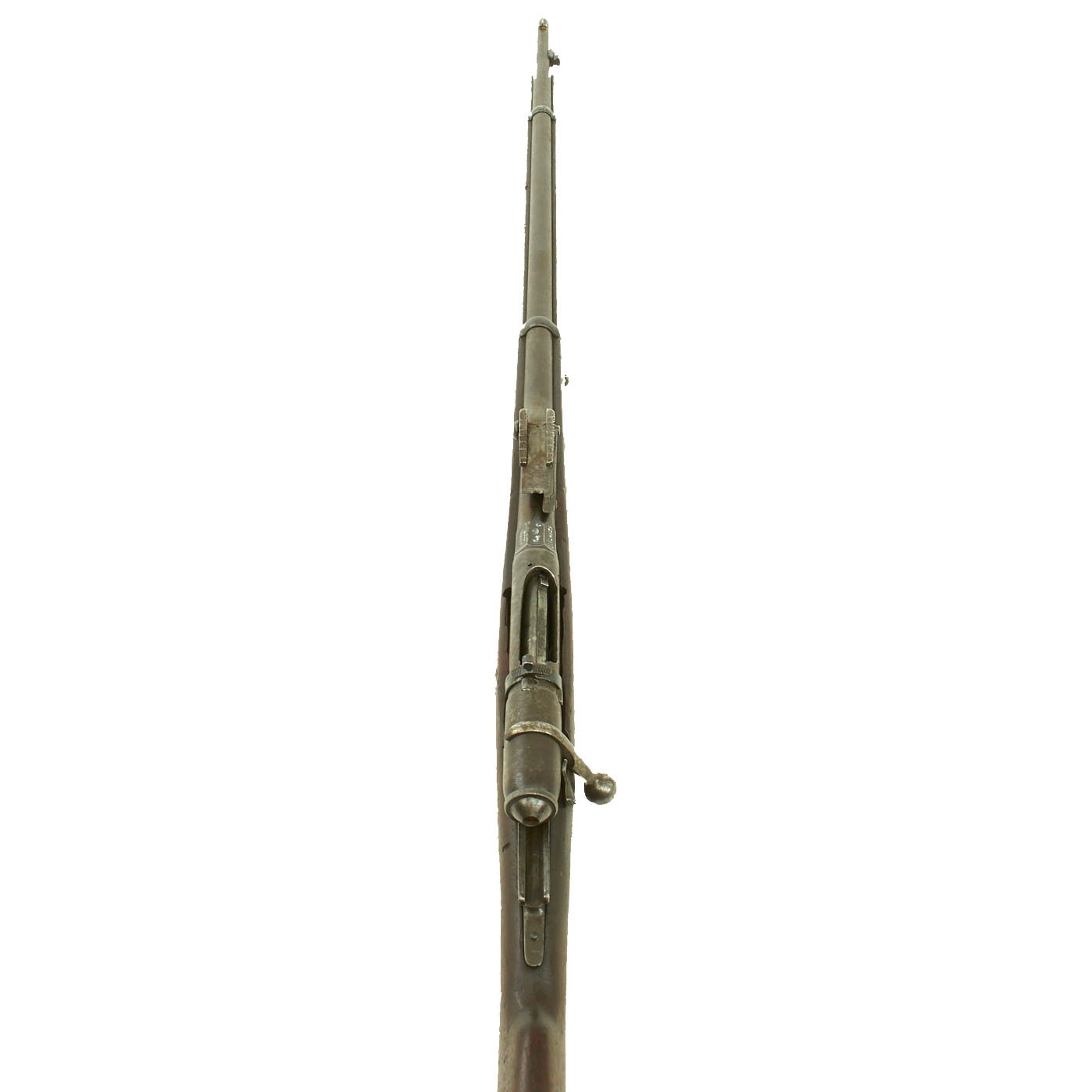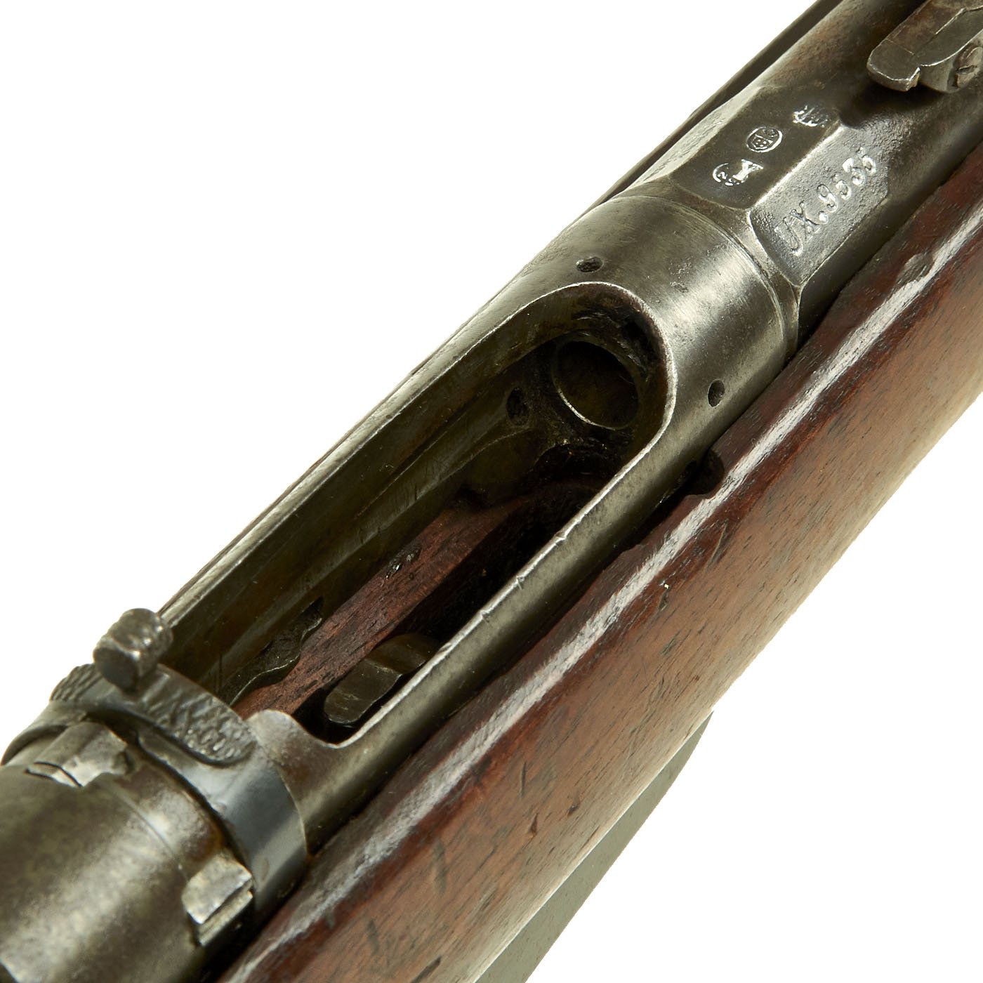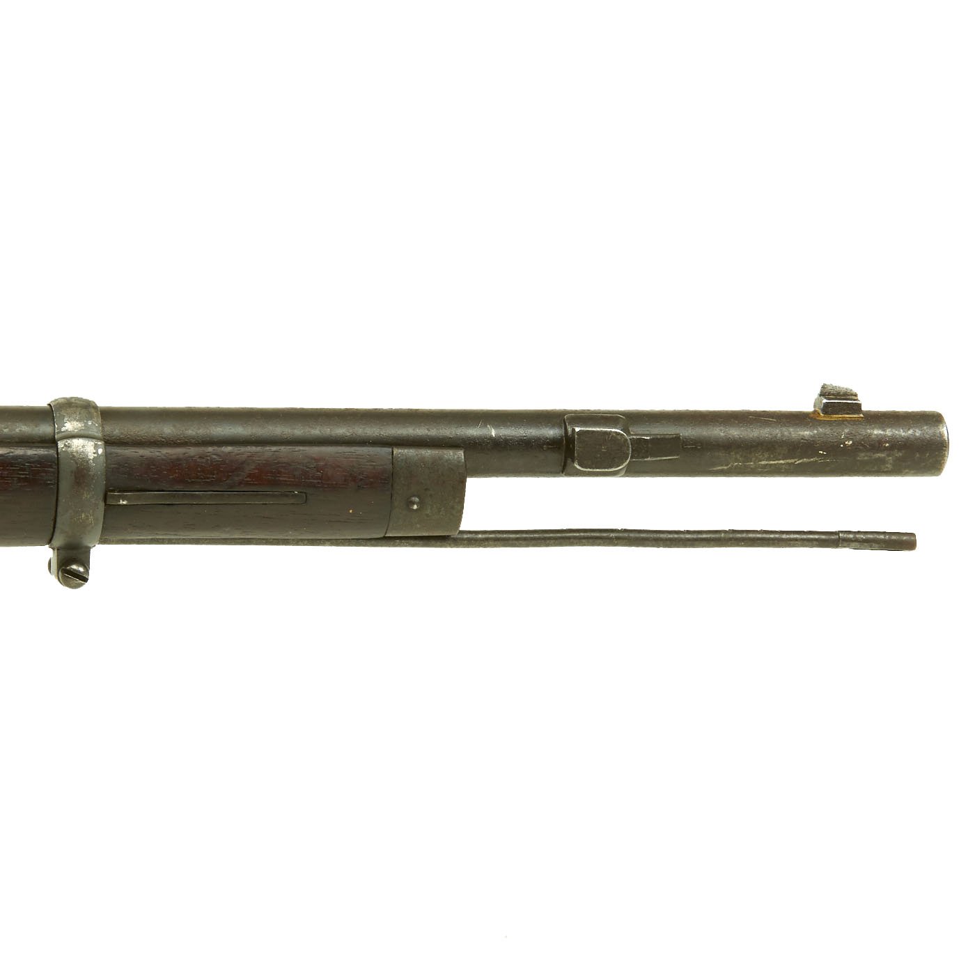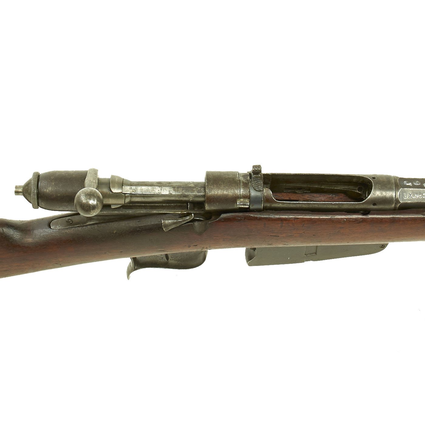 The rifle is mechanically in very good condition with a nice bore with crisp lands and grooves, and a bright finish. As usual for these rifles, there is a bit of slop with the bolt action. Stock is in good shape, though it does have some the expected dents and wear from age. It does not appear to have been sanded down much at arsenal, so the original markings are visible, with a great cartouche on the left butt stock. The metalwork is good, but does show some surface rusting on the upper side, so it was stored in a damp location for some time. Rifle still has the original cleaning rod present, which were ground down for the reduced bore. The rear sight button is a bit loose, but still functional.