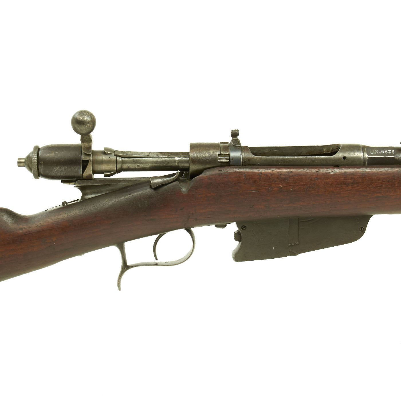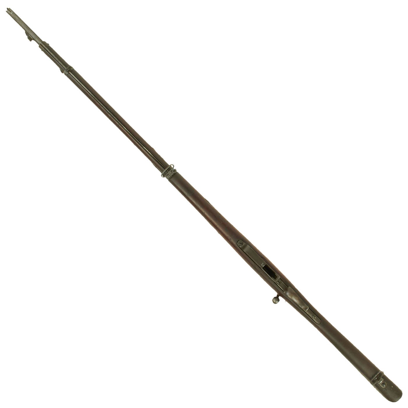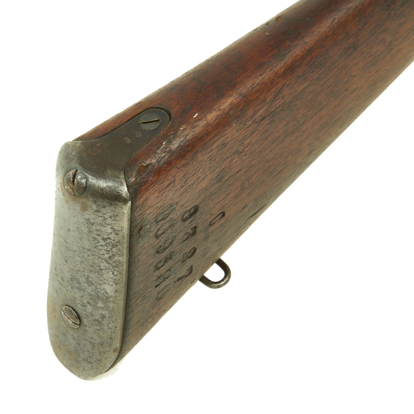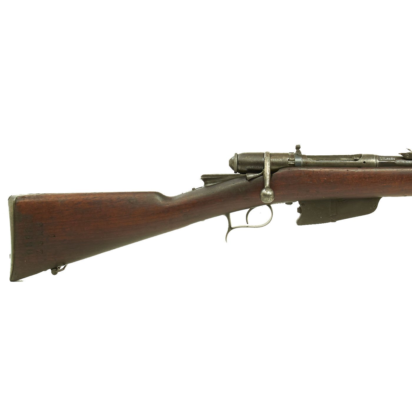 The rifle is mechanically in very good condition with a nice bore with crisp lands and grooves, and a bright finish. As usual for these rifles, there is a bit of slop with the bolt action. Stock is in good shape, though it does have some the expected dents and wear from age. It does not appear to have been sanded down much at arsenal, so the original markings are visible, with a great cartouche on the left butt stock. The metalwork is good, but does show some surface rusting on the upper side, so it was stored in a damp location for some time. Rifle still has the original cleaning rod present, which were ground down for the reduced bore. The rear sight button is a bit loose, but still functional.