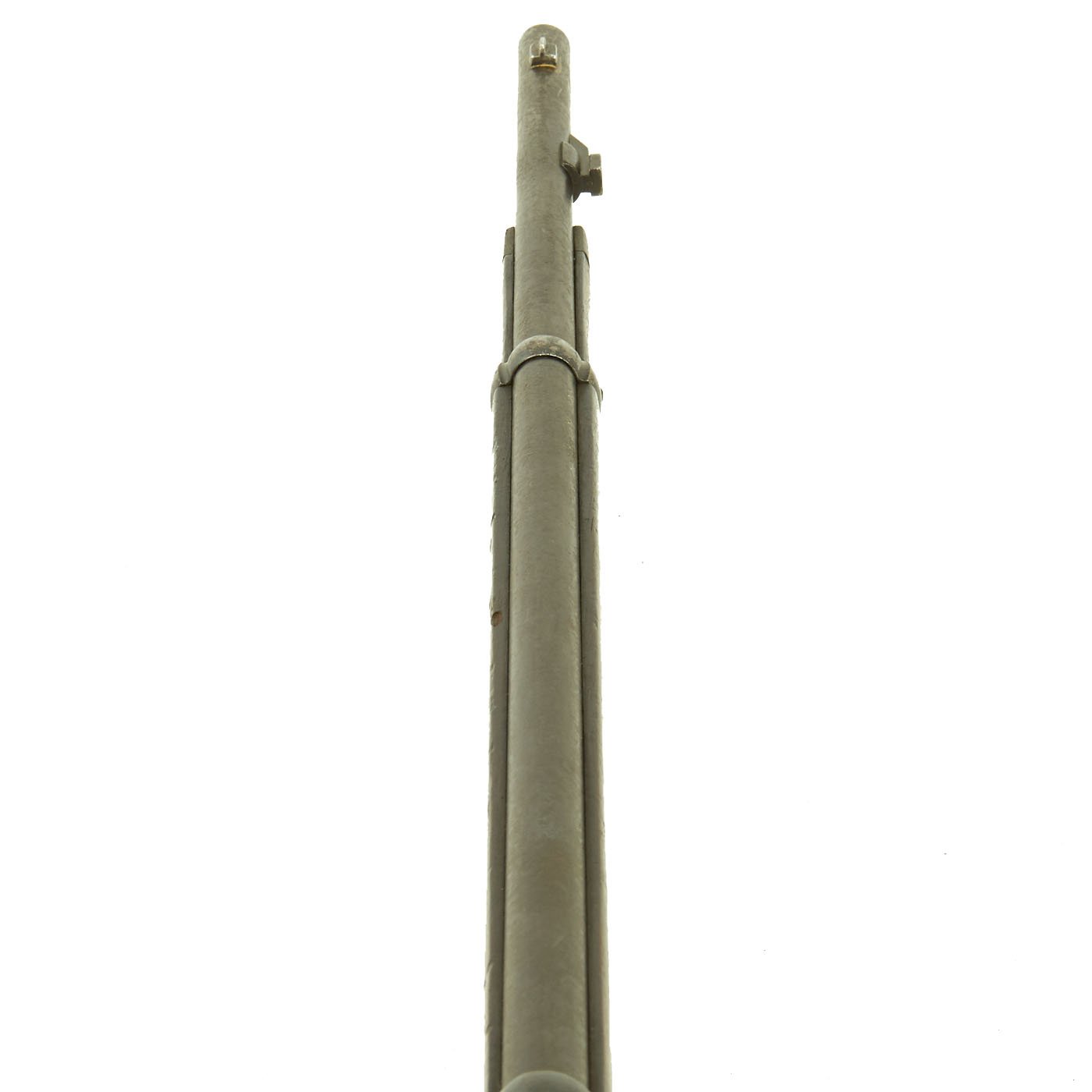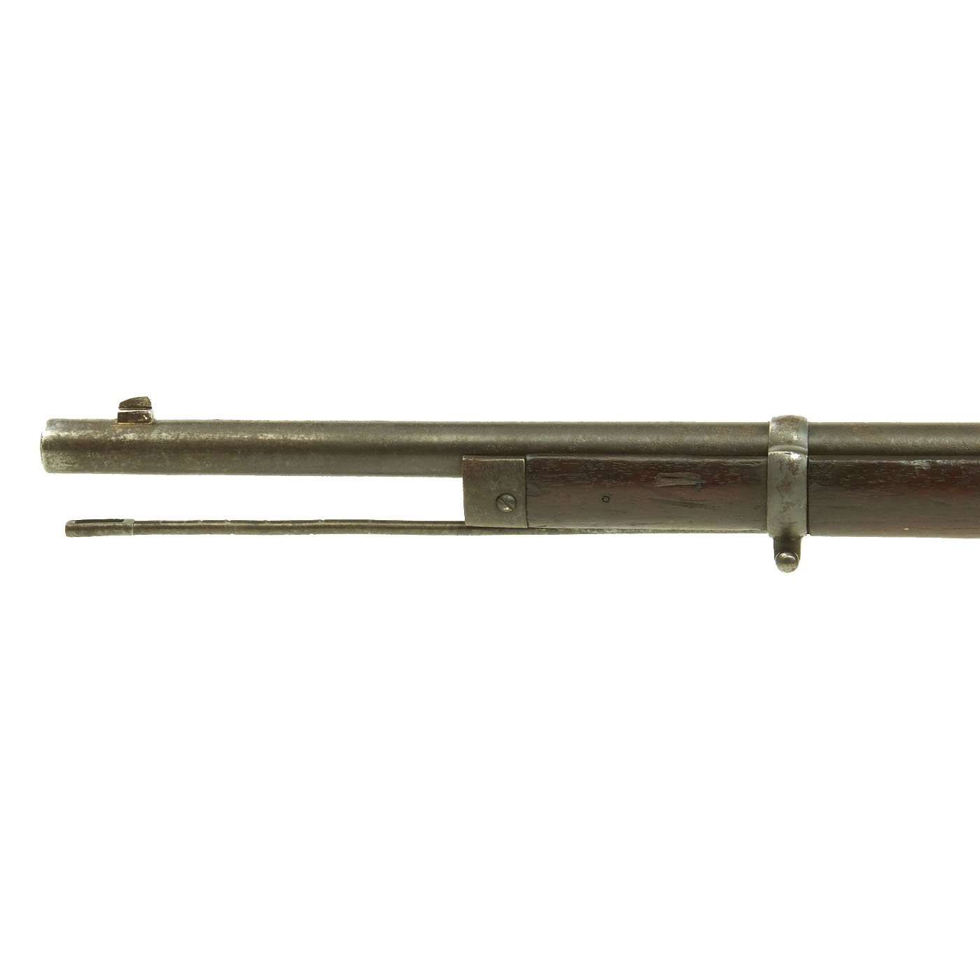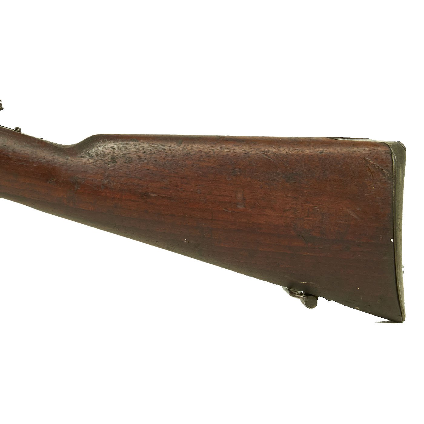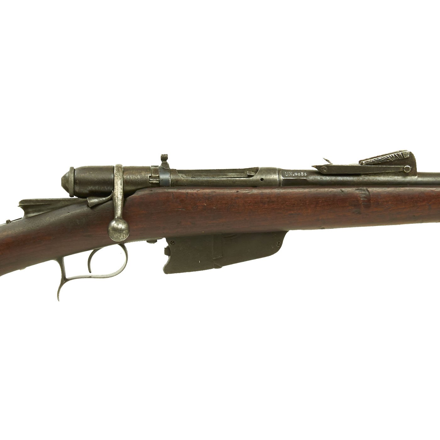 The rifle is mechanically in very good condition with a nice bore with crisp lands and grooves, and a bright finish. As usual for these rifles, there is a bit of slop with the bolt action. Stock is in good shape, though it does have some the expected dents and wear from age. It does not appear to have been sanded down much at arsenal, so the original markings are visible, with a great cartouche on the left butt stock. The metalwork is good, but does show some surface rusting on the upper side, so it was stored in a damp location for some time. Rifle still has the original cleaning rod present, which were ground down for the reduced bore. The rear sight button is a bit loose, but still functional.