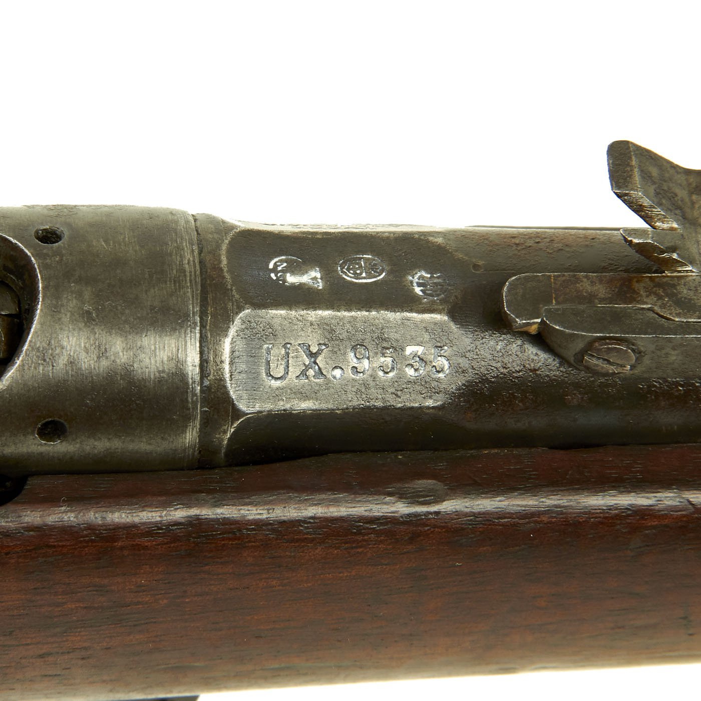 This example bears serial number UX.9535 on the barrel, while the stock is unmatched, and is offered in very good condition. It is marked TORRE / ANNUNZIATA over an 1877 date on the barrel, indicating manufacture in Naples in 1877. This is a somewhat rare maker, and most examples we see are made in Turin or Brescia. There is a maker symbol on the top of the nocks form, but it is unfortunately not one that we recognize.