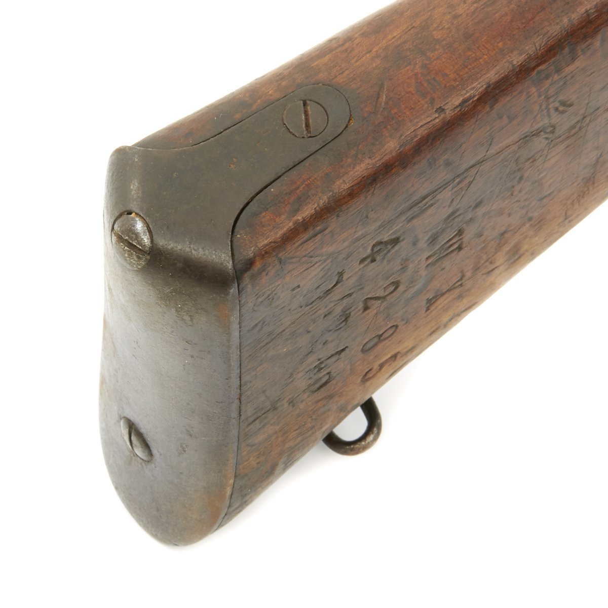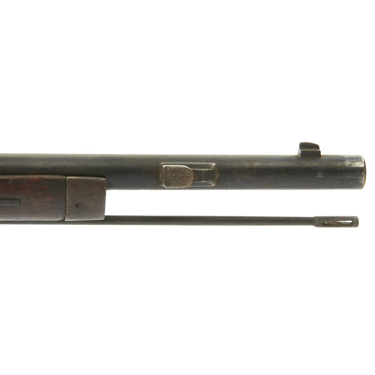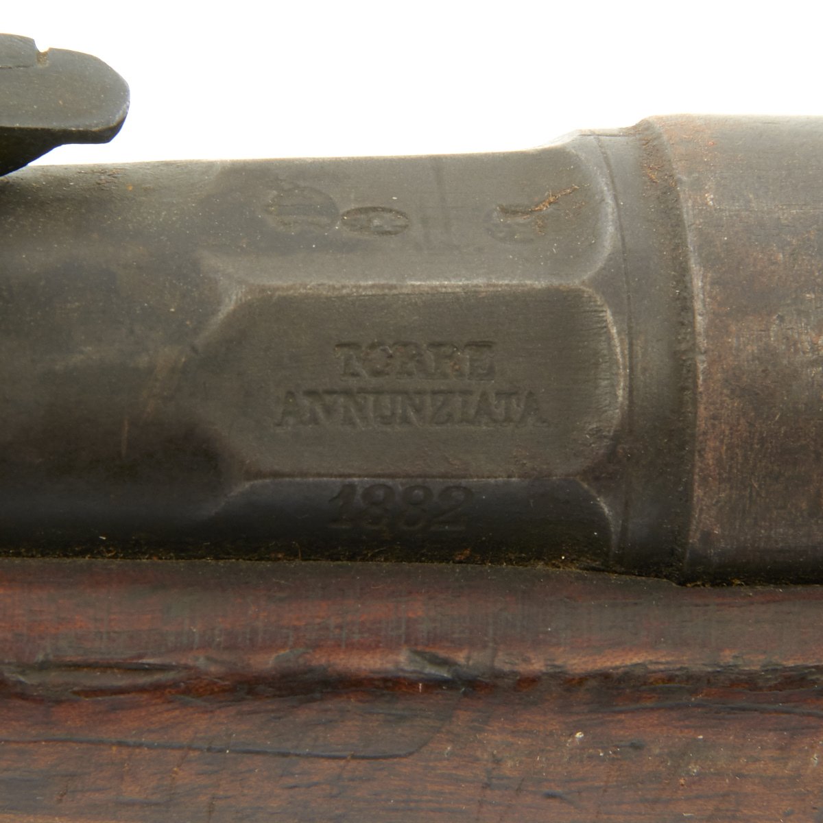 This example bears serial number WX.4285 on the barrel and stock, and is offered in very good condition. It is marked TORRE / ANNUNZIATA over an 1882 date on the barrel, indicating manufacture in Naples in 1882. Mechanically in very good condition with a nice bore with clear lands and grooves, with some wear. Stock is in good shape, though it does have some the expected dents and wear from age. It does not appear to have been sanded down at arsenal, so the original markings are visible. Rifle still has the original cleaning rod present, though the upper sling swivel is broken off.