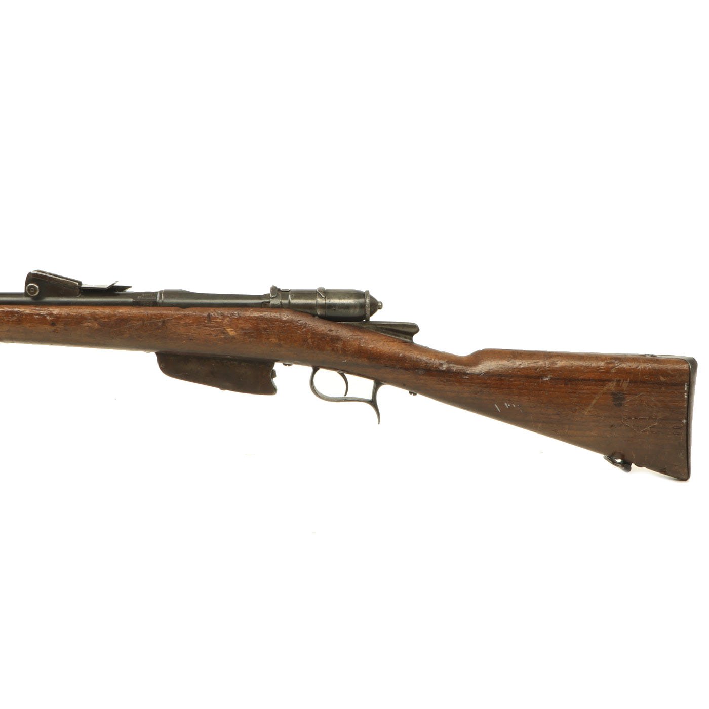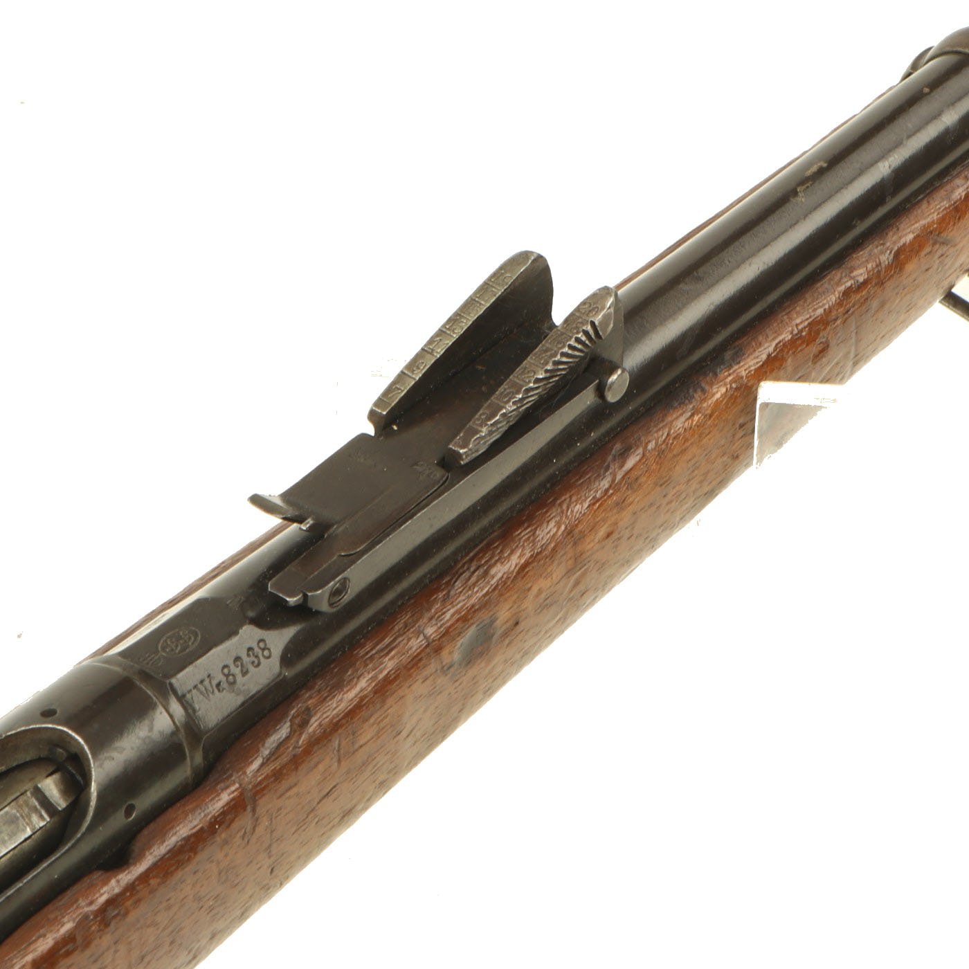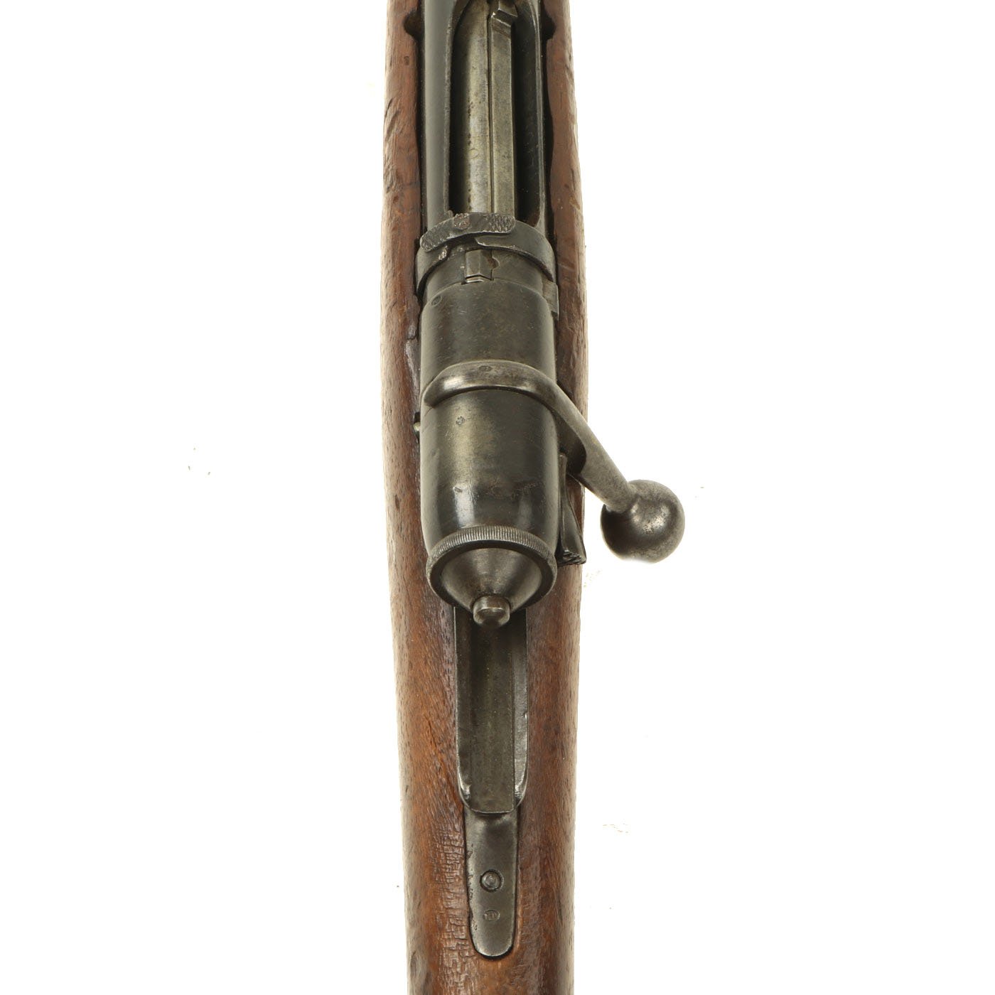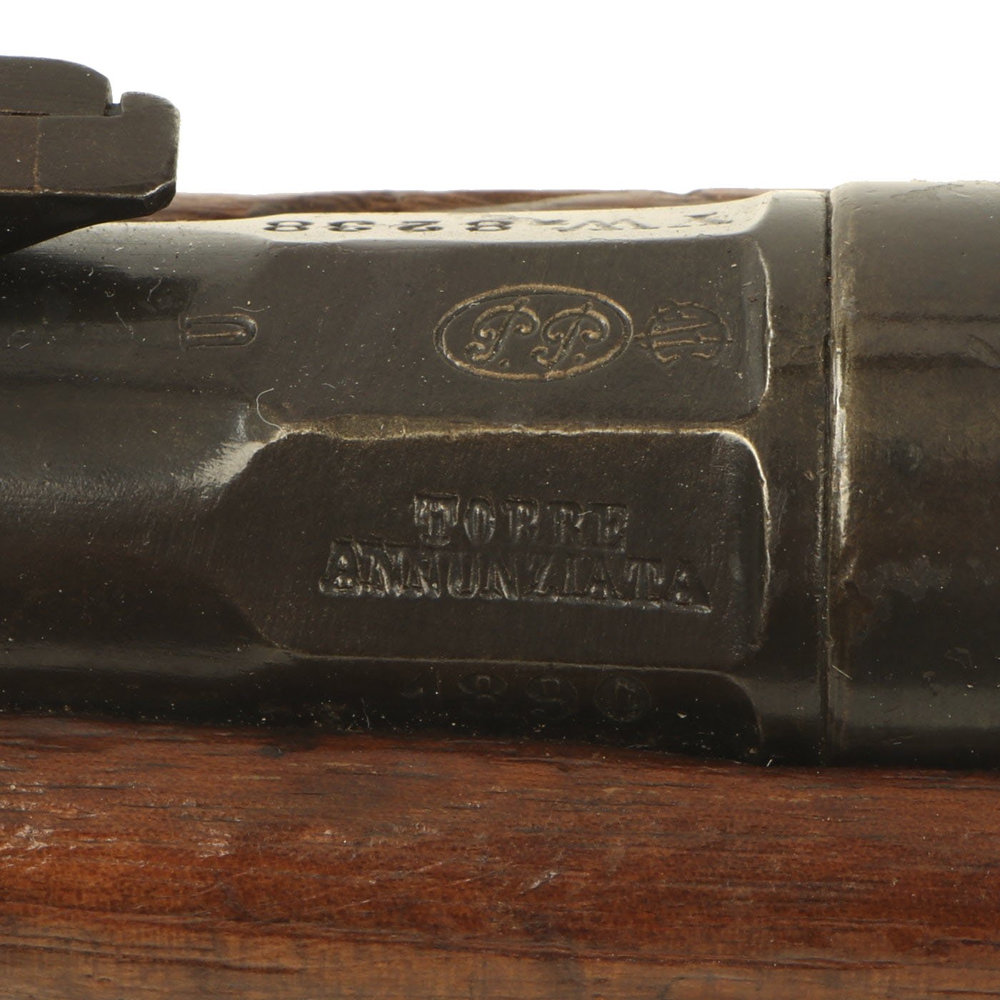 This example bears serial number YW.8238 on the barrel and right butt stock, and is offered in very good condition. It is marked TORRE / ANNUNZIATA over an 1890 date on the barrel, indicating manufacture in Naples in 1890. This is a somewhat rare maker, and most examples we see are made in Turin or Brescia. There is a maker symbol on the top of the nocks form, but it is unfortunately not one that we recognize. As this rifle was made in 1890, it was most likely originally manufactured in the M1870/87 configuration with a magazine. Mechanically in very good condition, this rifle has a good bore with clear lands and grooves, though the grooves are a bit dark. As usual for these rifles, there is a bit of slop with the bolt action, though the bolt handle itself is rather stiff.