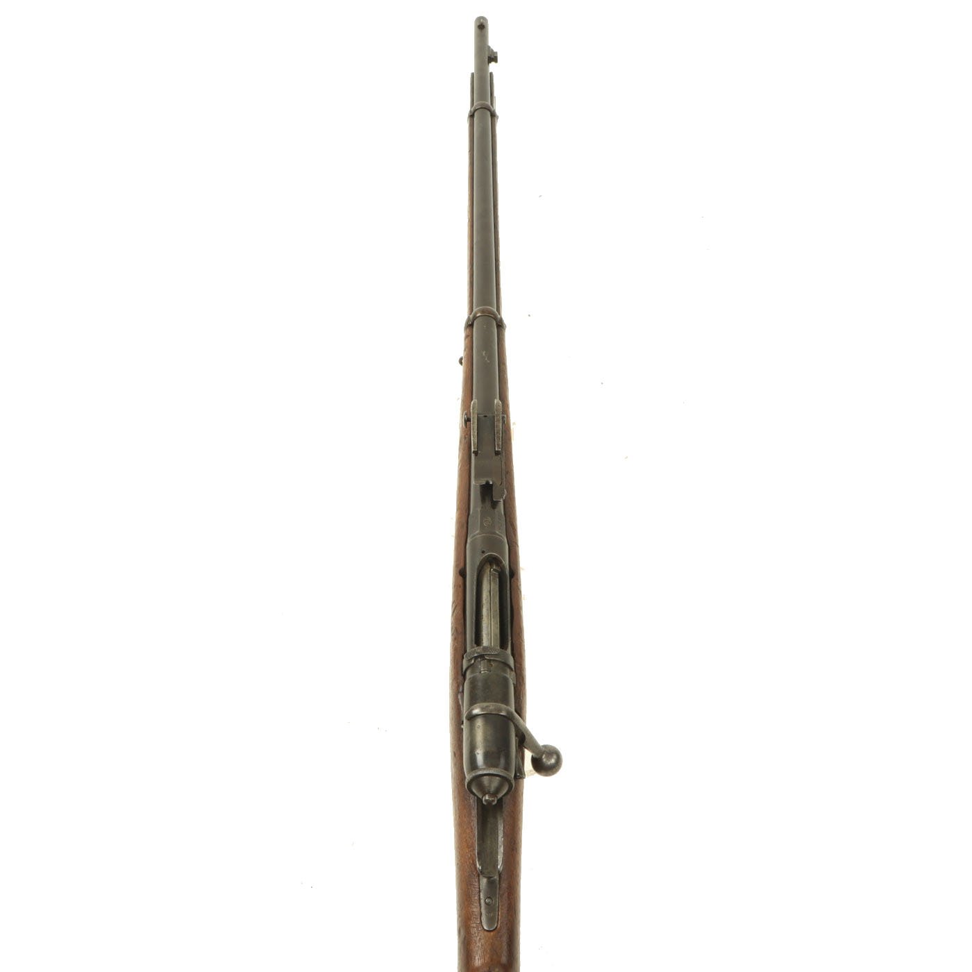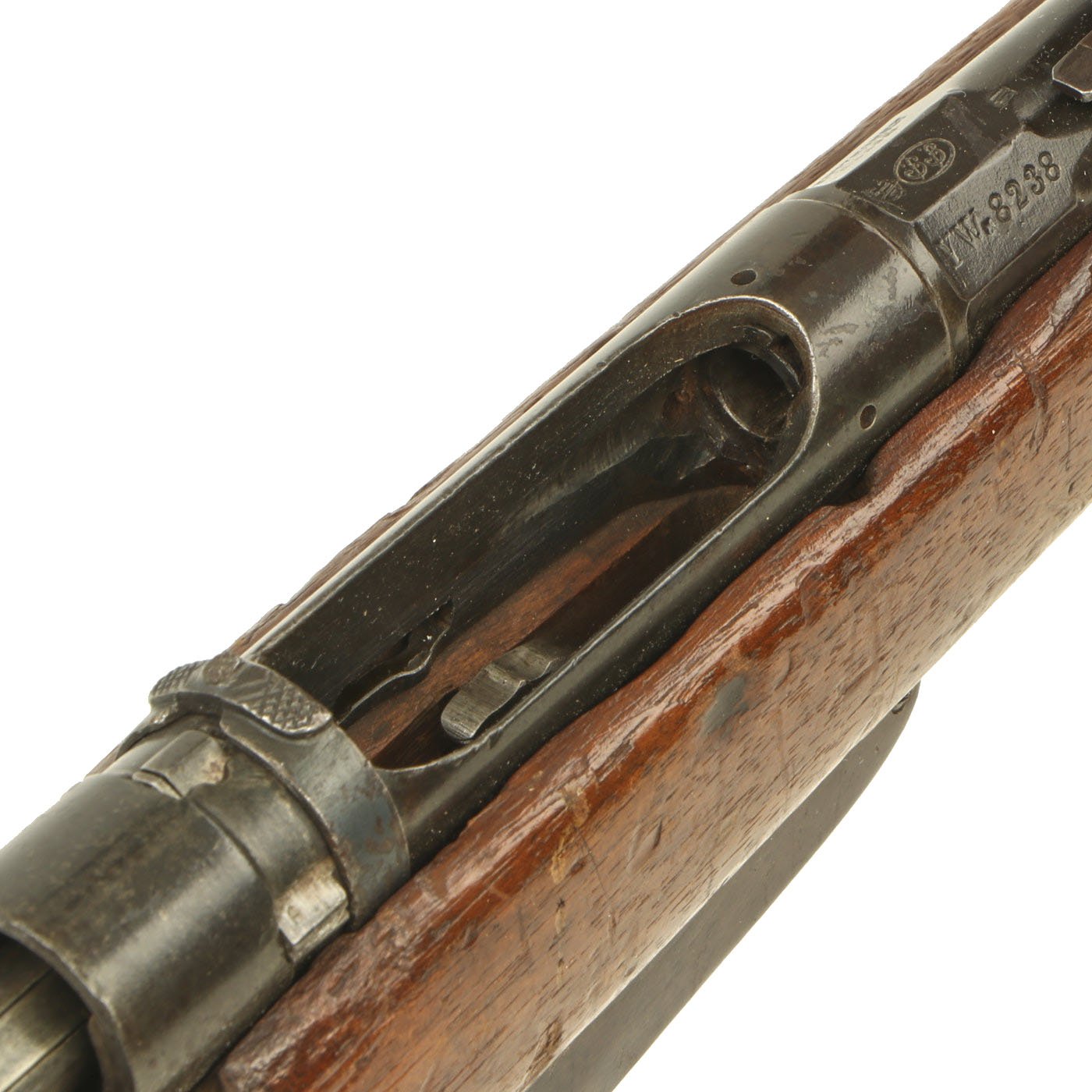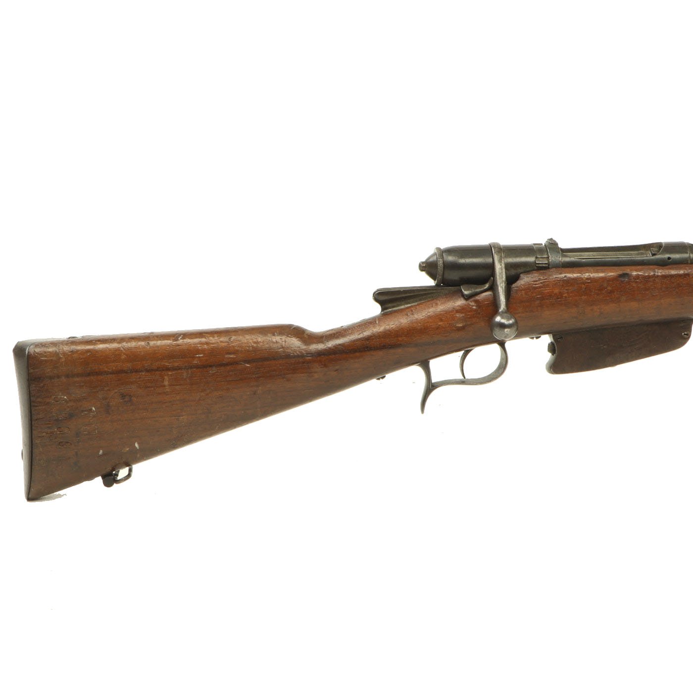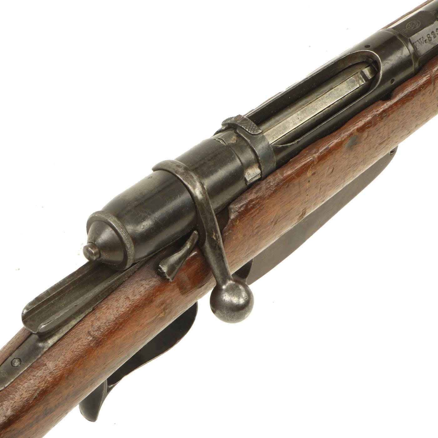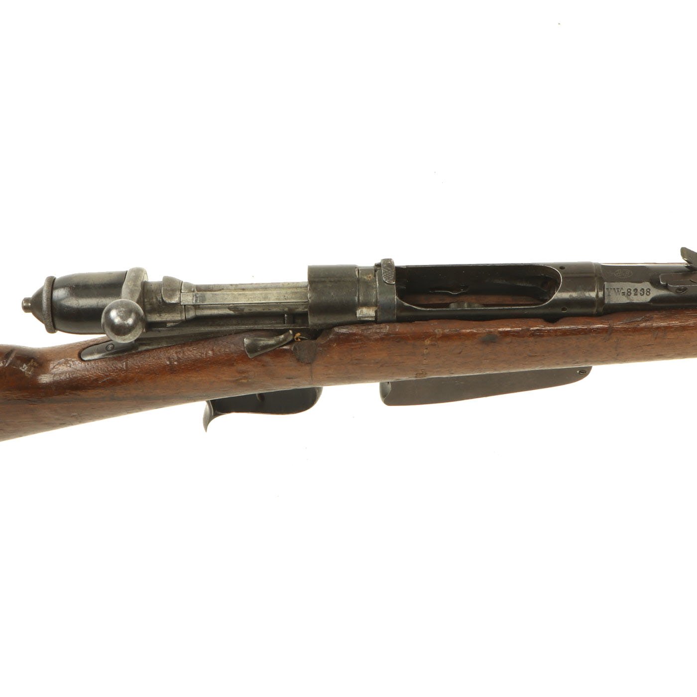 This example bears serial number YW.8238 on the barrel and right butt stock, and is offered in very good condition. It is marked TORRE / ANNUNZIATA over an 1890 date on the barrel, indicating manufacture in Naples in 1890. This is a somewhat rare maker, and most examples we see are made in Turin or Brescia. There is a maker symbol on the top of the nocks form, but it is unfortunately not one that we recognize. As this rifle was made in 1890, it was most likely originally manufactured in the M1870/87 configuration with a magazine. Mechanically in very good condition, this rifle has a good bore with clear lands and grooves, though the grooves are a bit dark. As usual for these rifles, there is a bit of slop with the bolt action, though the bolt handle itself is rather stiff.