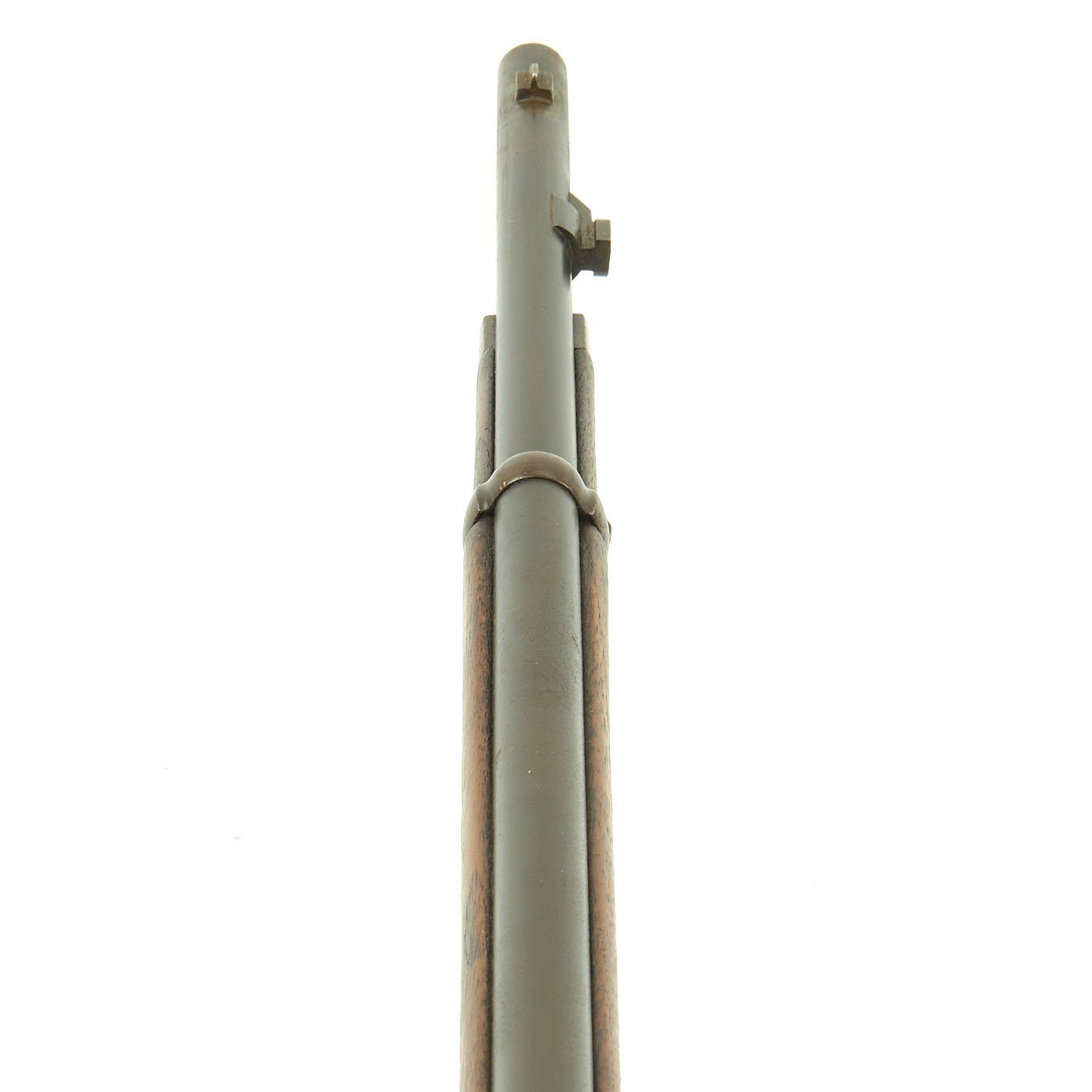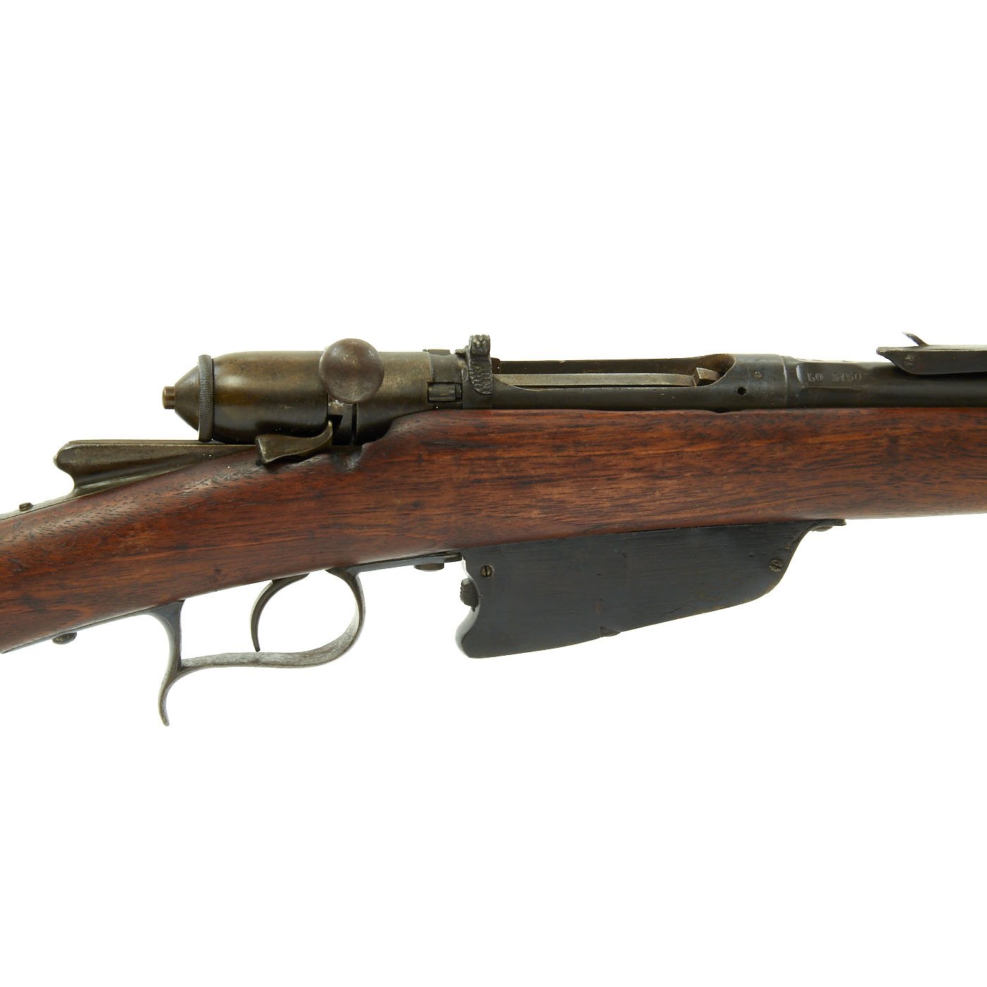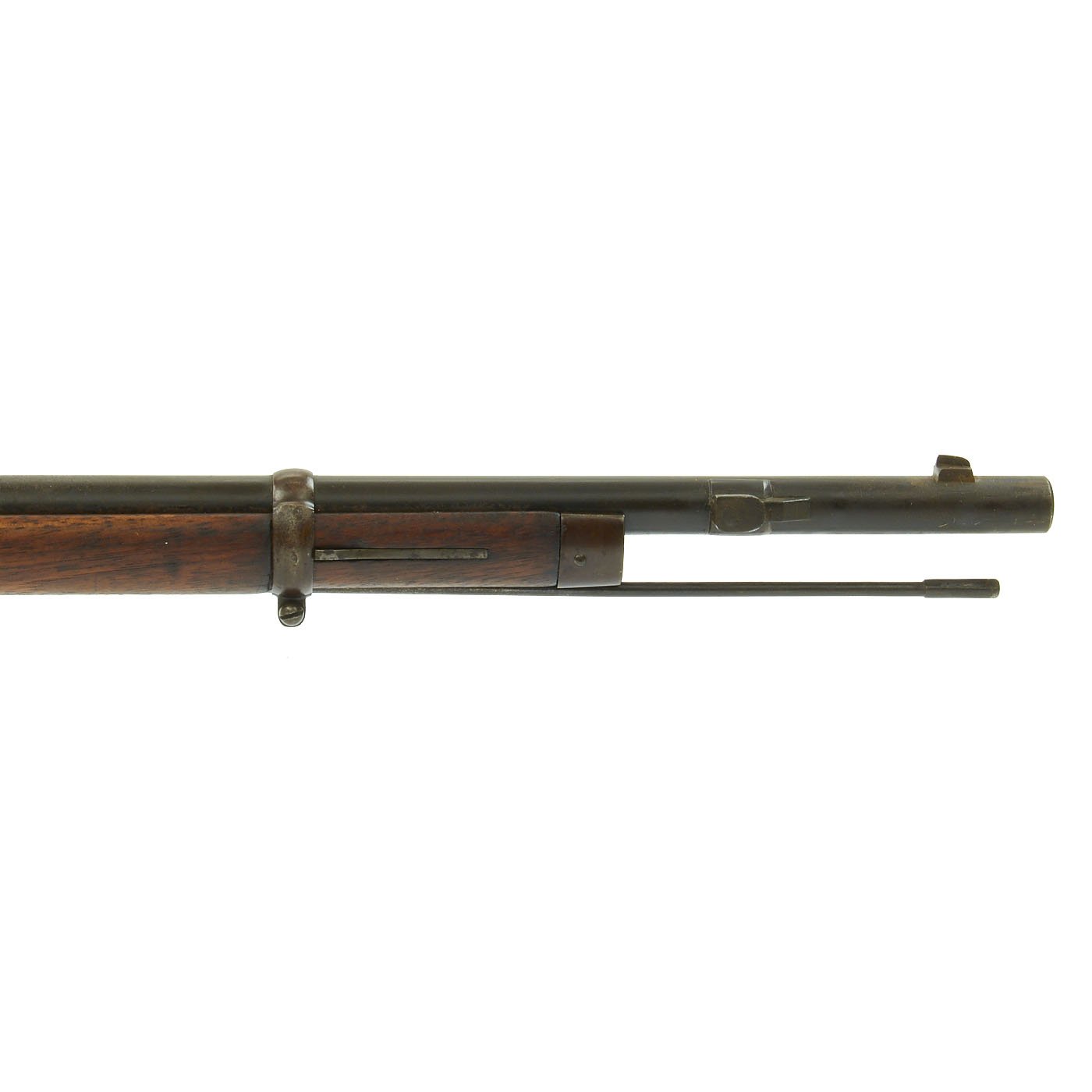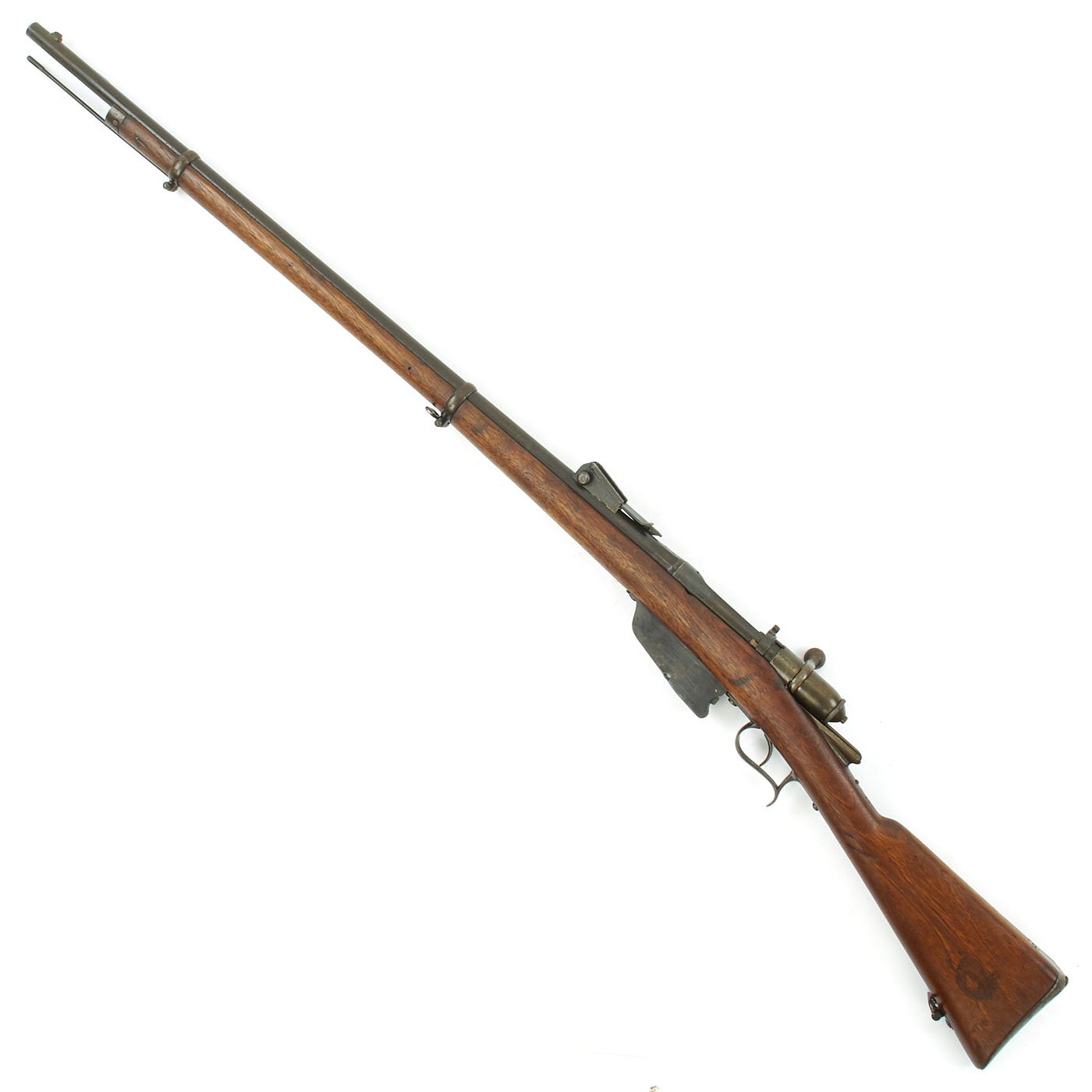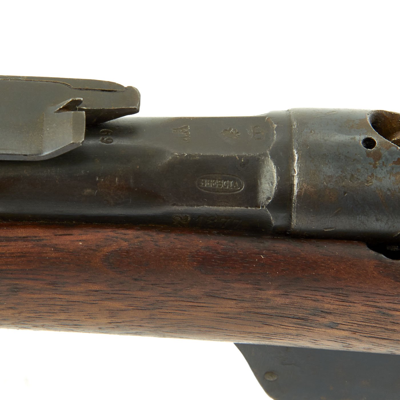 This example bears serial number LO 3150 on the barrel and stock, and is offered in very good condition. It is marked BRESCIA over an 1877 date on the barrel, indicating manufacture in Brescia, a major gunmaking region of Italy. There is a maker symbol on the top of the knoxform, but it is unfortunately not one that we recognize. Mechanically in very good condition, this rifle has an excellent bore with clear lands and grooves, and a bright finish.