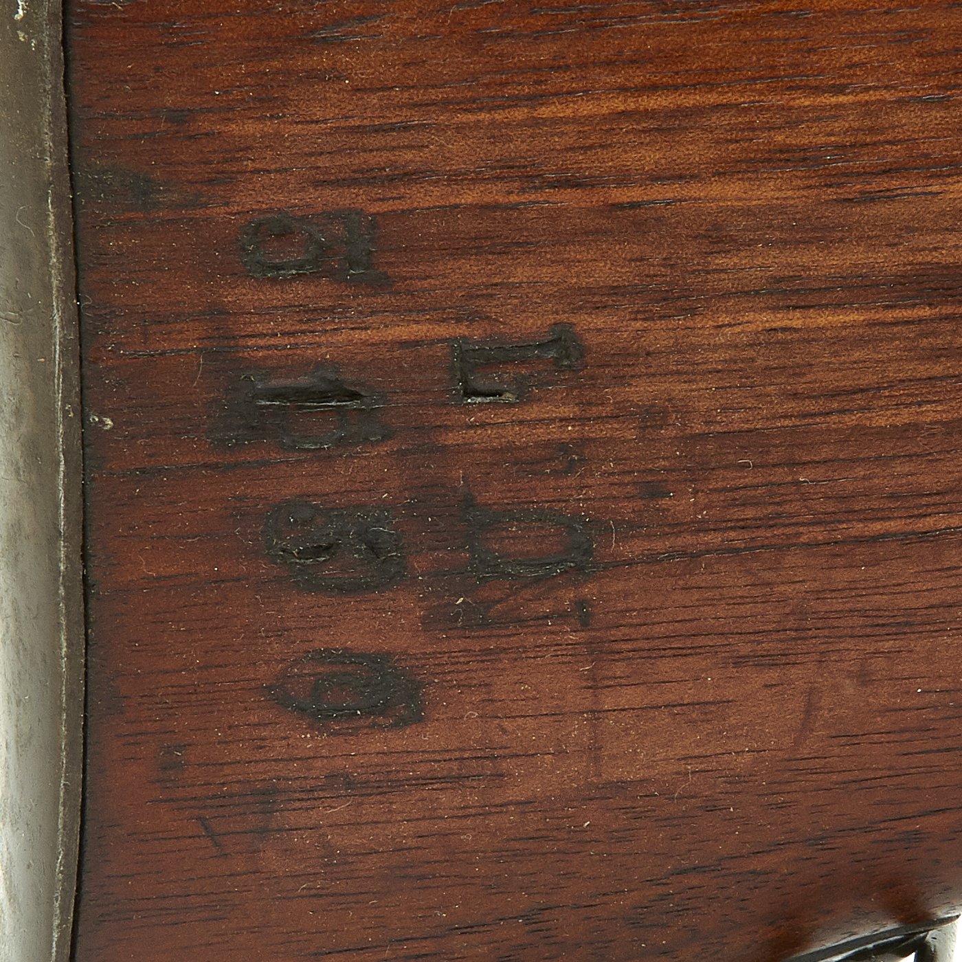 Stock is in good shape, though it does have some the expected dents and wear from age. It was refurbished at arsenal, so there original markings are visible on the left butt stock, while the right butt stock markings cannot be read. Rifle still has the original cleaning rod present, which were ground down for the reduced bore.