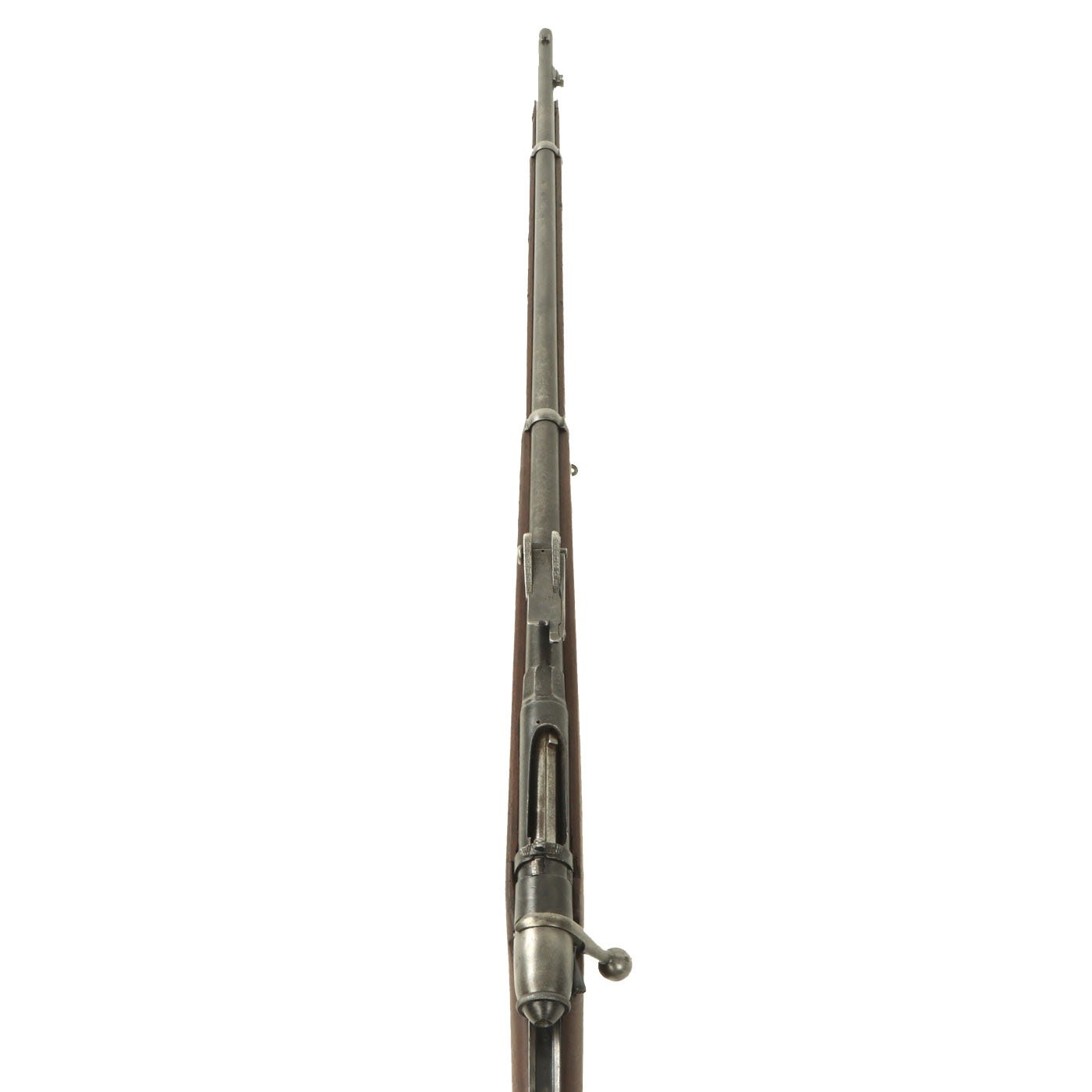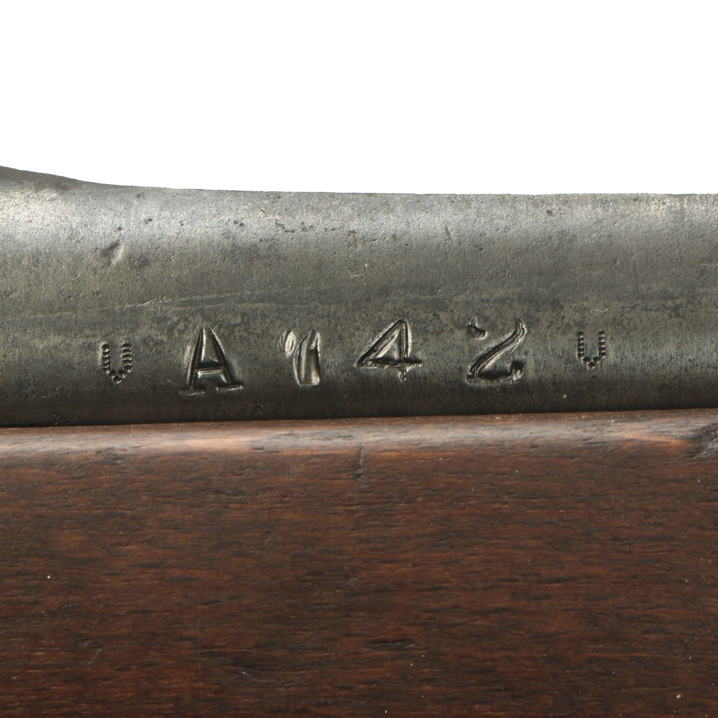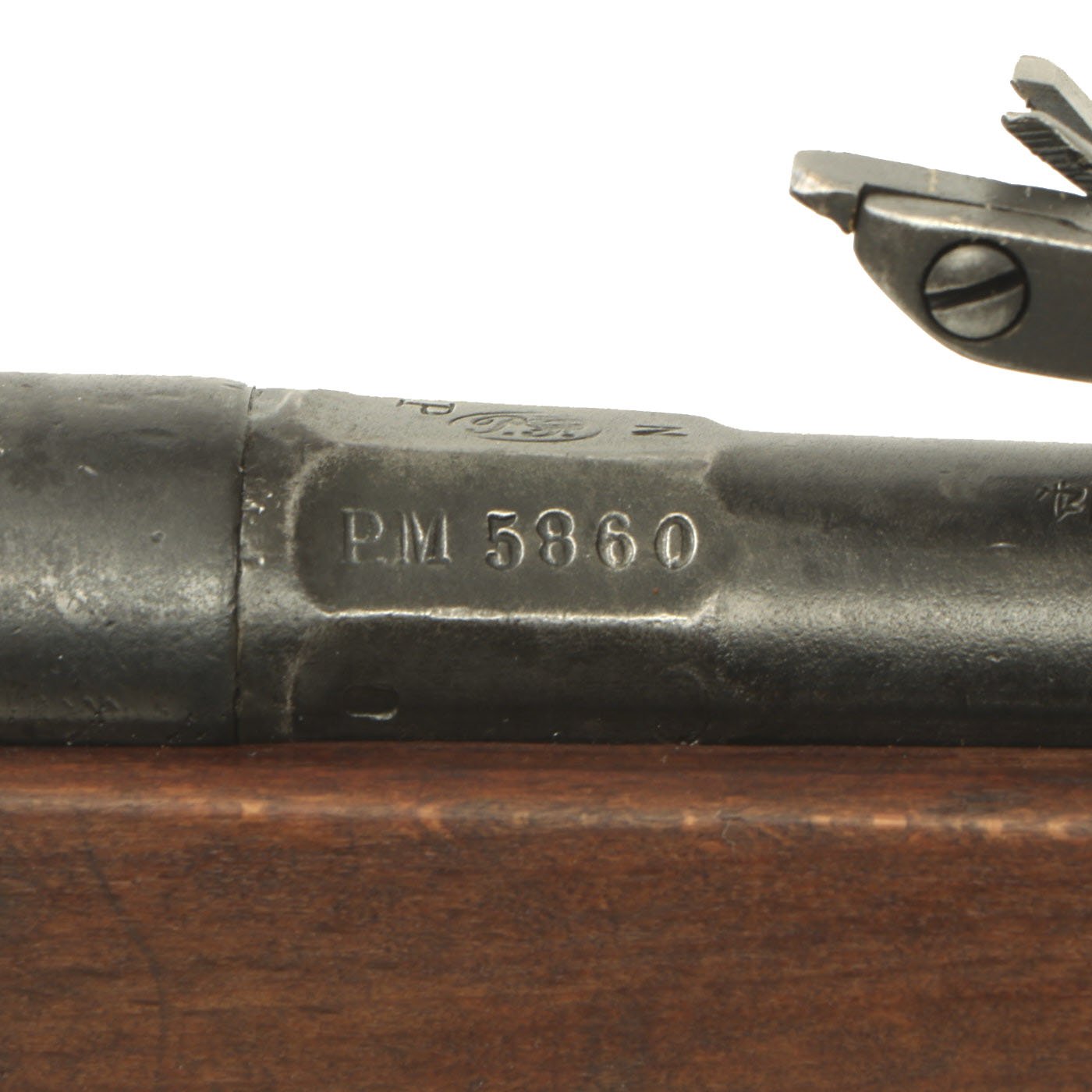 This example bears serial number PM 5860 on the barrel, and is offered in very good condition. It is marked BRESCIA over an 1890 date on the barrel, indicating manufacture in Brescia, a major gunmaking region of Italy. There is a maker symbol on the top of the nocks form, but it is unfortunately not one that we recognize. As this rifle was made in 1890, it was most likely originally manufactured in the M1870/87 configuration with a magazine. Mechanically in very good condition, this rifle has a good bore with clear lands and grooves, though the grooves are a bit dark. As usual for these rifles, there is a bit of slop with the bolt action, though the bolt handle itself is rather stiff.
