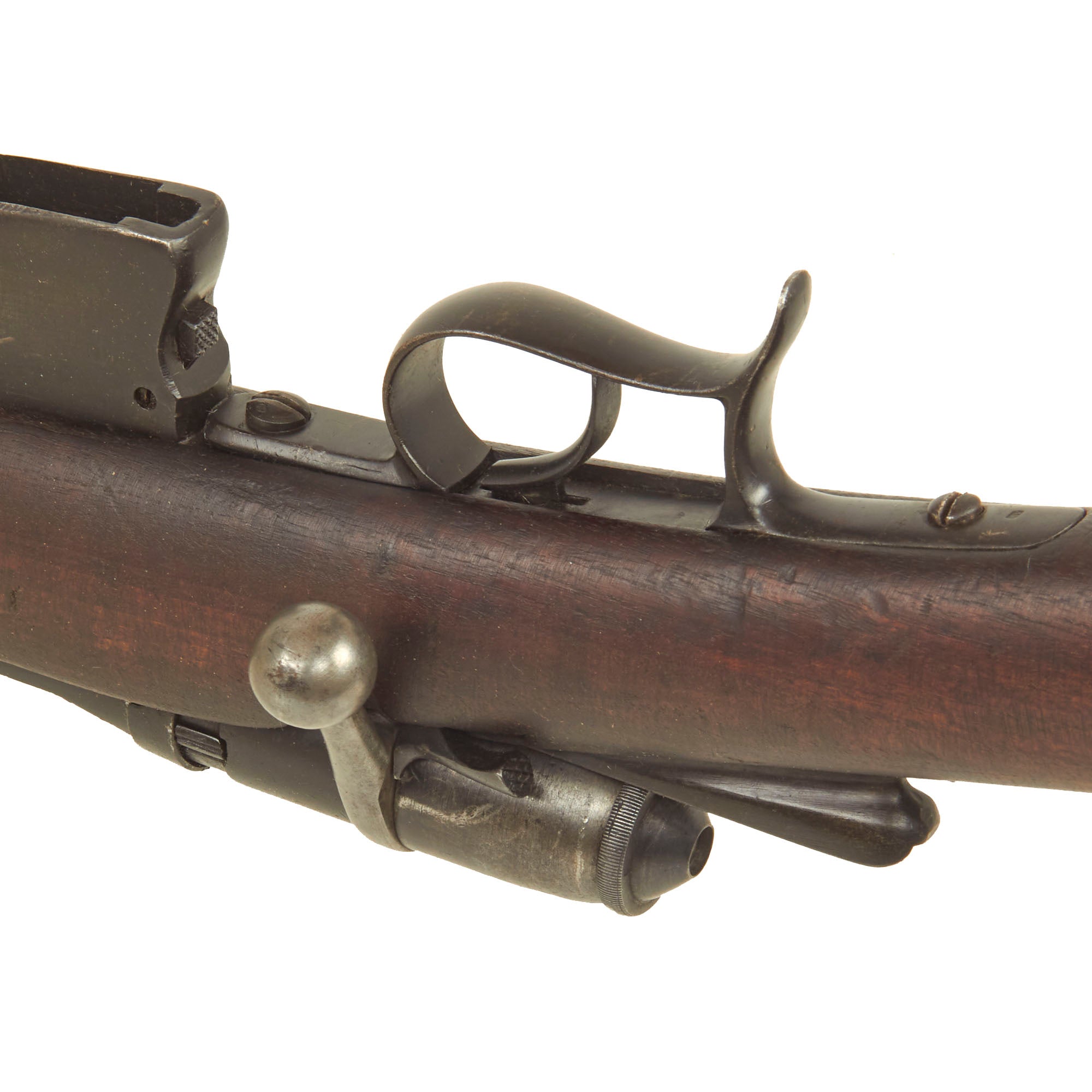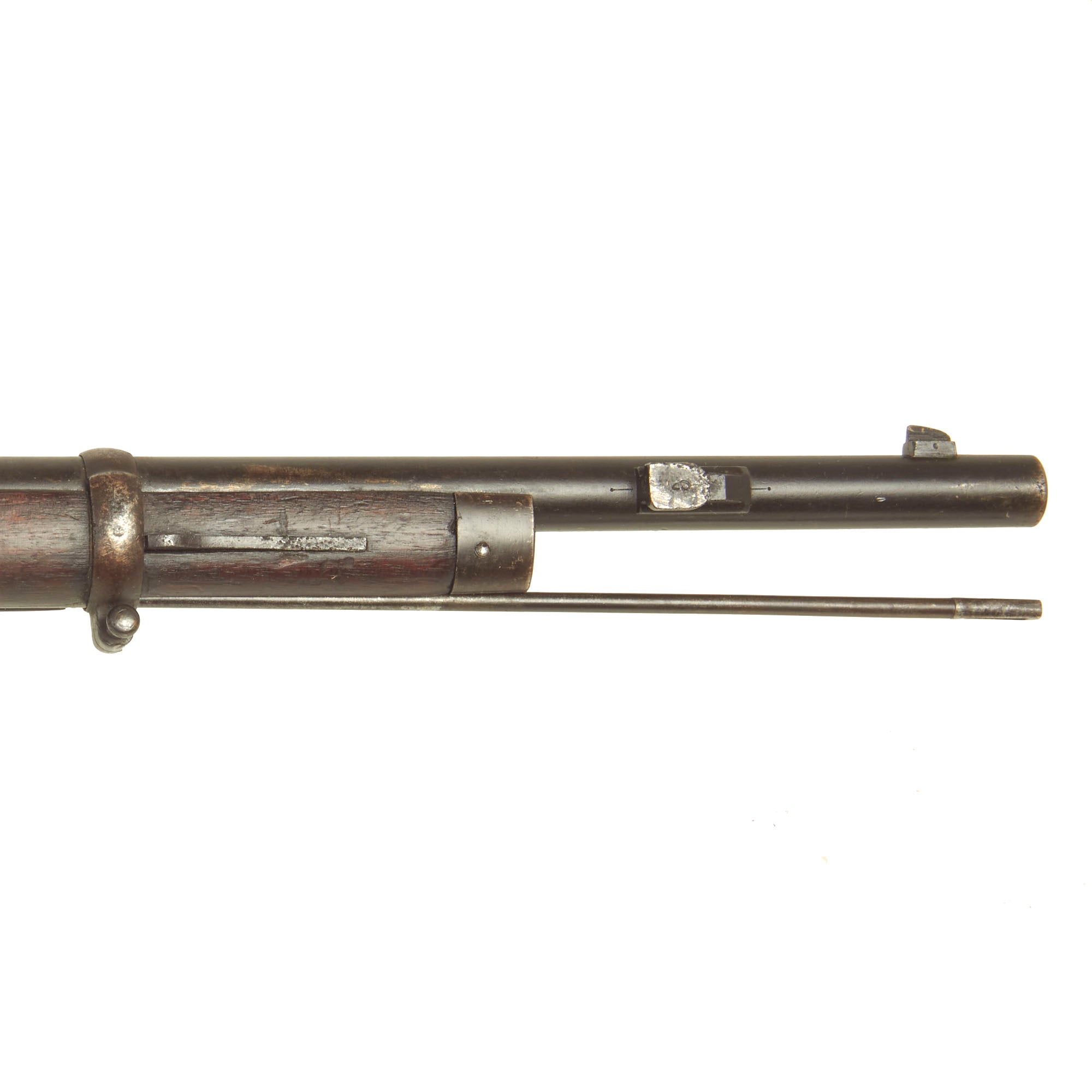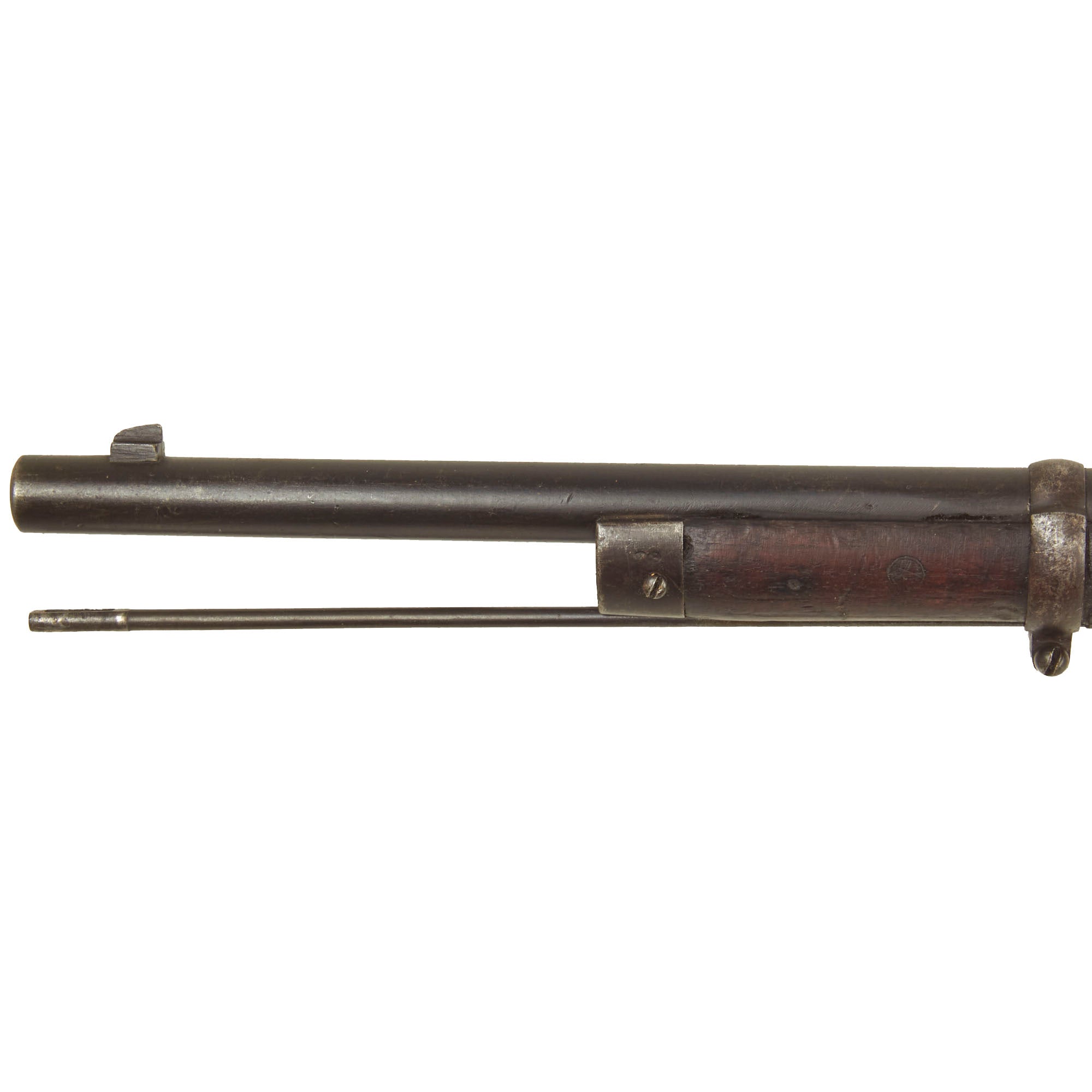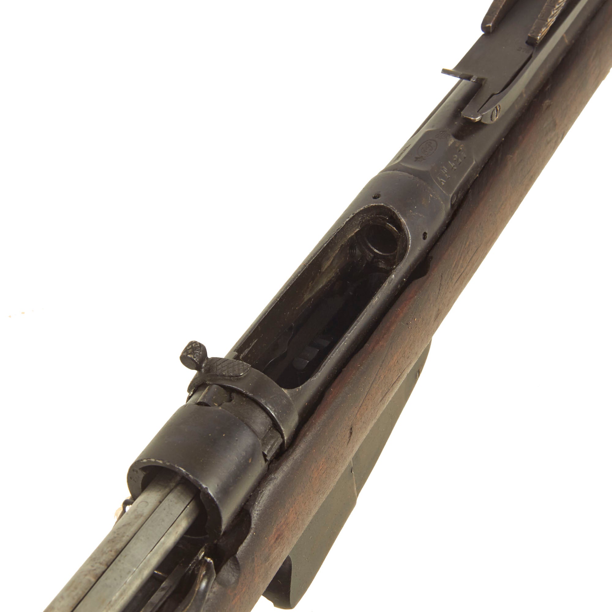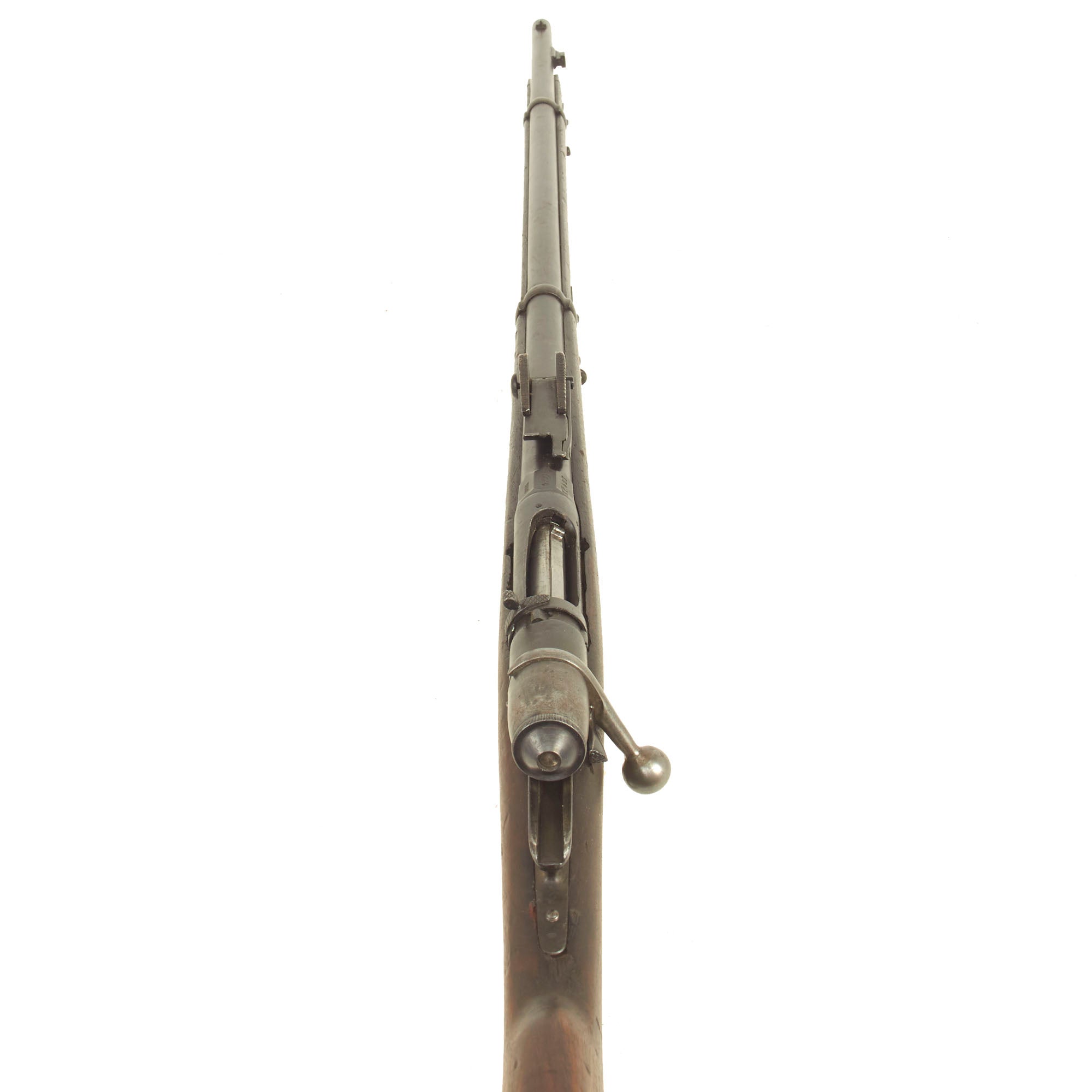 The rifle is mechanically in very good condition with a good bore showing clear lands and grooves, with a mostly bright finish. It does not look to have seen major use after being converted, as with many of these rifles. As usual for these rifles, there is a bit of slop with the bolt action. The rifle still does has its original cleaning rod, which has had the head turned down for the reduced 6.5mm bore. The rear sight is complete, and fully functional. Both sling swivels are also intact and functional. The finish on the metal components is really still in great shape, showing an arsenal refinish from when it was converted.