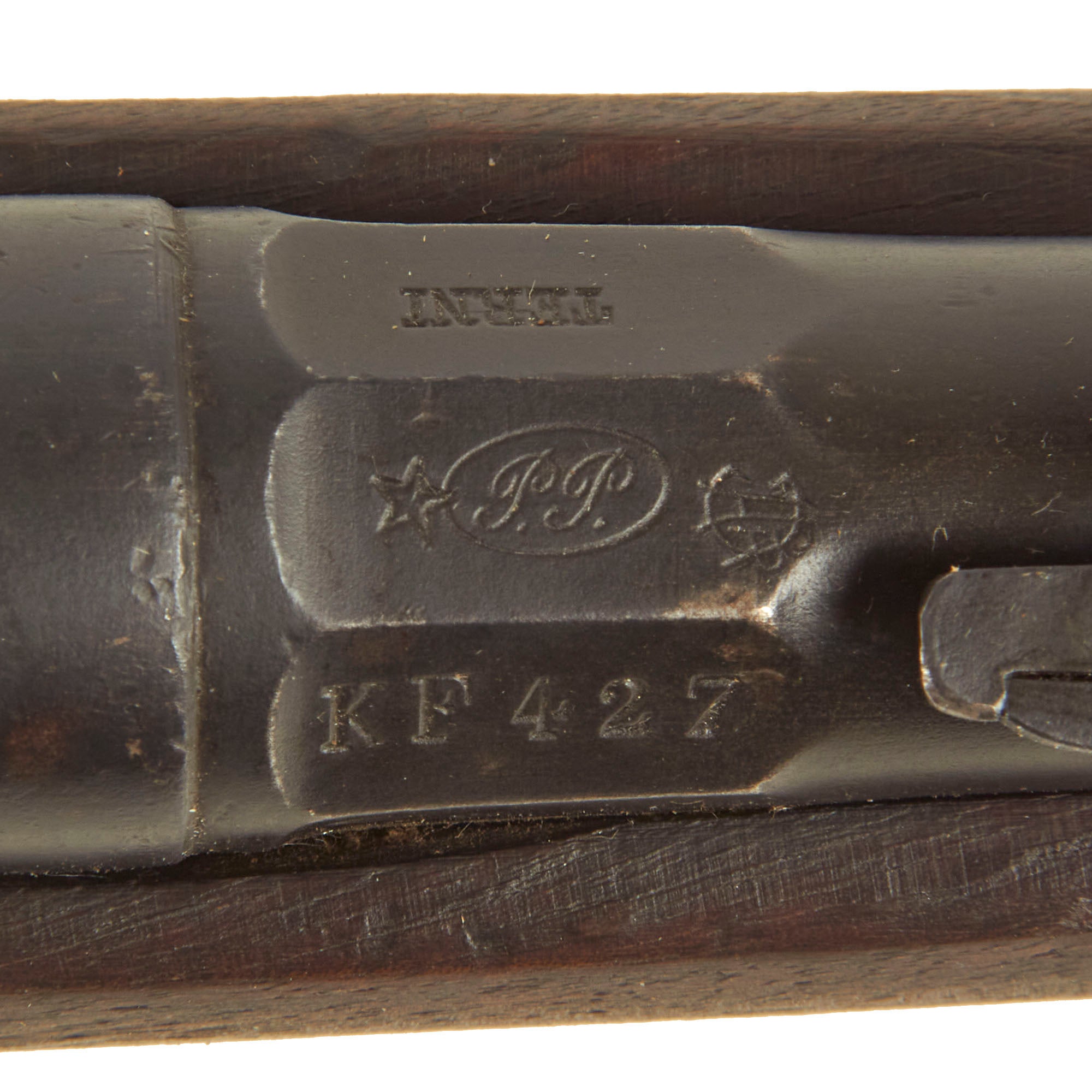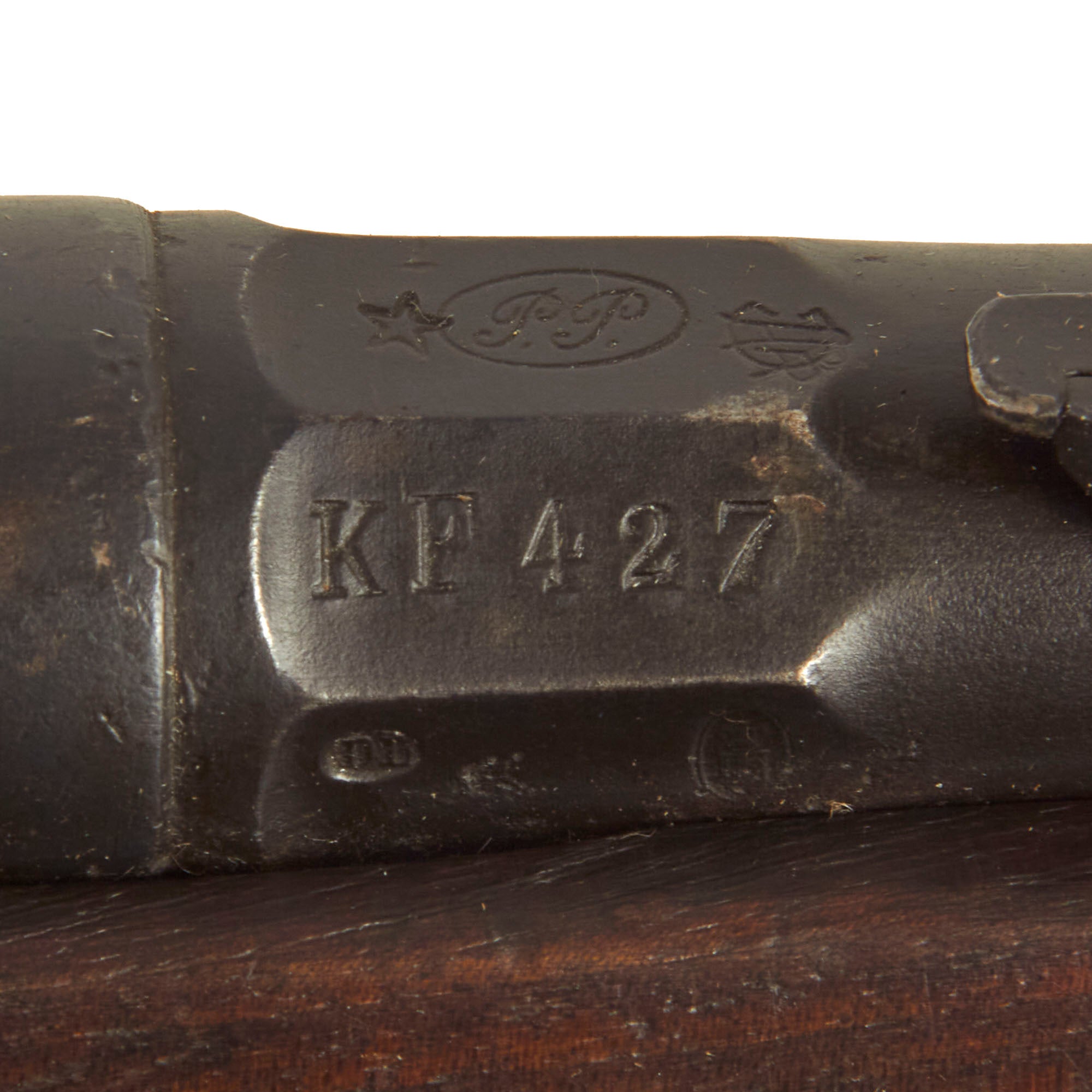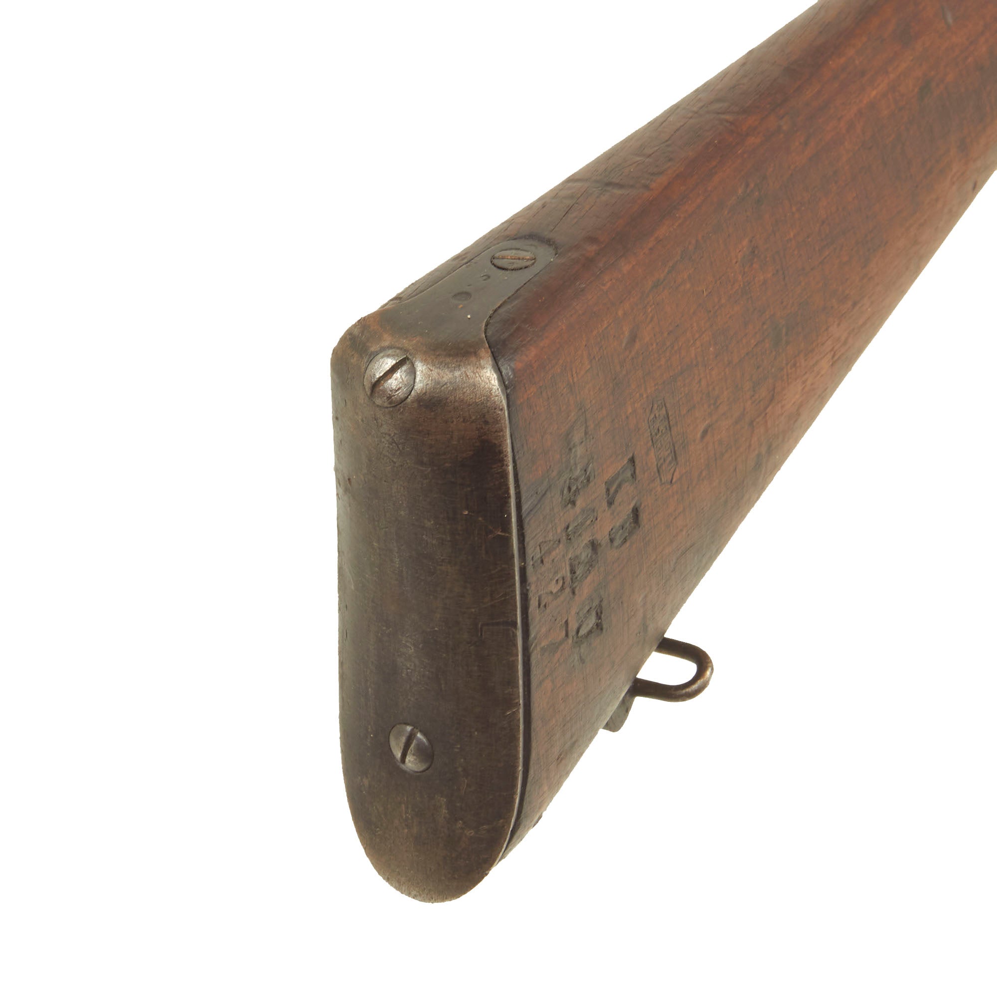 Stock is in very good condition, with the expected wear and dings from years of service. There are however no repairs we can see, or any major damage, just the replaced pieces of wood around the magazine from the conversion. There is faded arsenal roundel stamp on the left side of the butt stock, which has a date of 1917 at the bottom, most likely the date of the 6.5mm conversion. There are additional markings on the other side by the serial number.