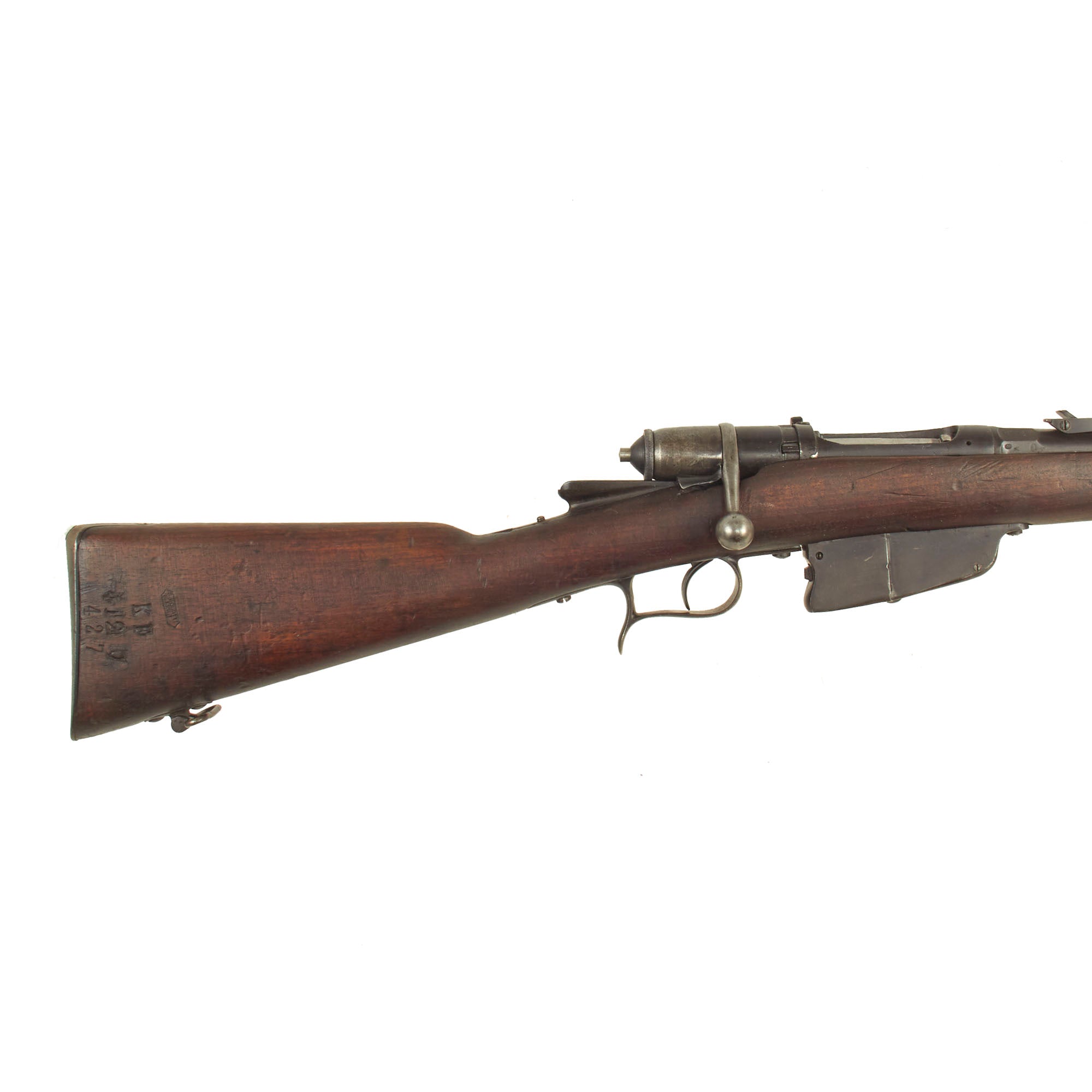 This example bears serial number KF 427 on the barrel nocks form, and is offered in very good condition. It is marked TERNI over an 1886 date on the barrel, indicating manufacture in Terni, the major city in the Terni province. This is a somewhat rare maker, and most examples we see are made in Turin or Brescia. There is a maker symbol on the top, but it is unfortunately not one that we recognize.
