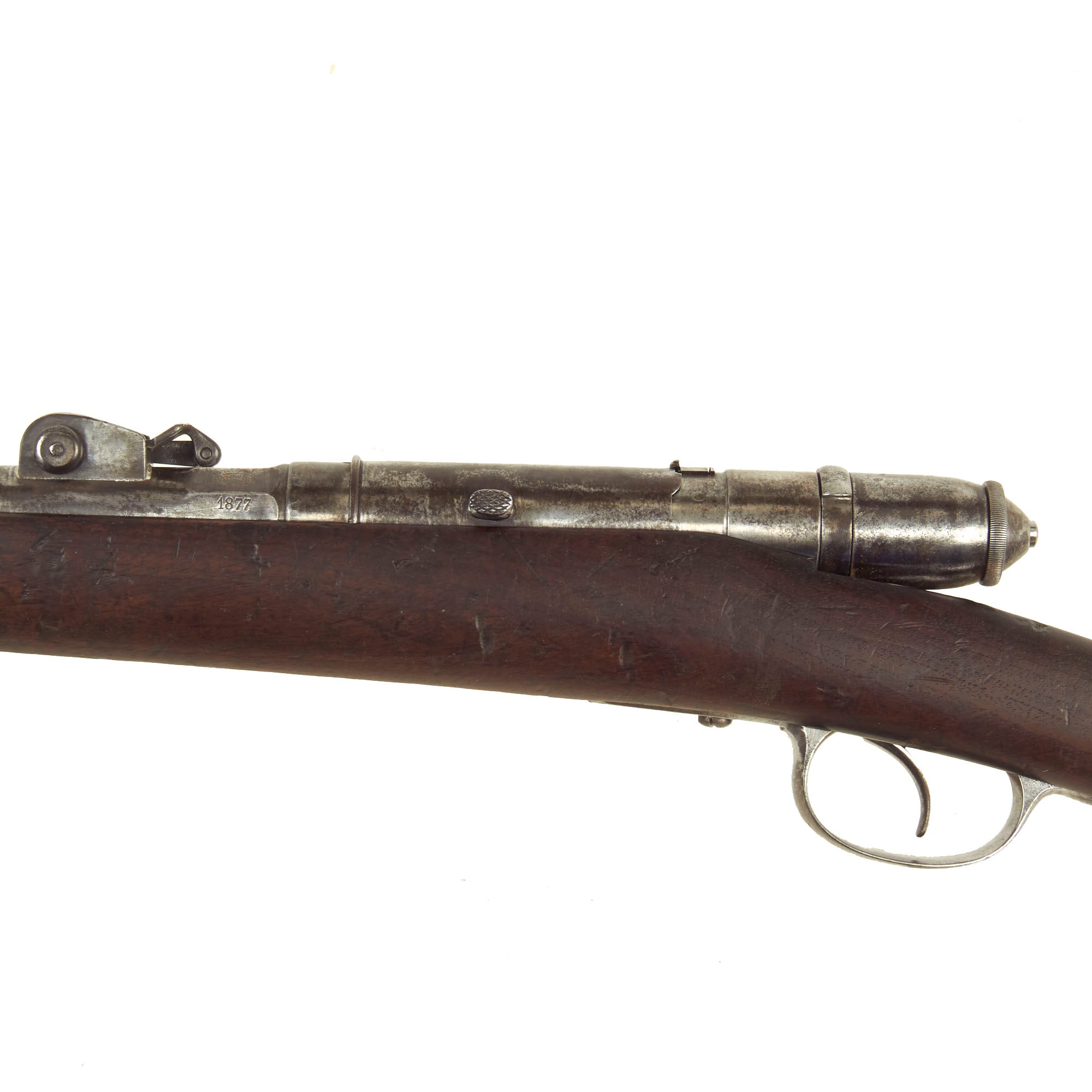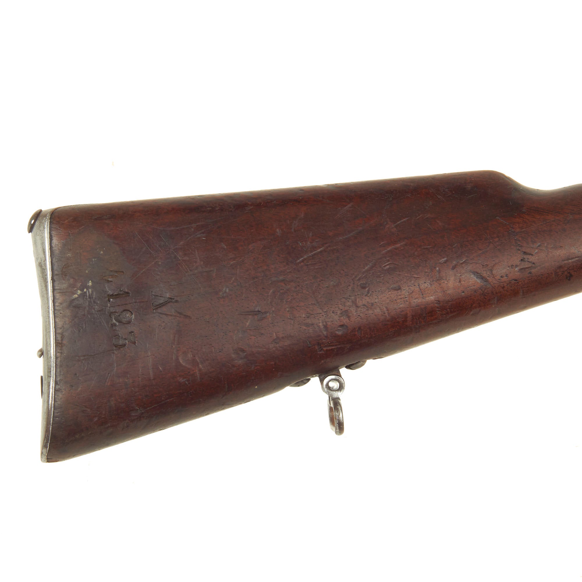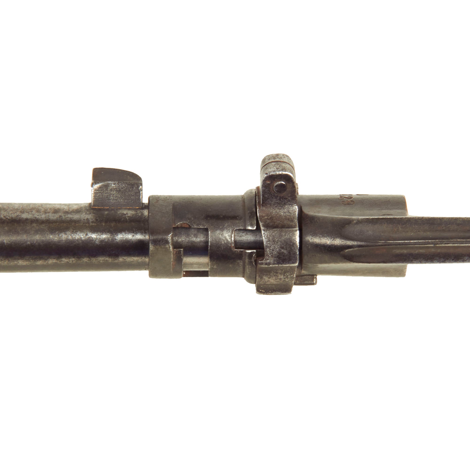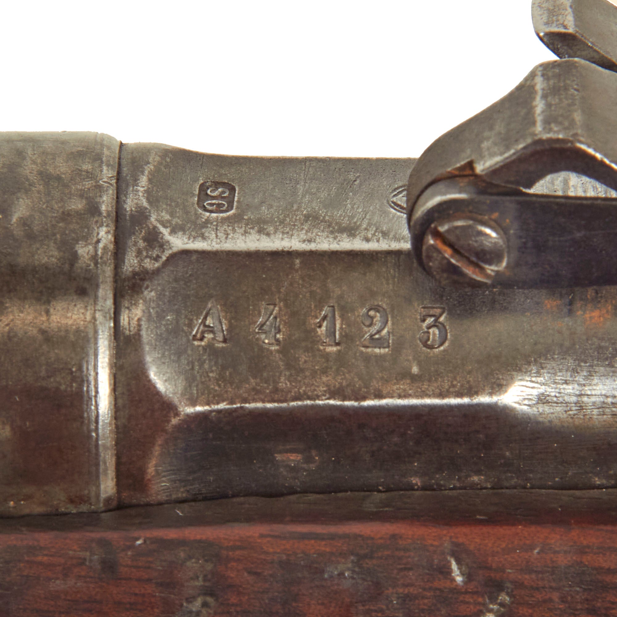 This carbine bears serial number A 4123 on the barrel knoxform and stock, and is offered in very good condition. The metalwork has a lovely polished steel patina, and it even still has the rotating dust cover for the bolt opening! It is marked TORINO in an oval over an 1877 date on the barrel, indicating manufacture at the Turin Arsenal in 1877. The stock is in very nice condition, with the serial number still crisp. Mechanically the carbine in very good condition, as is the bore. It shows clear lands and grooves and a mostly bright finish, with just a bit of oxidation in the grooves.