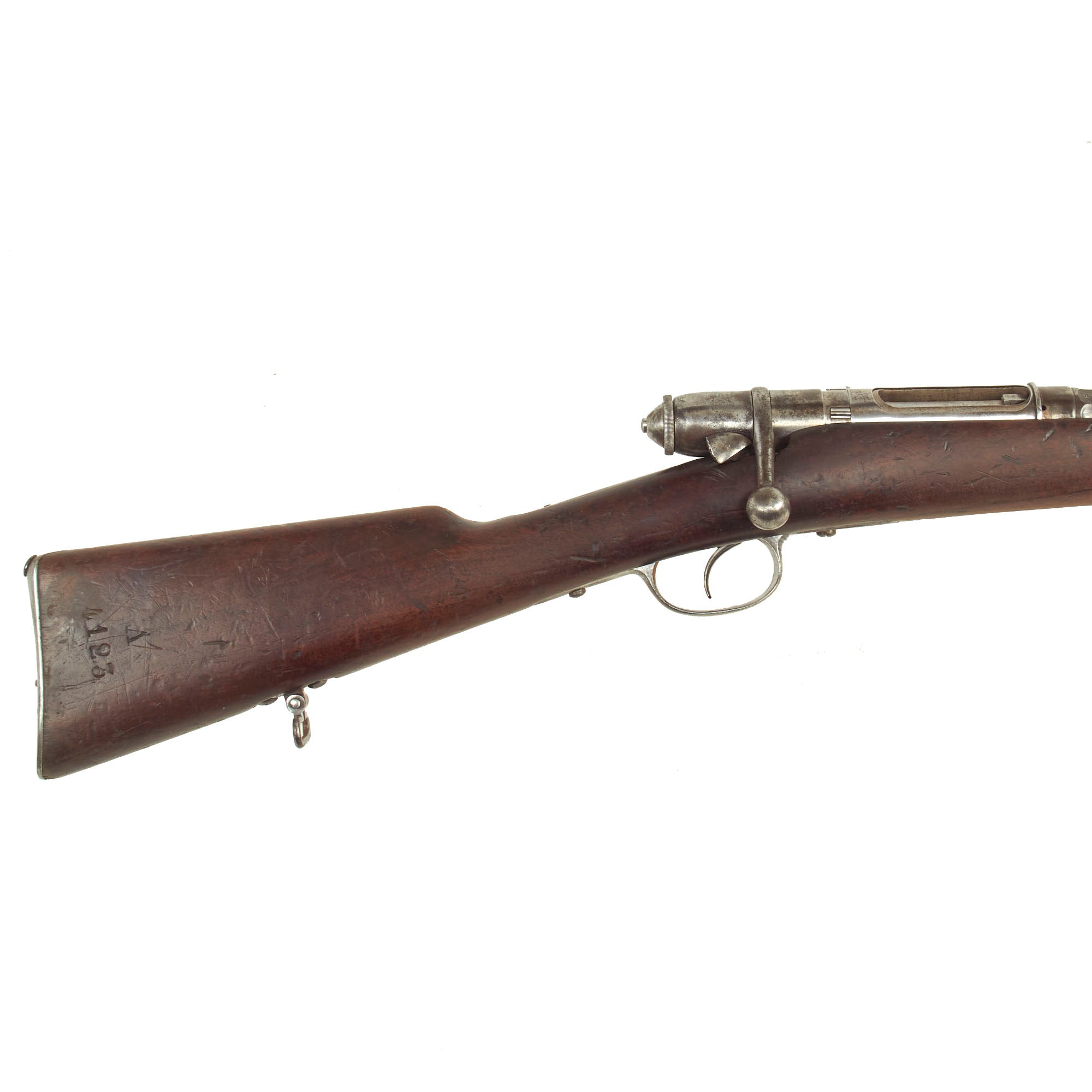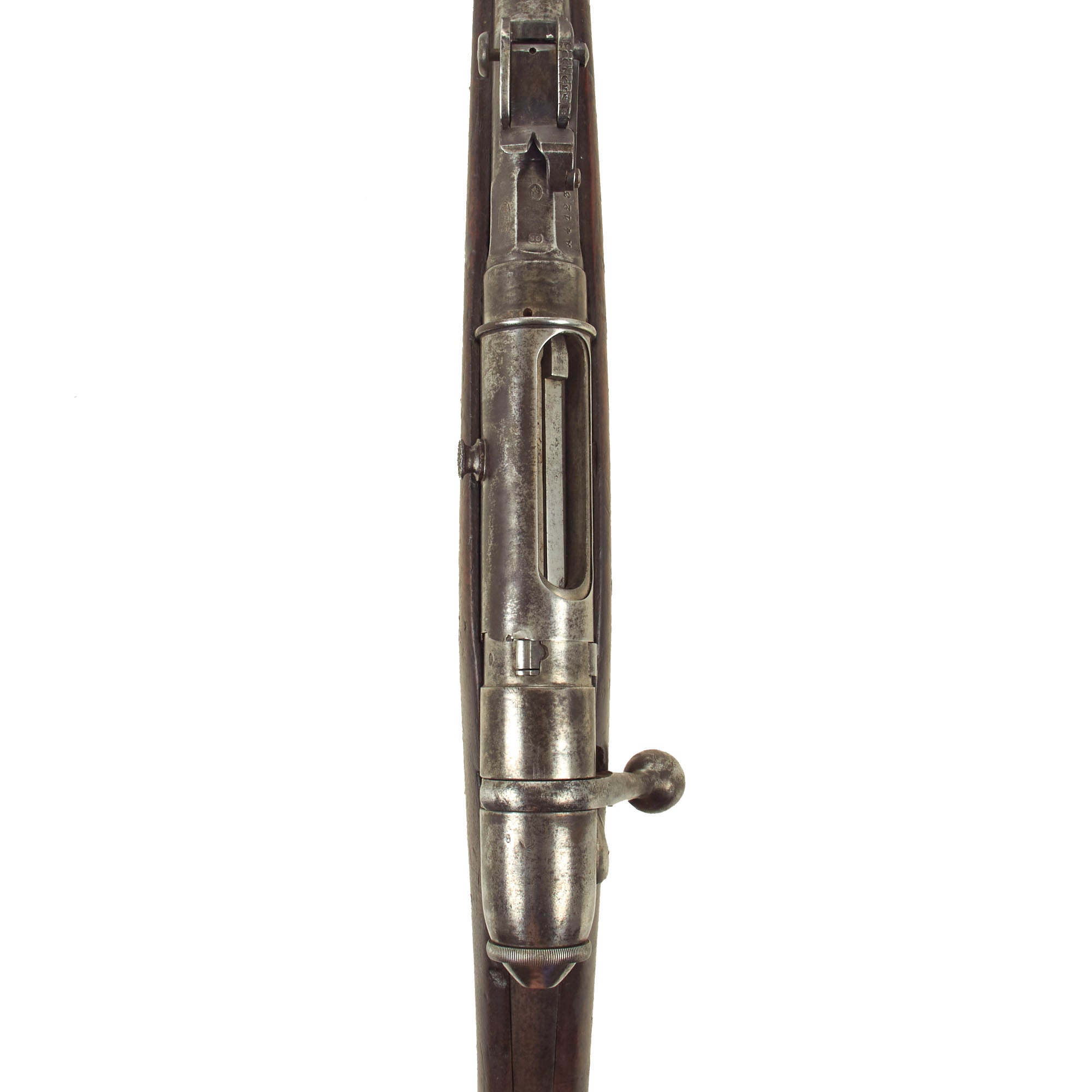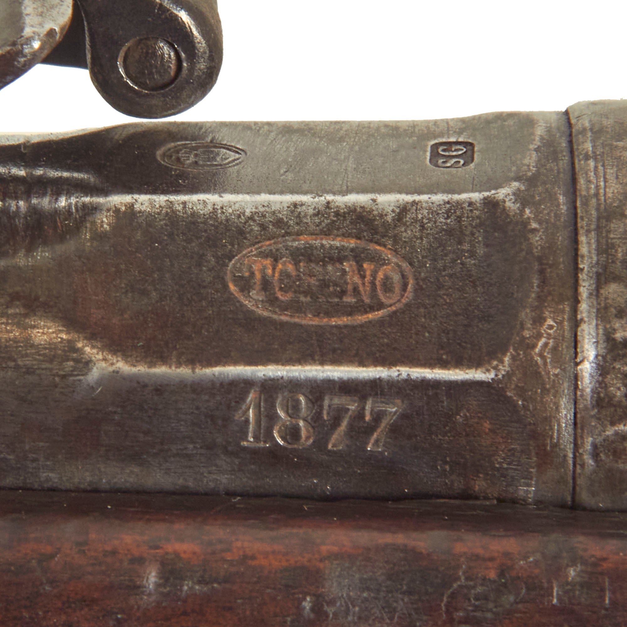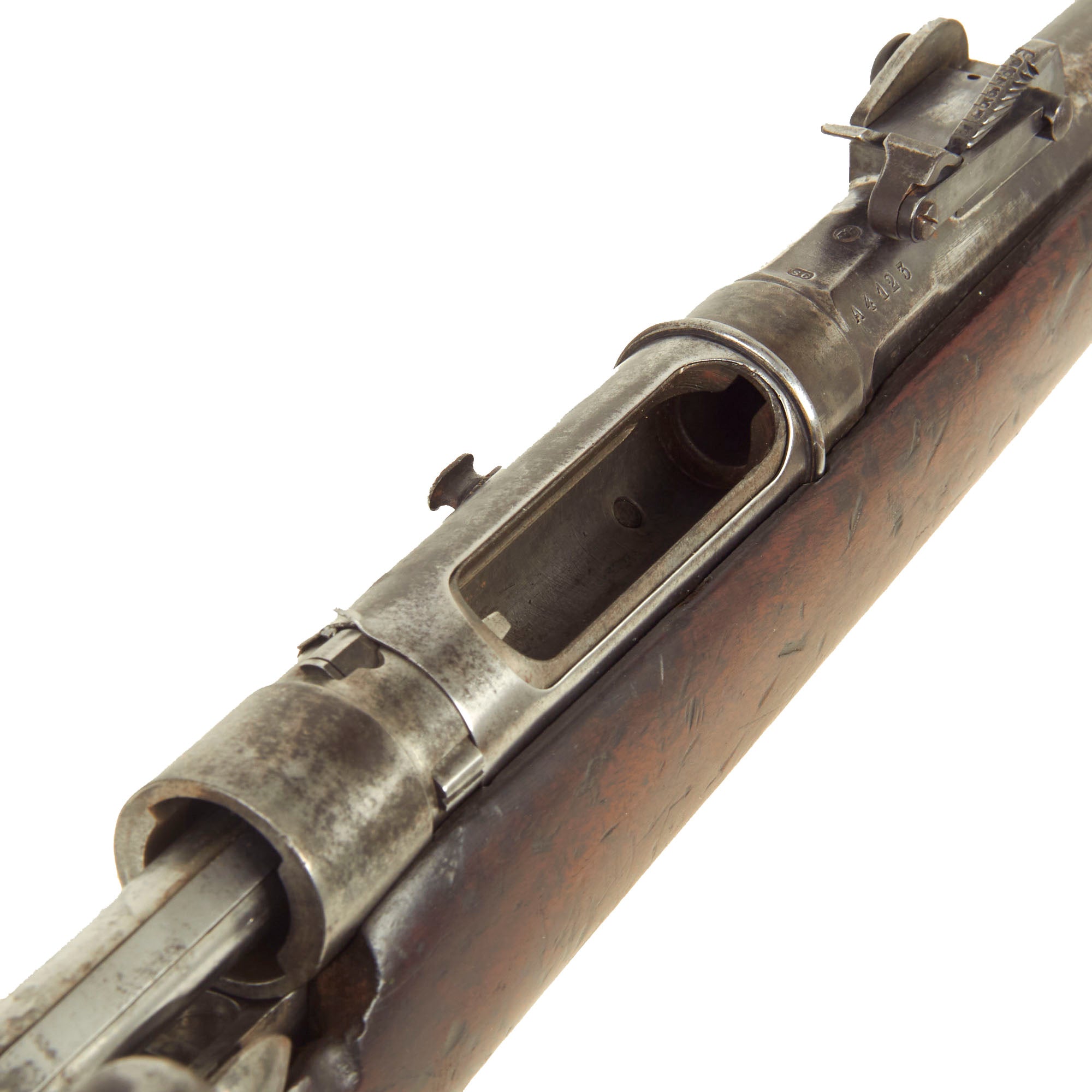 This carbine bears serial number A 4123 on the barrel knoxform and stock, and is offered in very good condition. The metalwork has a lovely polished steel patina, and it even still has the rotating dust cover for the bolt opening! It is marked TORINO in an oval over an 1877 date on the barrel, indicating manufacture at the Turin Arsenal in 1877. The stock is in very nice condition, with the serial number still crisp. Mechanically the carbine in very good condition, as is the bore. It shows clear lands and grooves and a mostly bright finish, with just a bit of oxidation in the grooves.