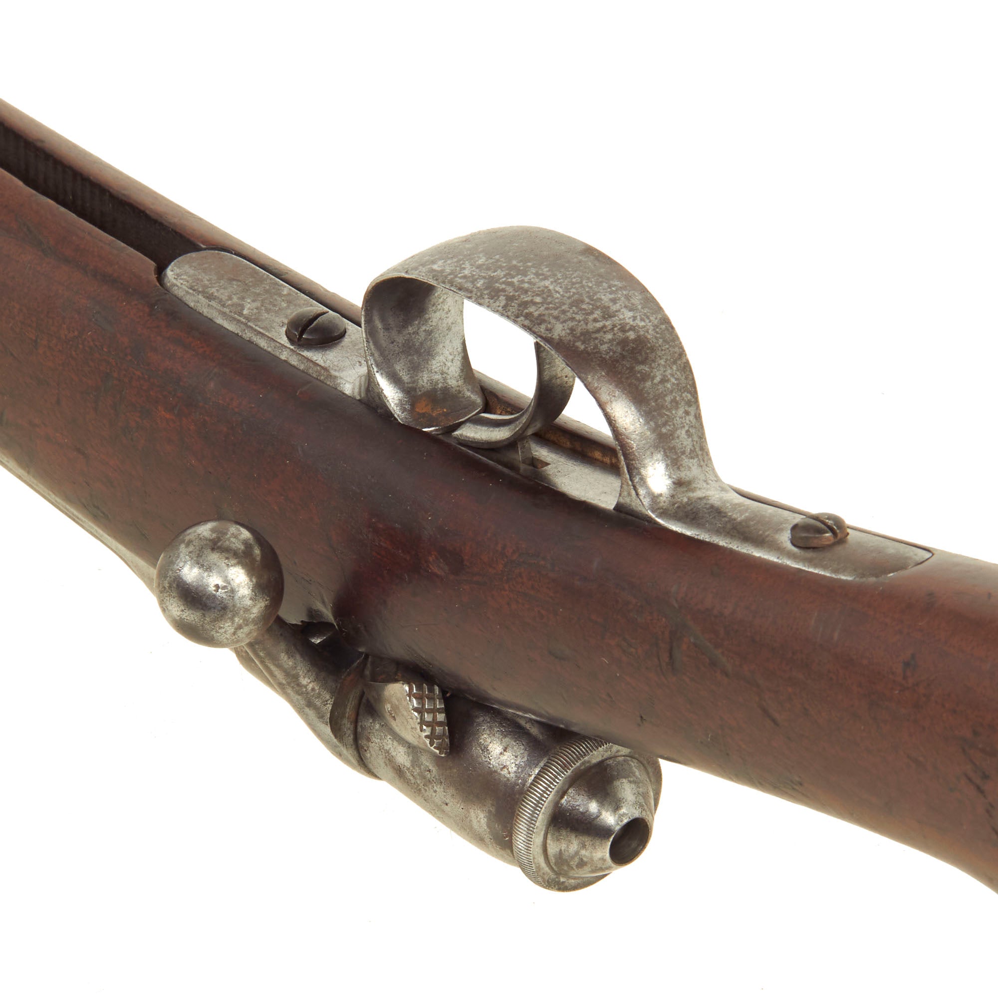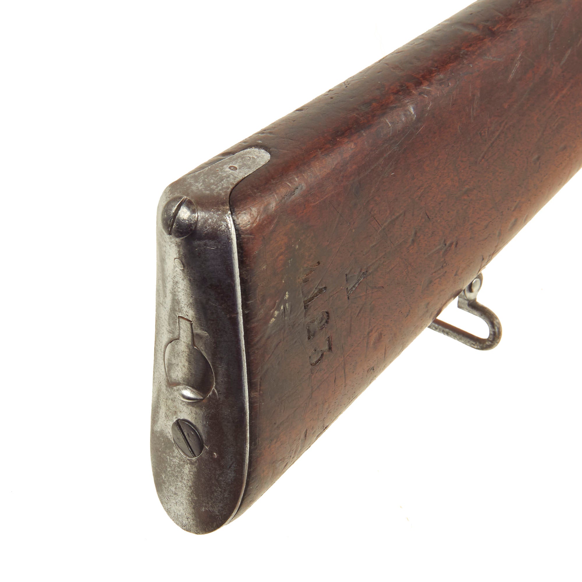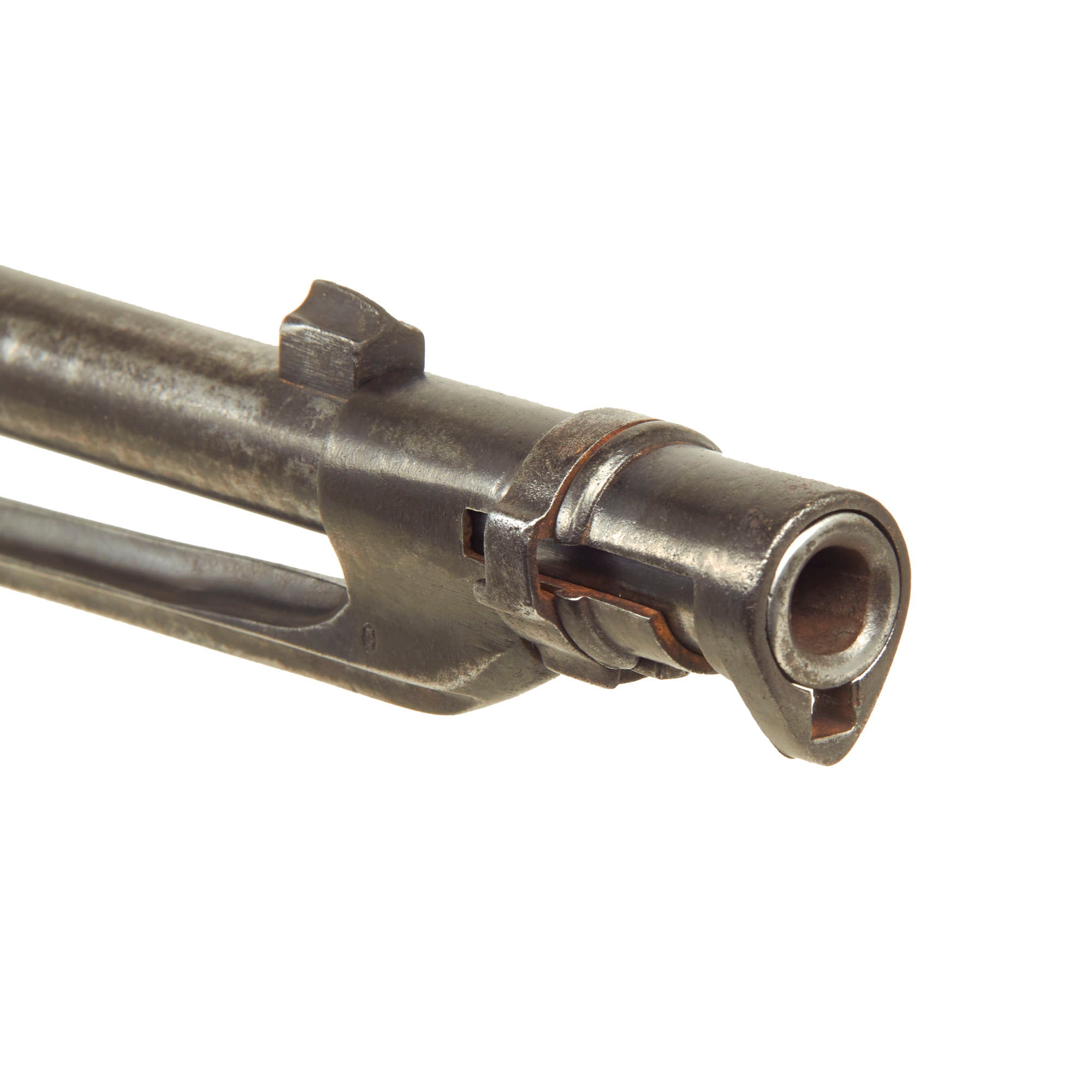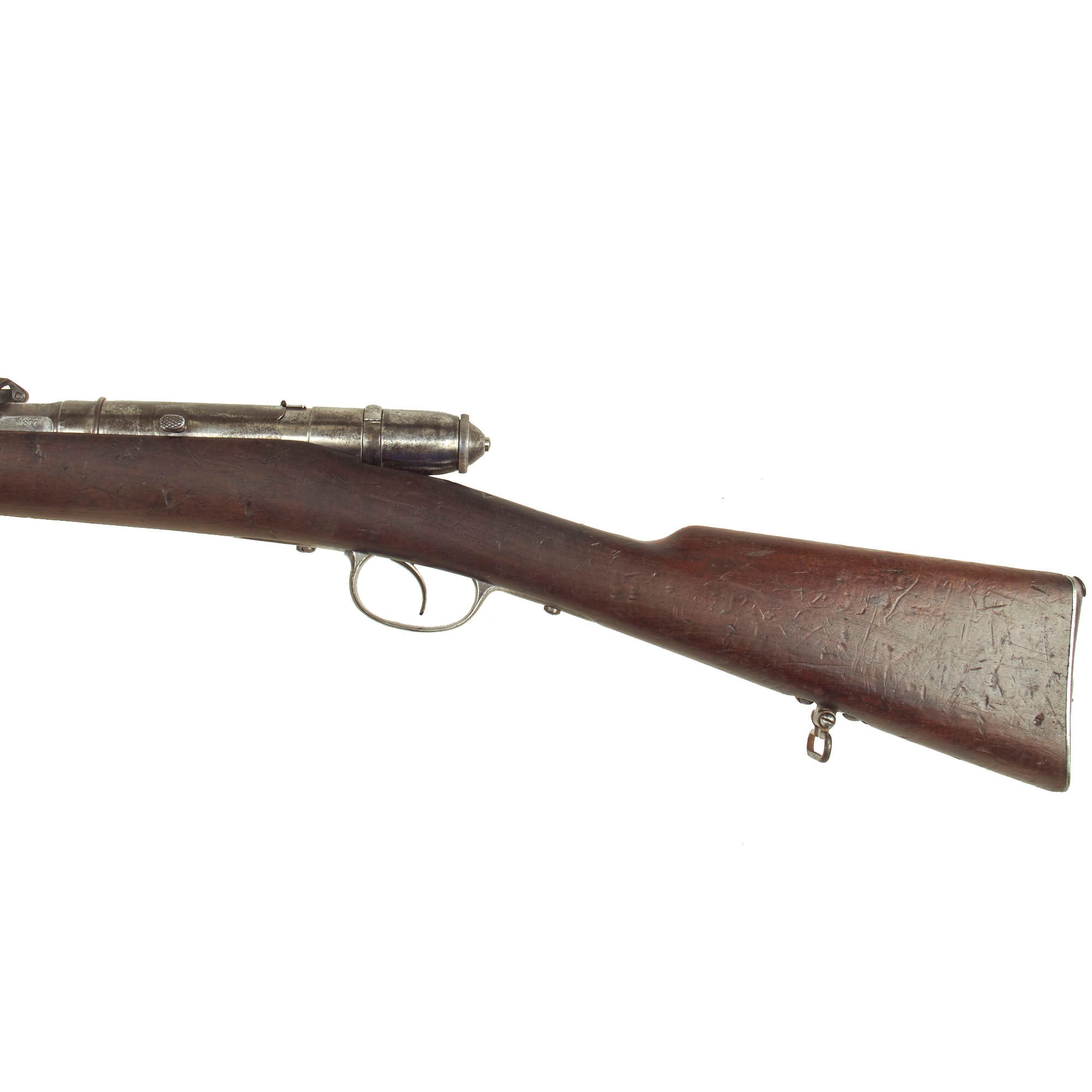 This carbine bears serial number A 4123 on the barrel knoxform and stock, and is offered in very good condition. The metalwork has a lovely polished steel patina, and it even still has the rotating dust cover for the bolt opening! It is marked TORINO in an oval over an 1877 date on the barrel, indicating manufacture at the Turin Arsenal in 1877. The stock is in very nice condition, with the serial number still crisp. Mechanically the carbine in very good condition, as is the bore. It shows clear lands and grooves and a mostly bright finish, with just a bit of oxidation in the grooves.