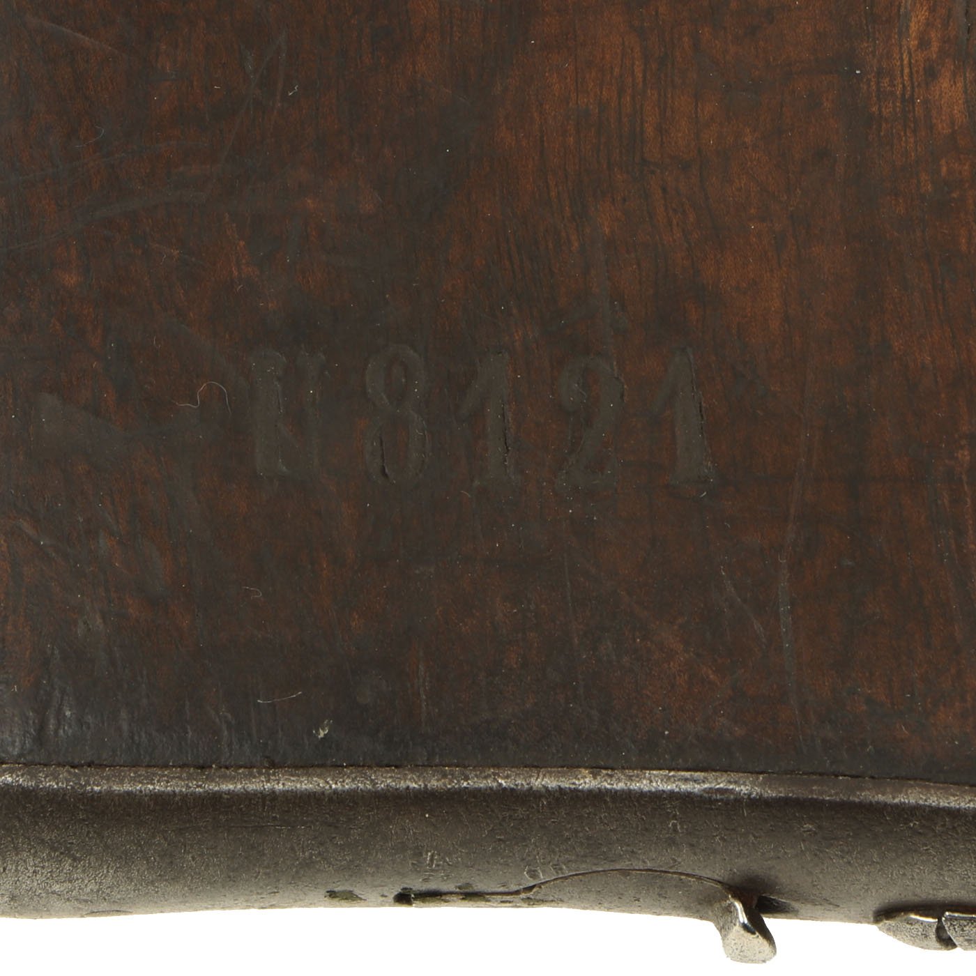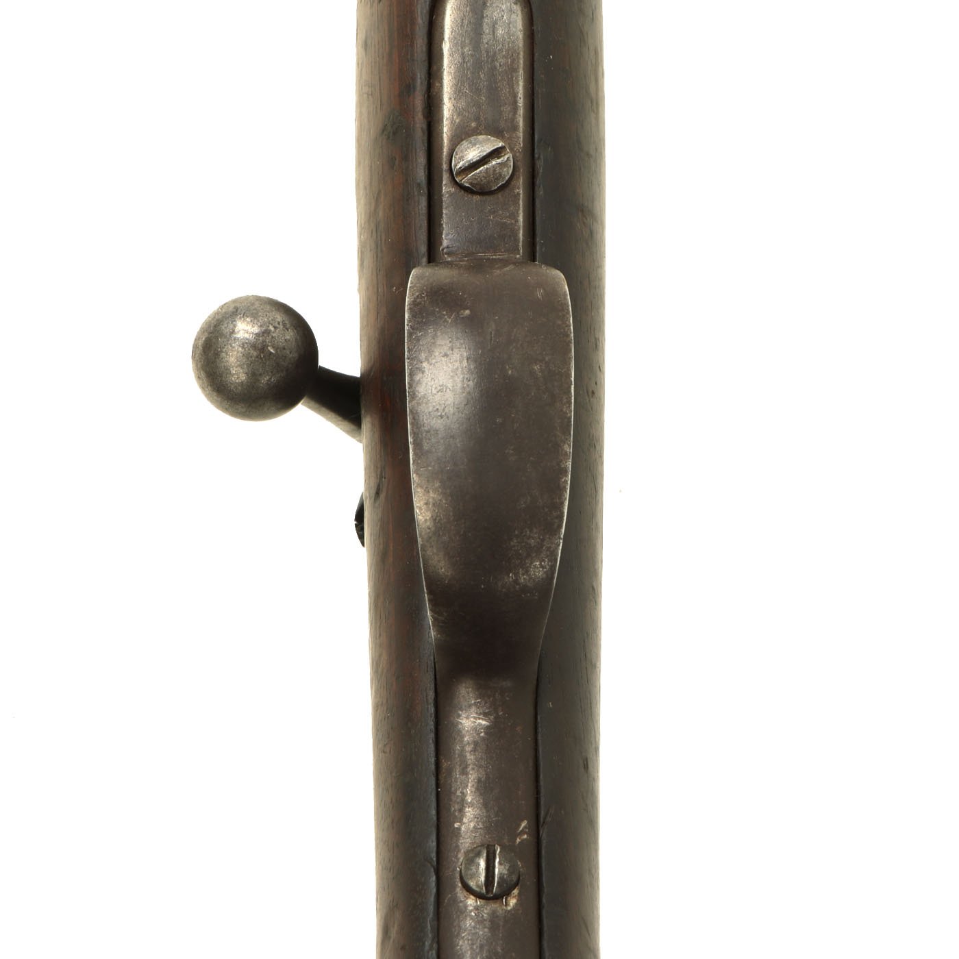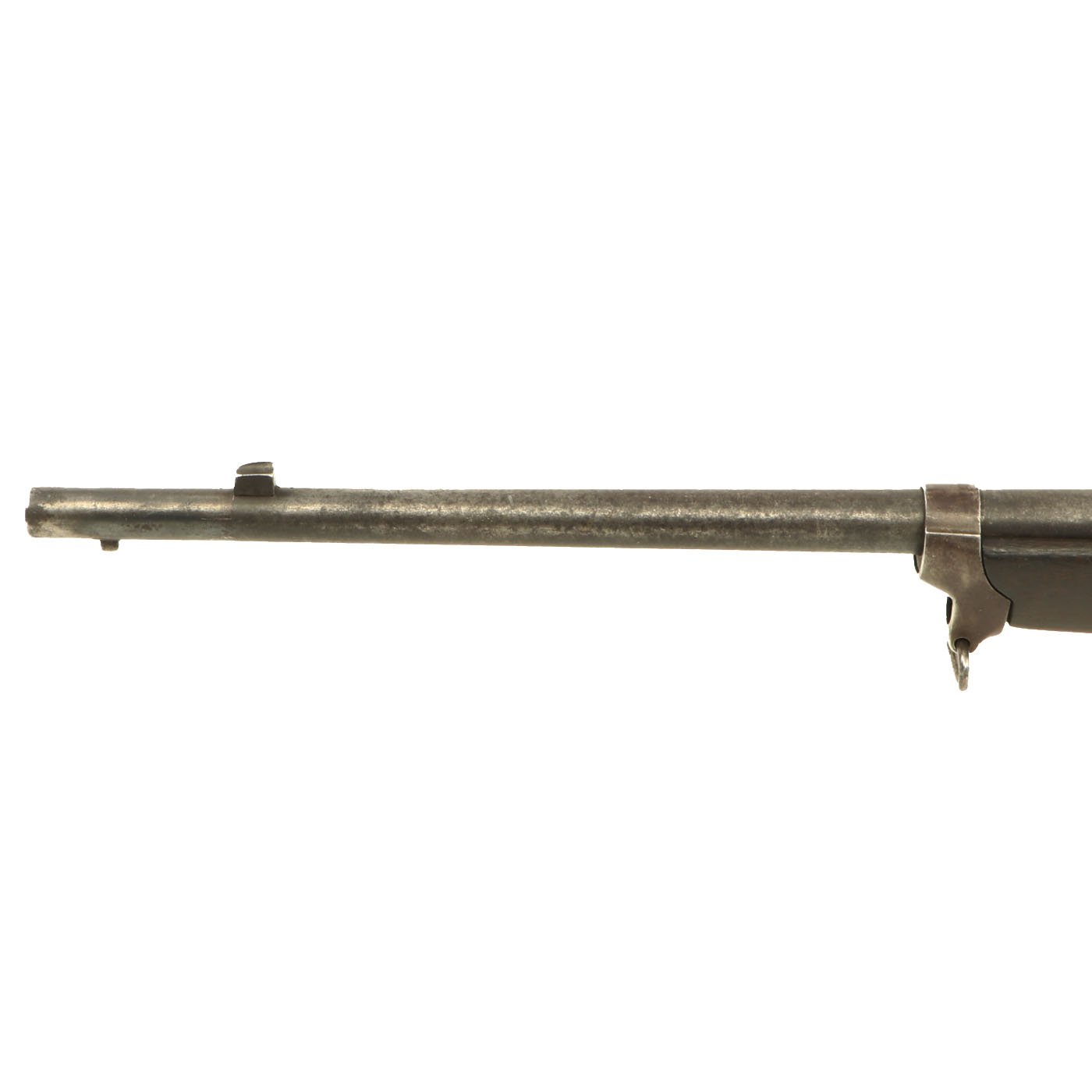 The interesting feature of the 1870 Carbine is that it was issued with a rather long socket bayonet, intended to give the trooper reach when confronted with a Cavalryman. This bayonet is stored by being reversed on the barrel front and pointed backward when not in use, as there was a purpose built slot in the carbine's fore stock to accept the blade of the socket bayonet. Finding a carbine still with the bayonet is exceedingly rare, and unfortunately this example has lost the bayonet, as well as the rear sight, which apparently was knocked off at some point.