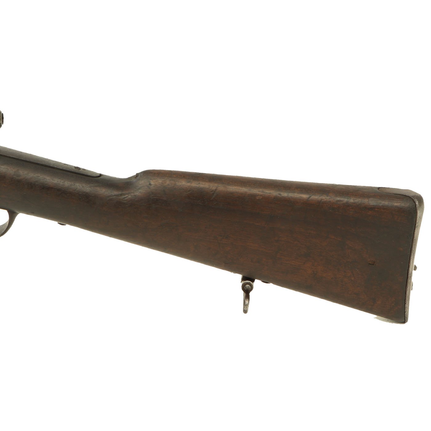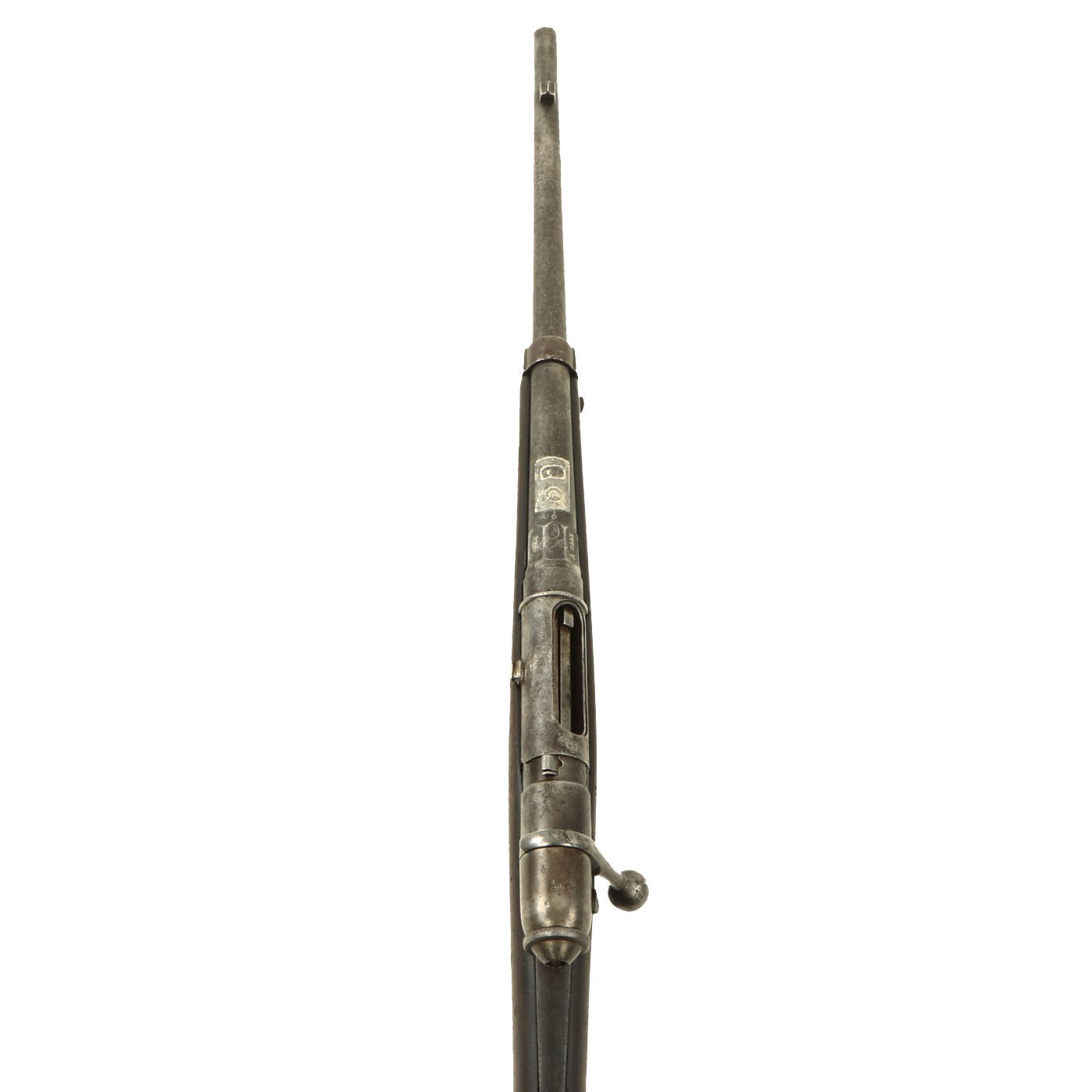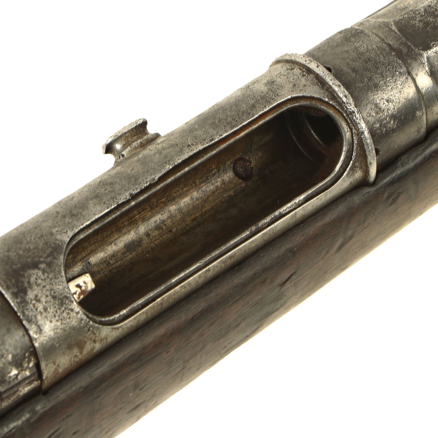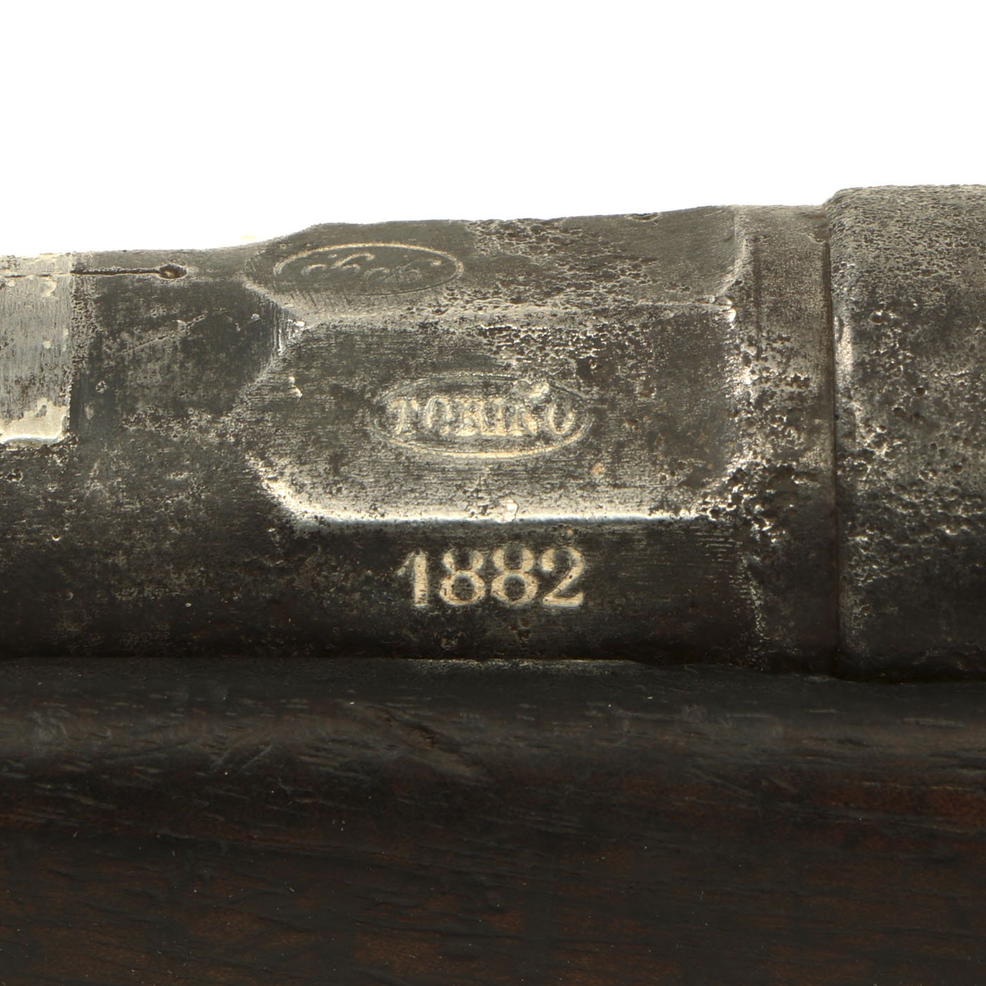 This carbine bears serial number A 8553 on the barrel knoxform and stock, and is offered in good condition. The metalwork has a lovely lightly oxidized patina, and it even still has the rotating dust cover for the bolt opening, though it is quite difficult to move. It is marked TORINO in an oval over an 1882 date on the barrel, indicating manufacture at the Turin Arsenal in 1882. The stock is in very nice condition, though it looks like most of the markings have been worn off, except for a non-matching serial number U8121. Mechanically the carbine in good condition, as is the bore. It shows clear lands and grooves and a partly bright finish, with some wear and oxidation.