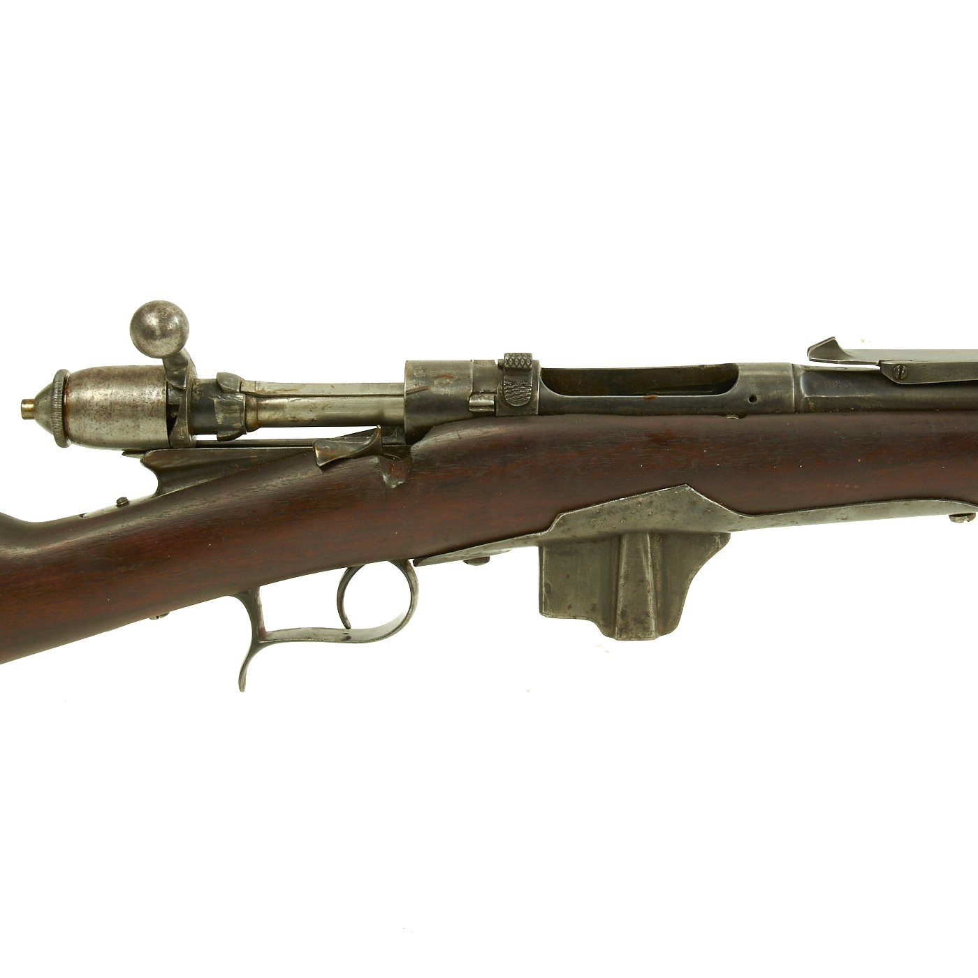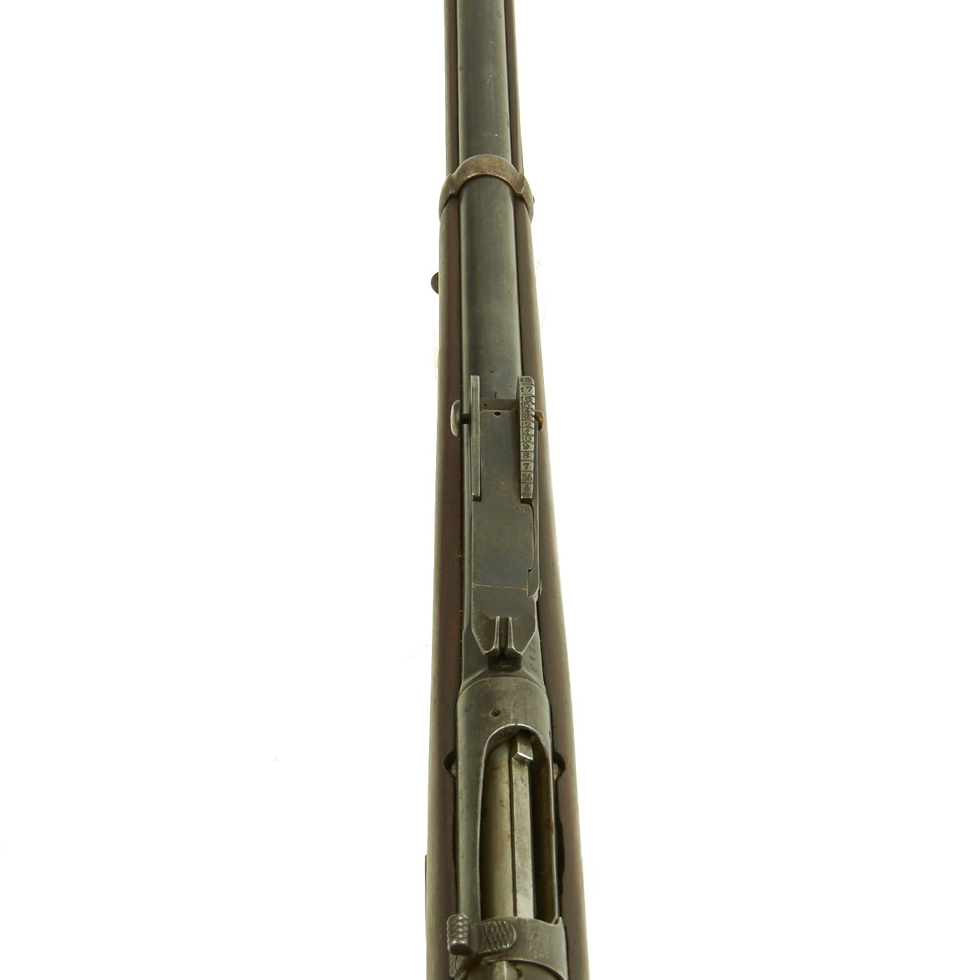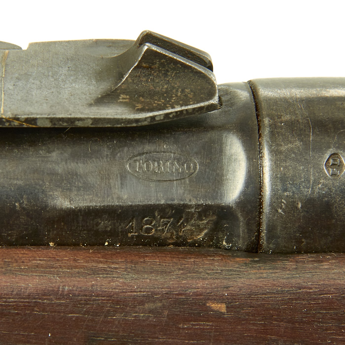 This example bears serial number AF 192 on the barrel nocks form, and is offered in very good condition. It is marked TORINO in an oval over an 1871 date on the barrel, indicating manufacture at the Turin Arsenal in 1871, only the second year of production for this model. It also has markings on top of the nocks form, but we cannot make them out. The stock has been reconditioned at arsenal, which has unfortunately made the markings on the stock faint, but we do not think the serial number is matching.