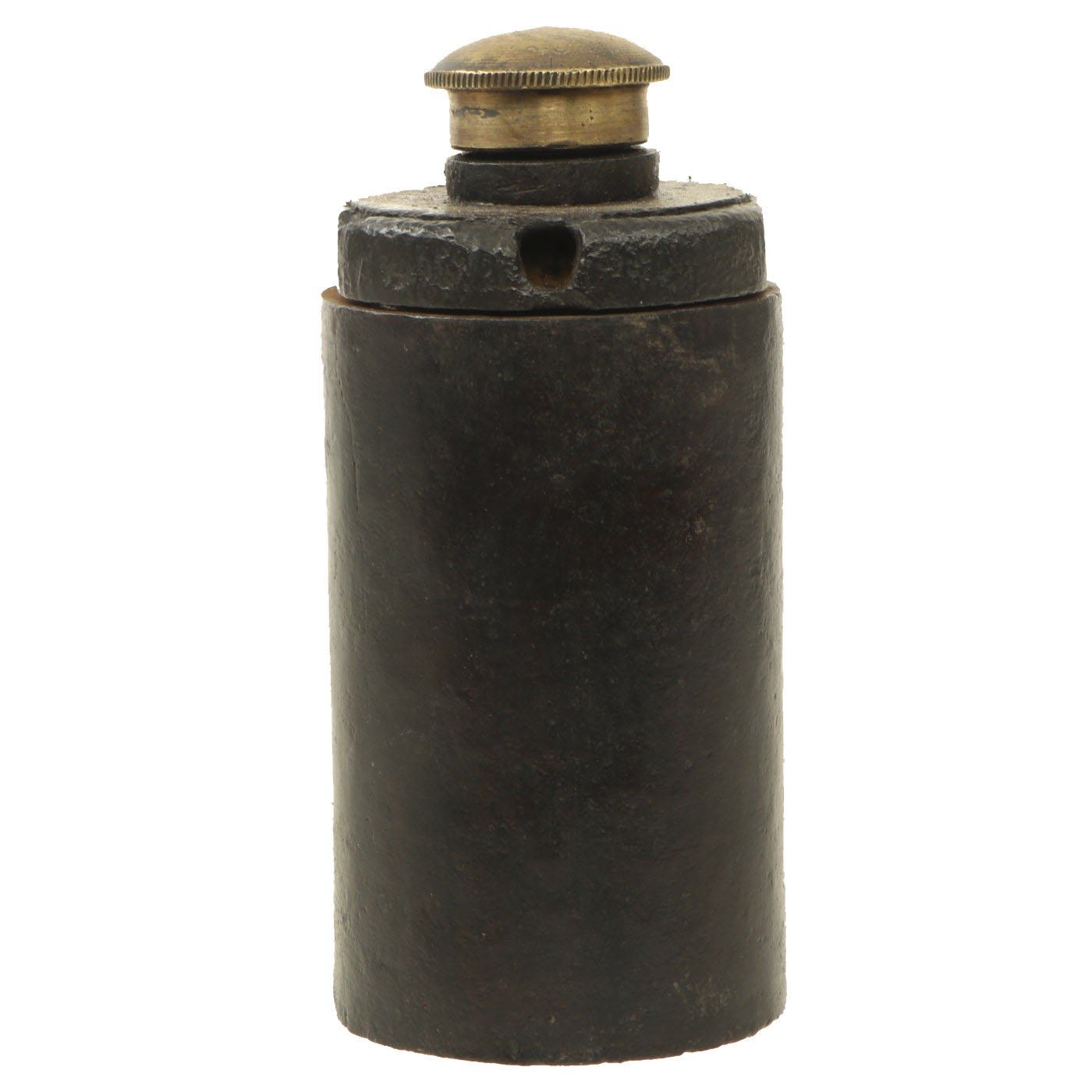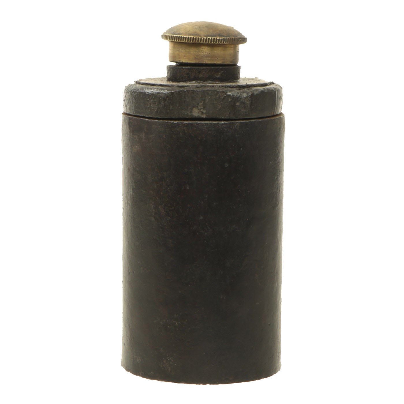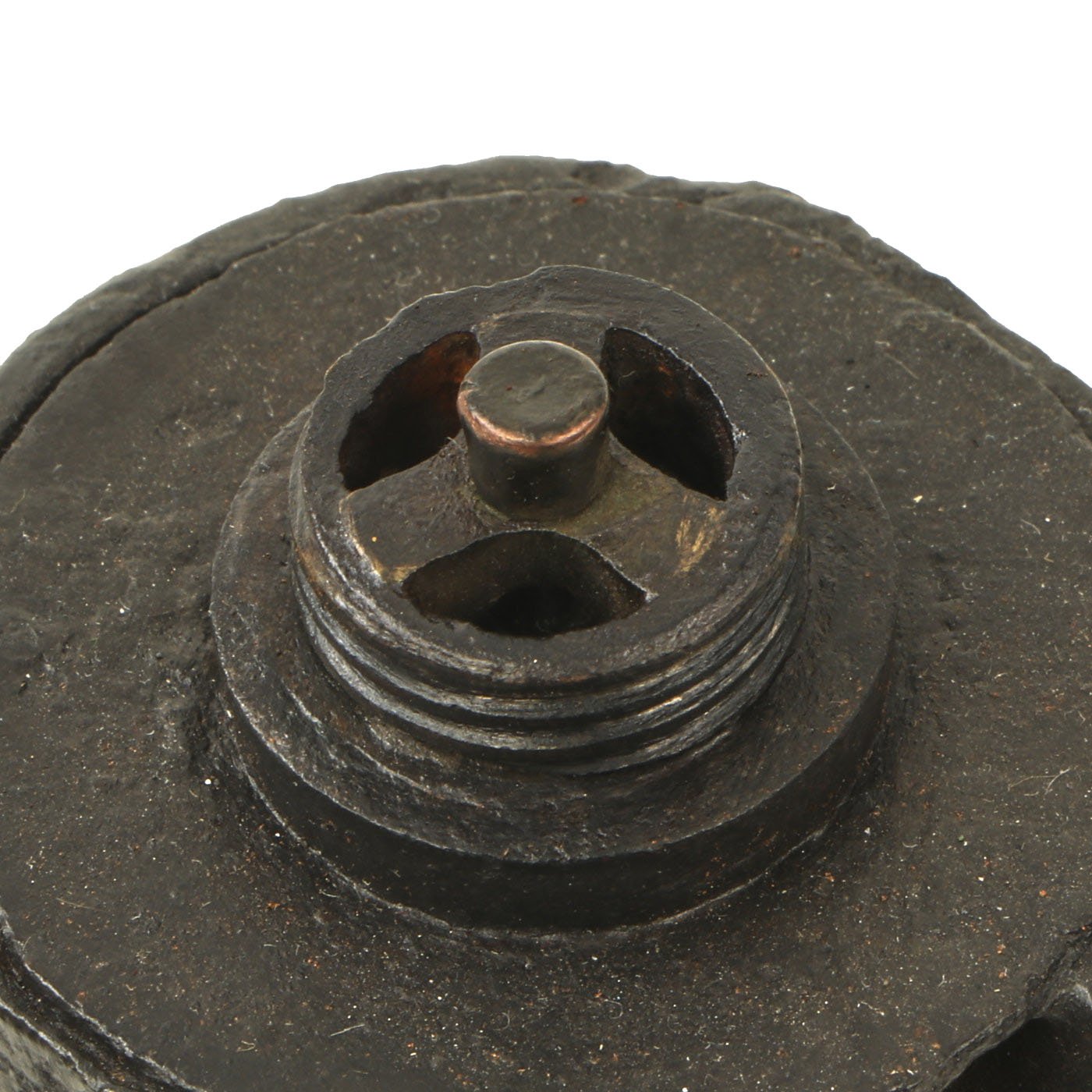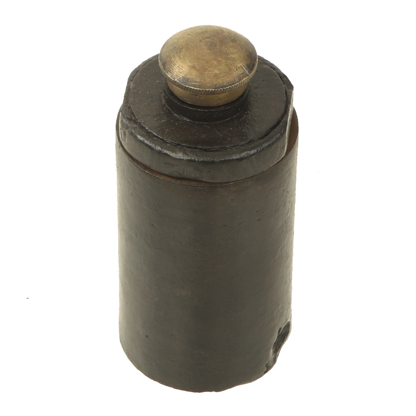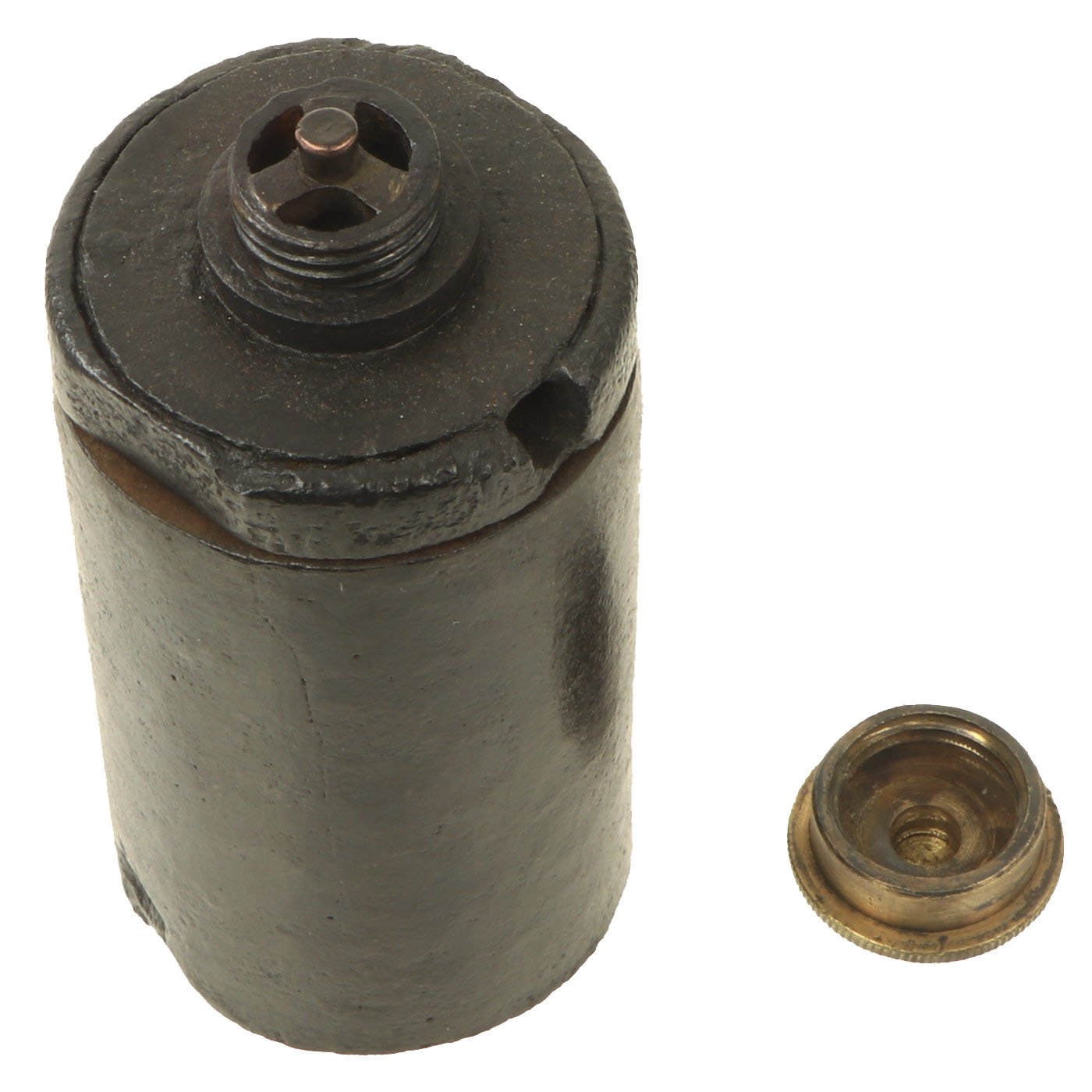 This example is in great shape, with the original Brass fuse cover, which still unscrews to show the internal fuze structure. The top of the grenade also unscrews to show the inside of the body. The internals are a bit rusty, due to age and also reactions from the explosives and propellant. Some of the original fuze wick can still be seen.