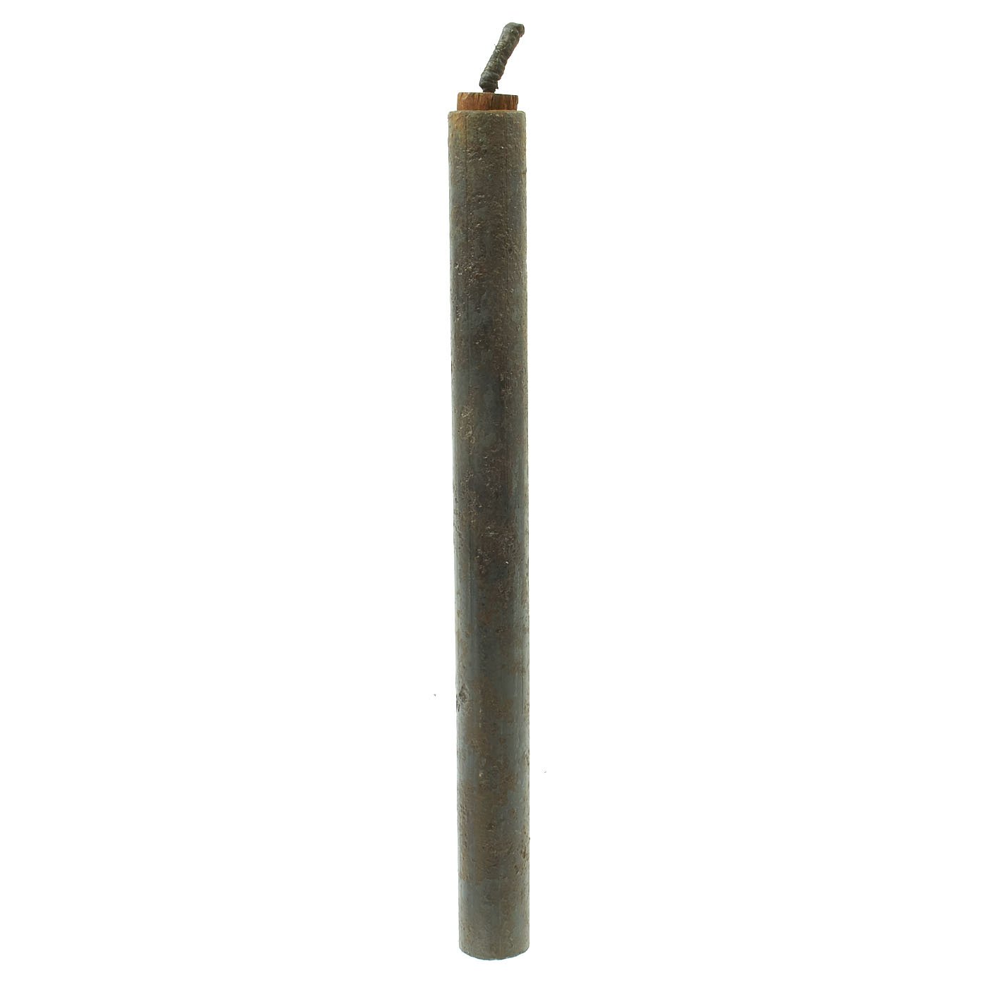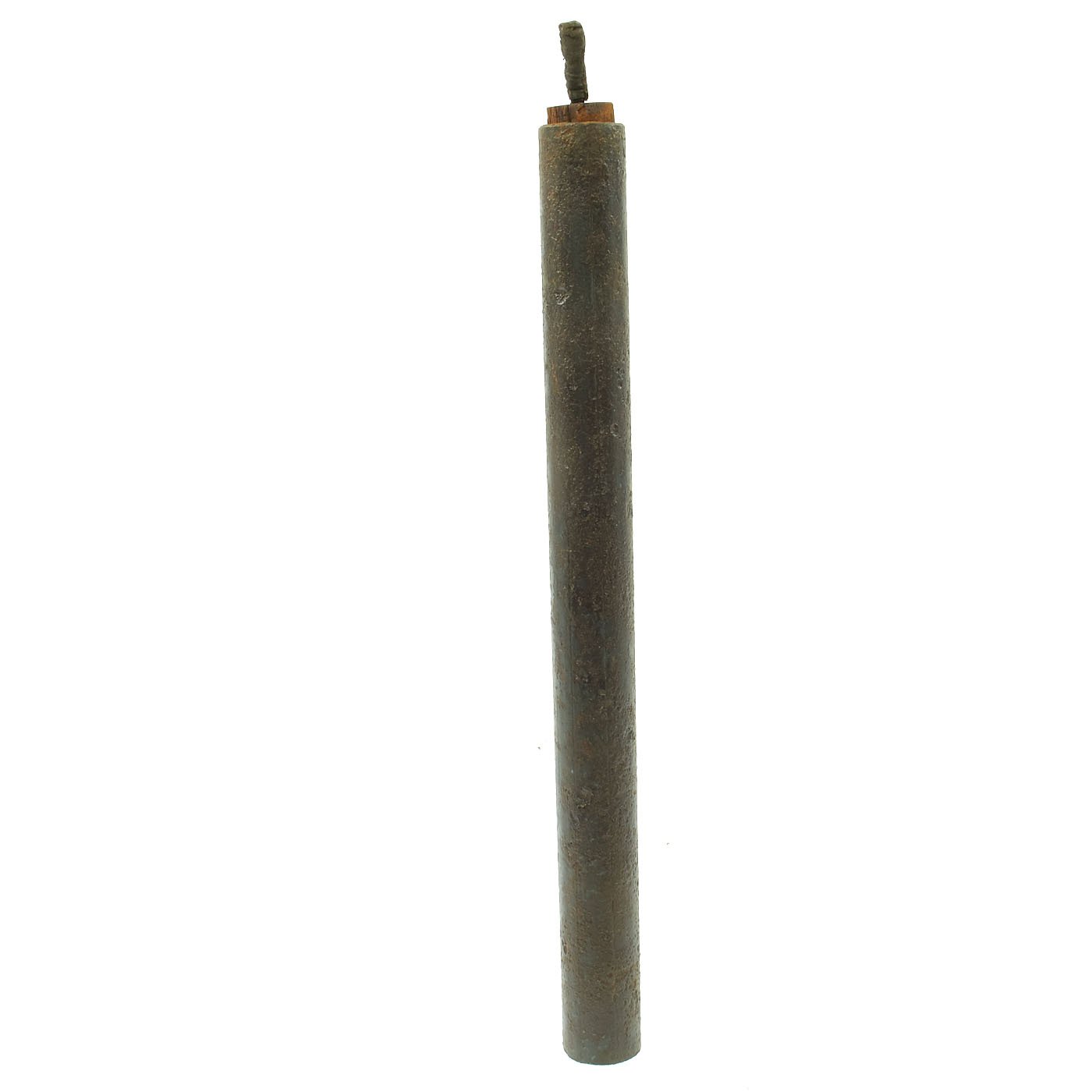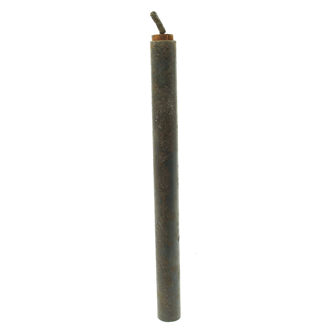 The construction is relatively simple, as it is pretty much a steel pipe with wooden end plugs, one of which still has part of the original fuse. Originally blued steel, it now has a lot of light surface rust, but it is still solid.