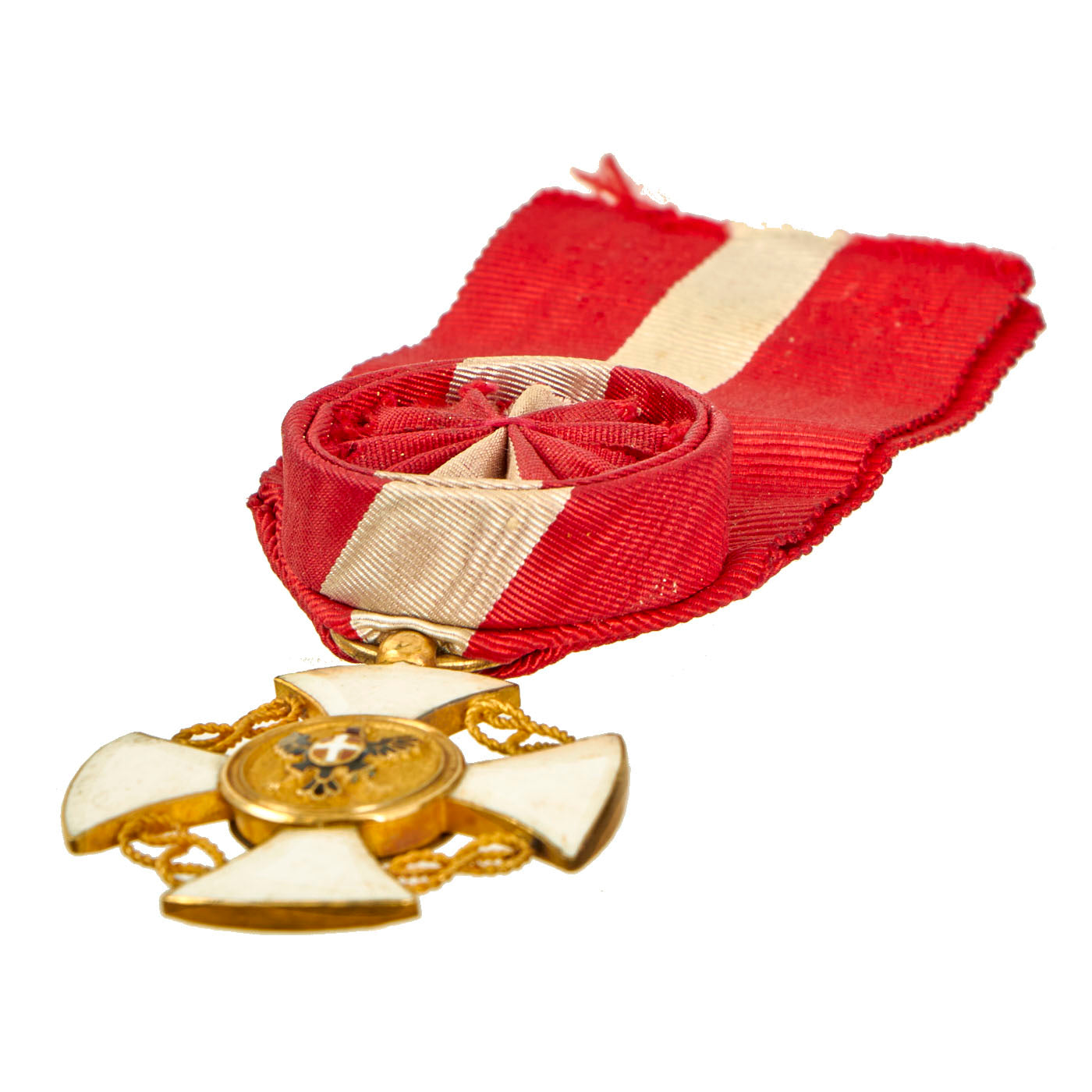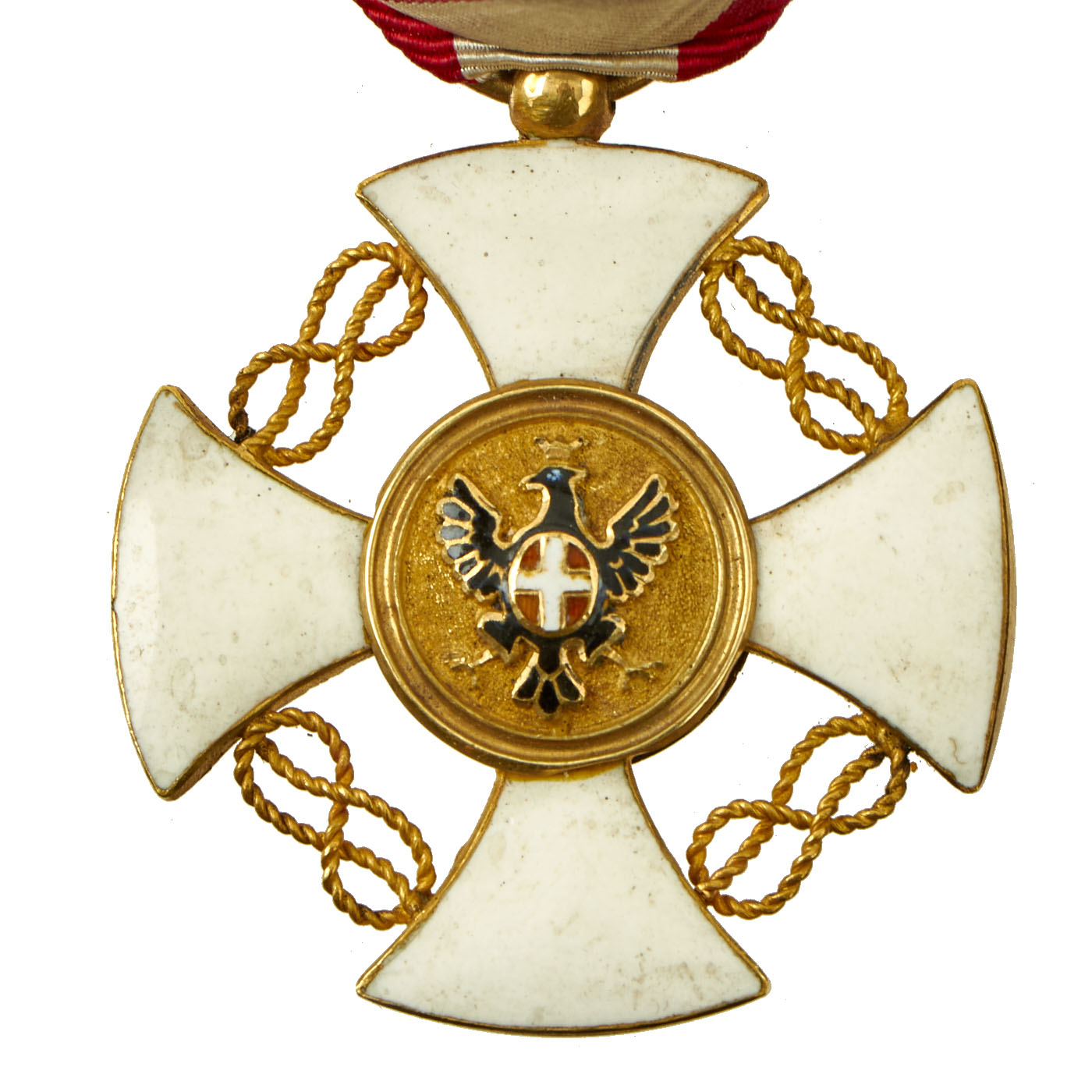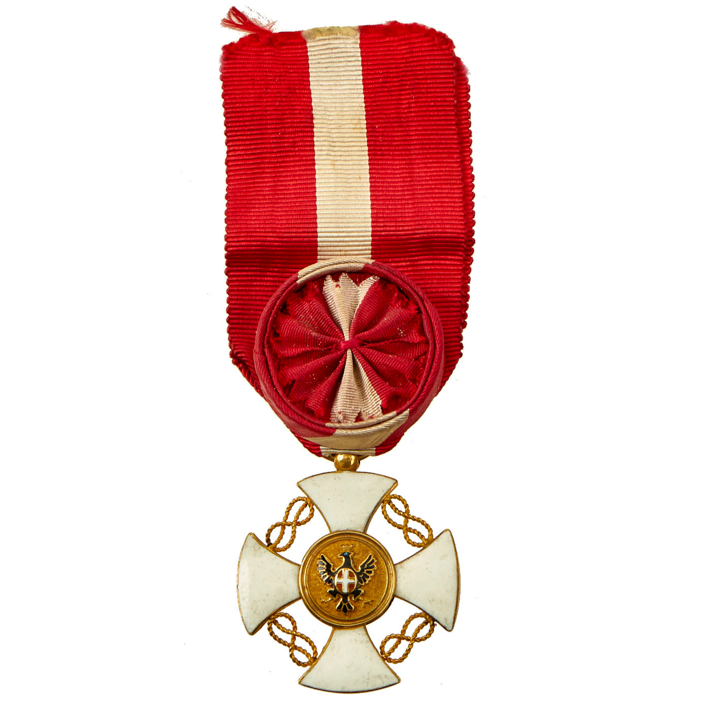 The badge of the order is a gilt cross with curved edges, enameled in white, with the so-called Savoy knots between the arms of the cross. The obverse central disc features the Iron Crown of Lombardy (as appeared on the Austrian Order of the Iron Crown) on a blue enamel background. The reverse central disc has a black-enameled eagle bearing the Savoy cross on a golden background. The ribbon of the order is all red with a ⅜” white vertical stripe. The rosette featured on the ribbon is present for having been awarded to an Officer.
