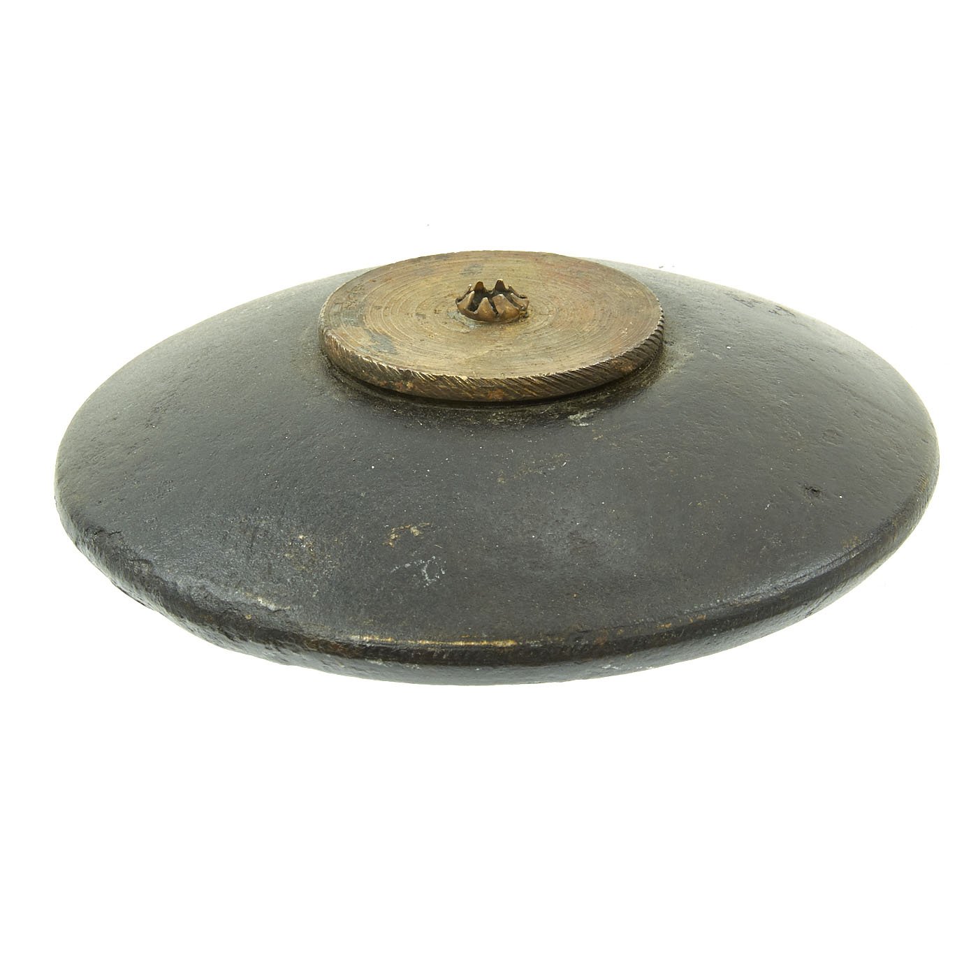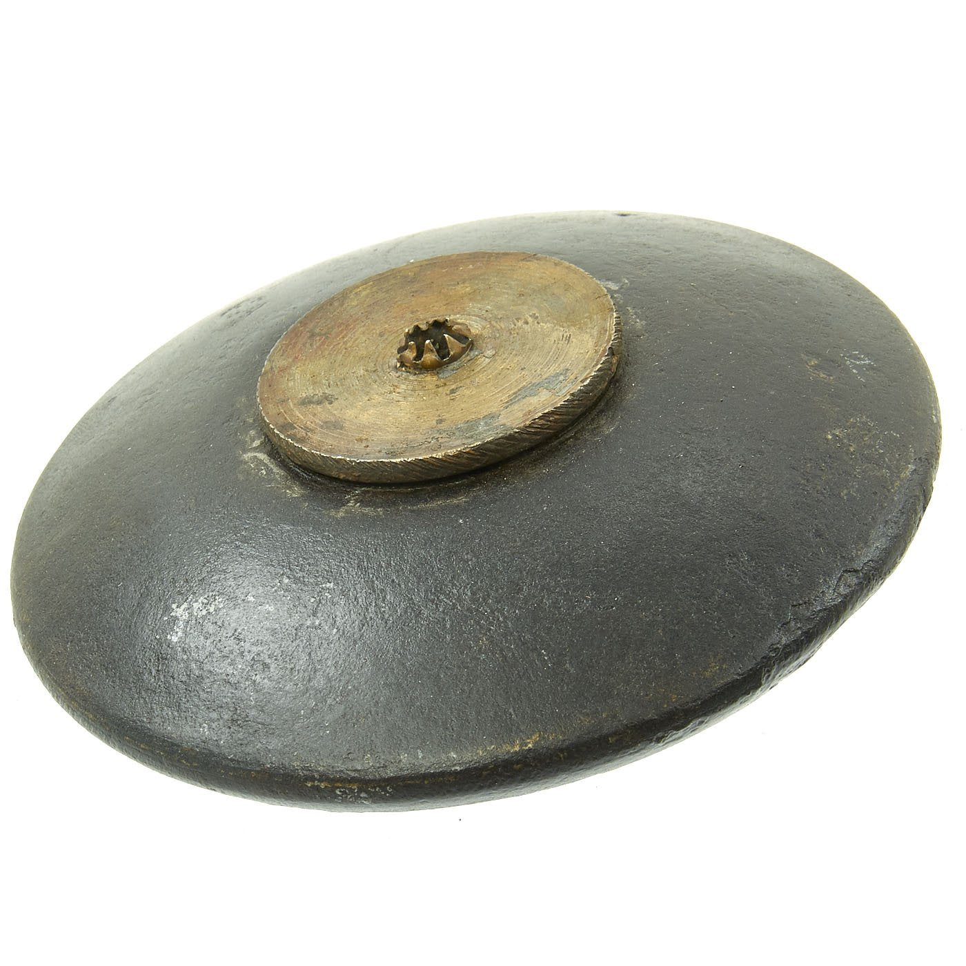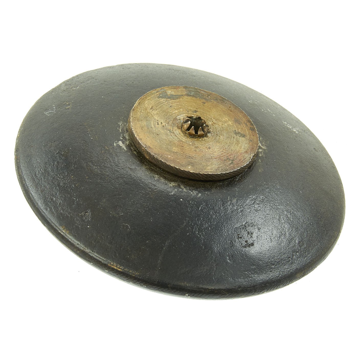 This example is in great shape, with the original brass fuse cover/holder, and still unscrews to show the internal structure and detonator tube. The interior is slightly rusty, due to age and also reactions from the explosives and propellant. Measures approximately 4 1/2 inches across.