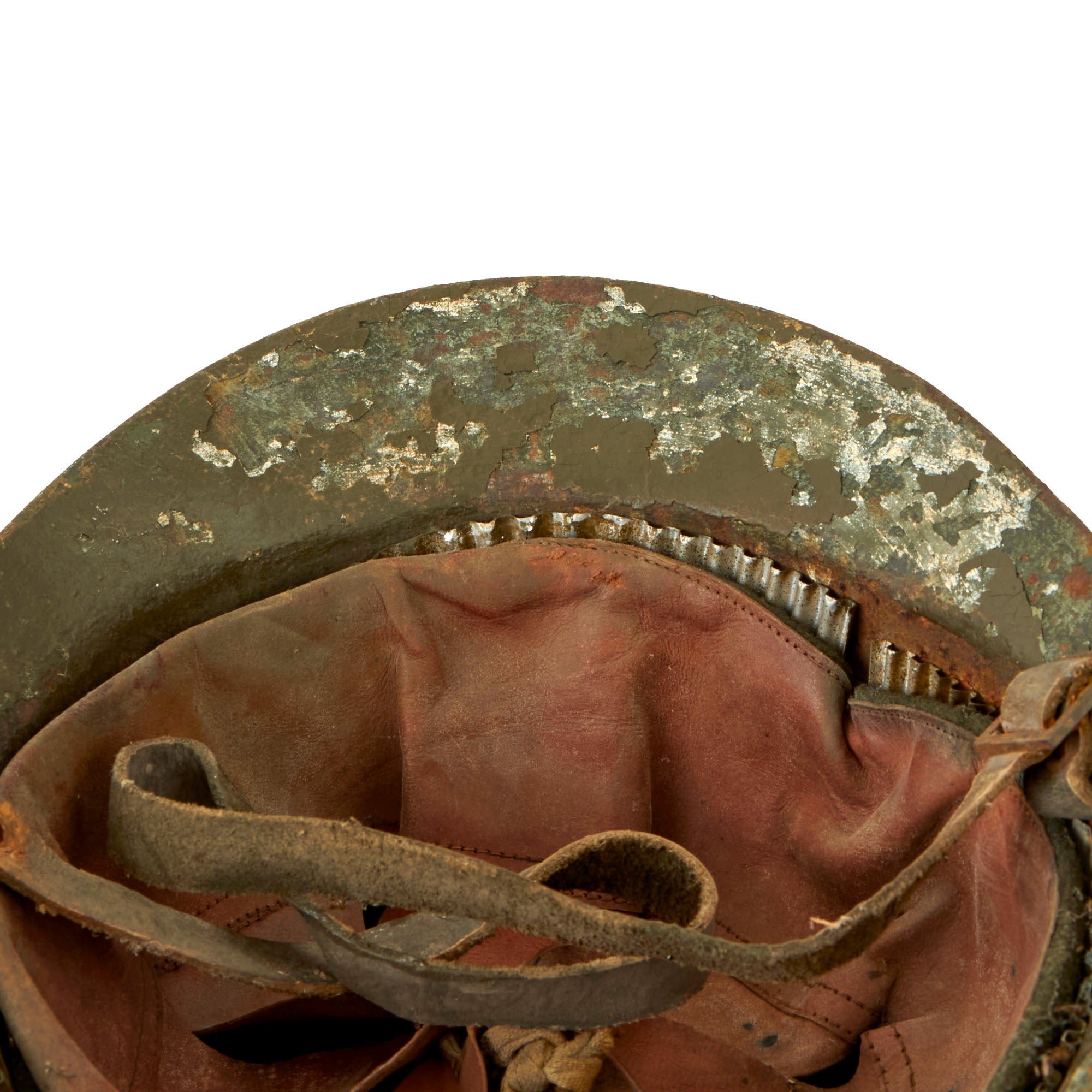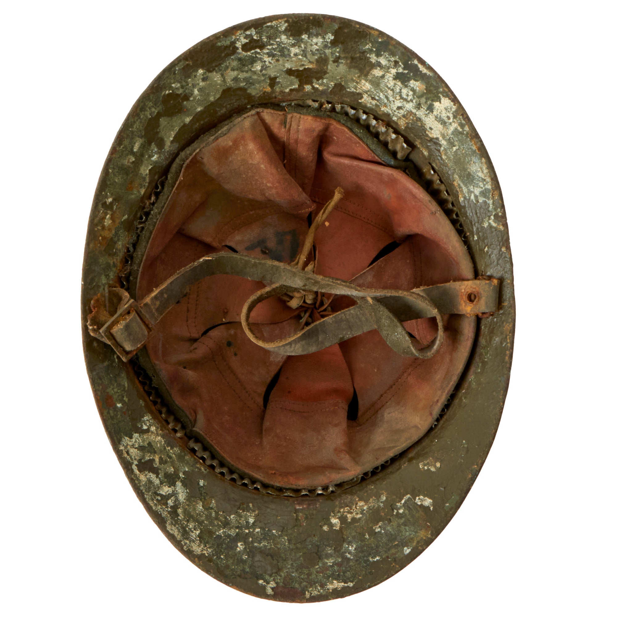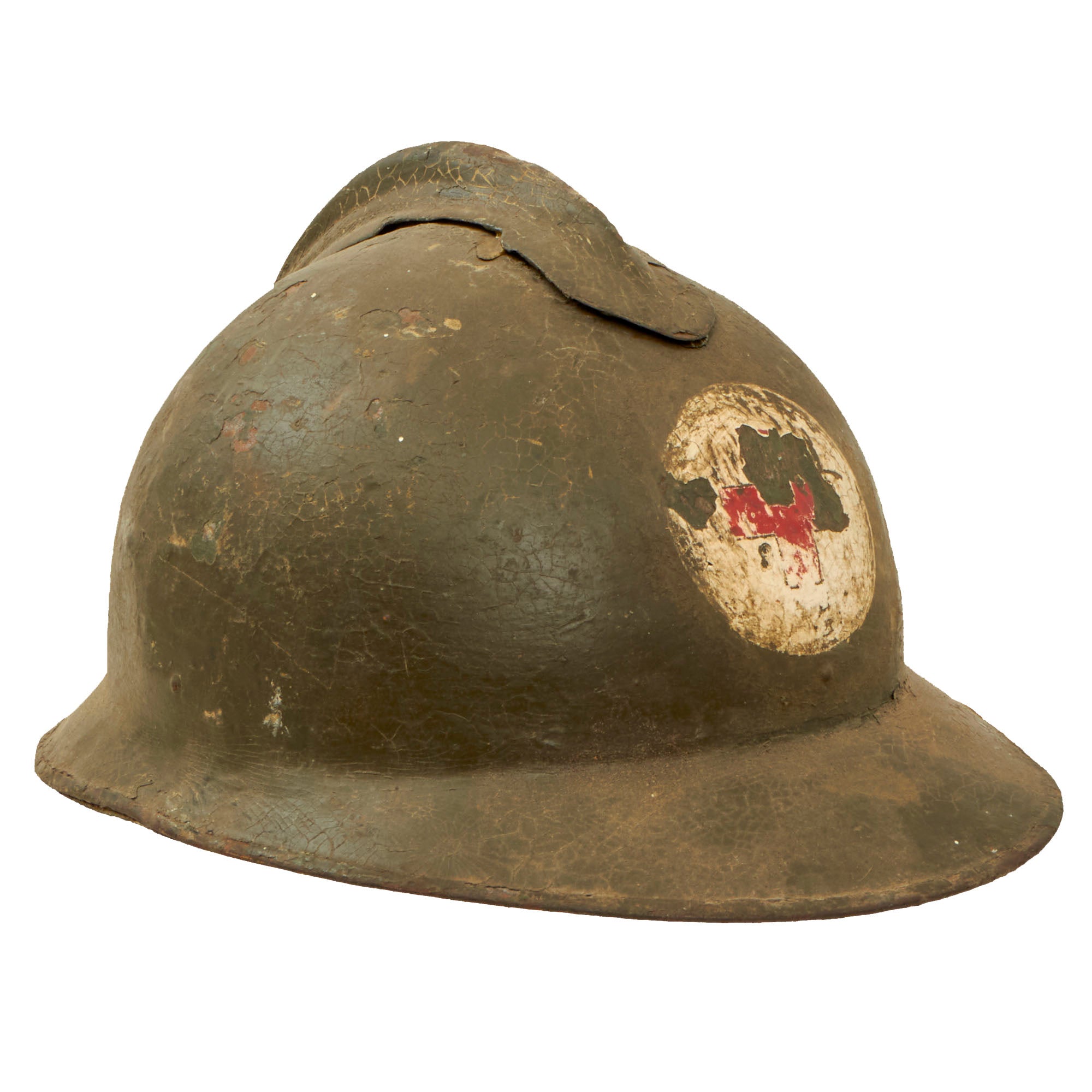 The helmet retains its original green paint but it is heavily cracking. There is a white circle with a Red Cross painted on the front, although much of the insignia is chipped away. This example features a complete original leather liner with wool backing behind the liner band which is characteristic of the Italian Model 1916 vs the French Model 1915. The edges of the liner are worn through in spots but is in solid condition. Offered in overall very good condition, with complete leather chinstrap. Shell shows some minor dings, scratches and paint chips consistent with age, and the underside of the brim has very heavy paint chipping. Ready to display!