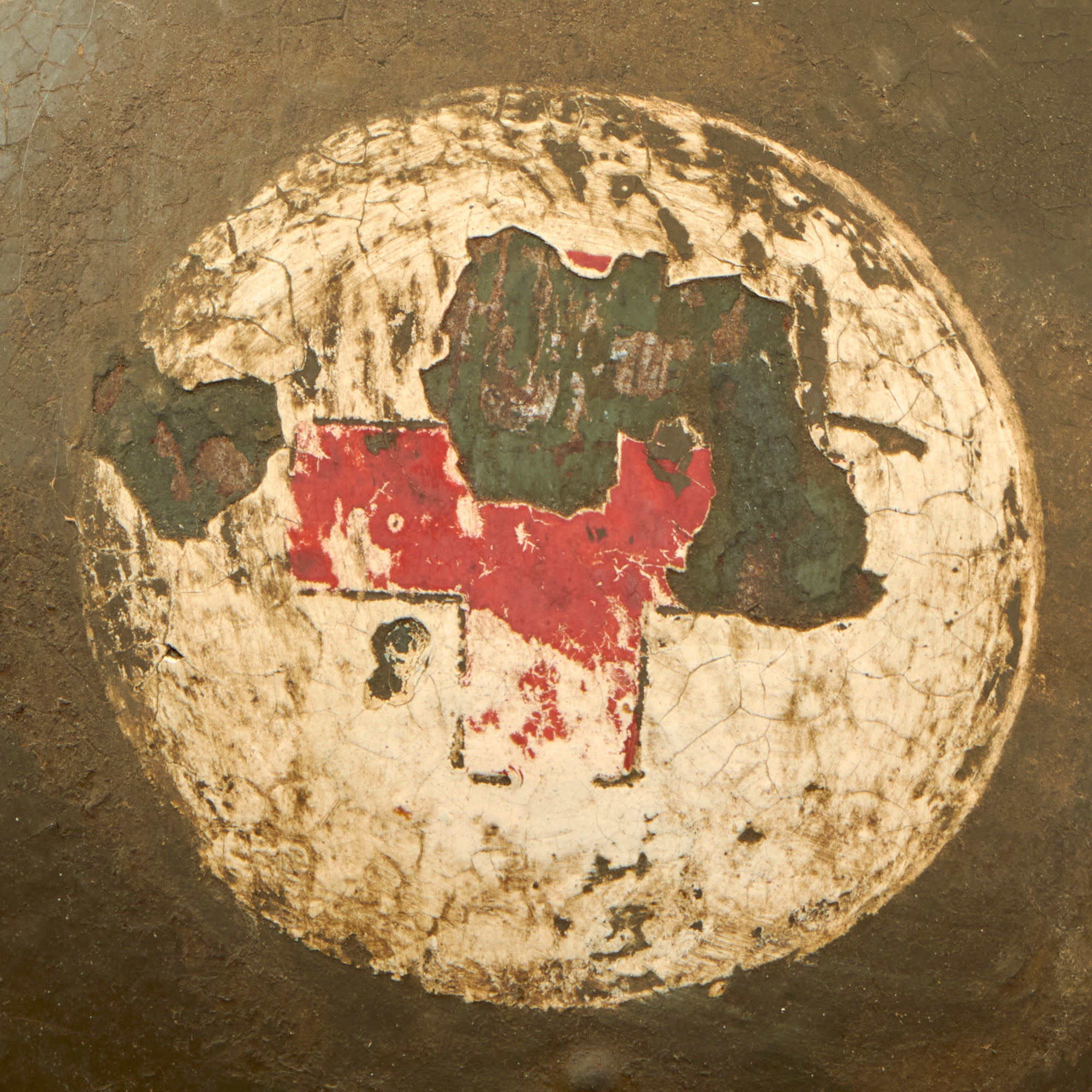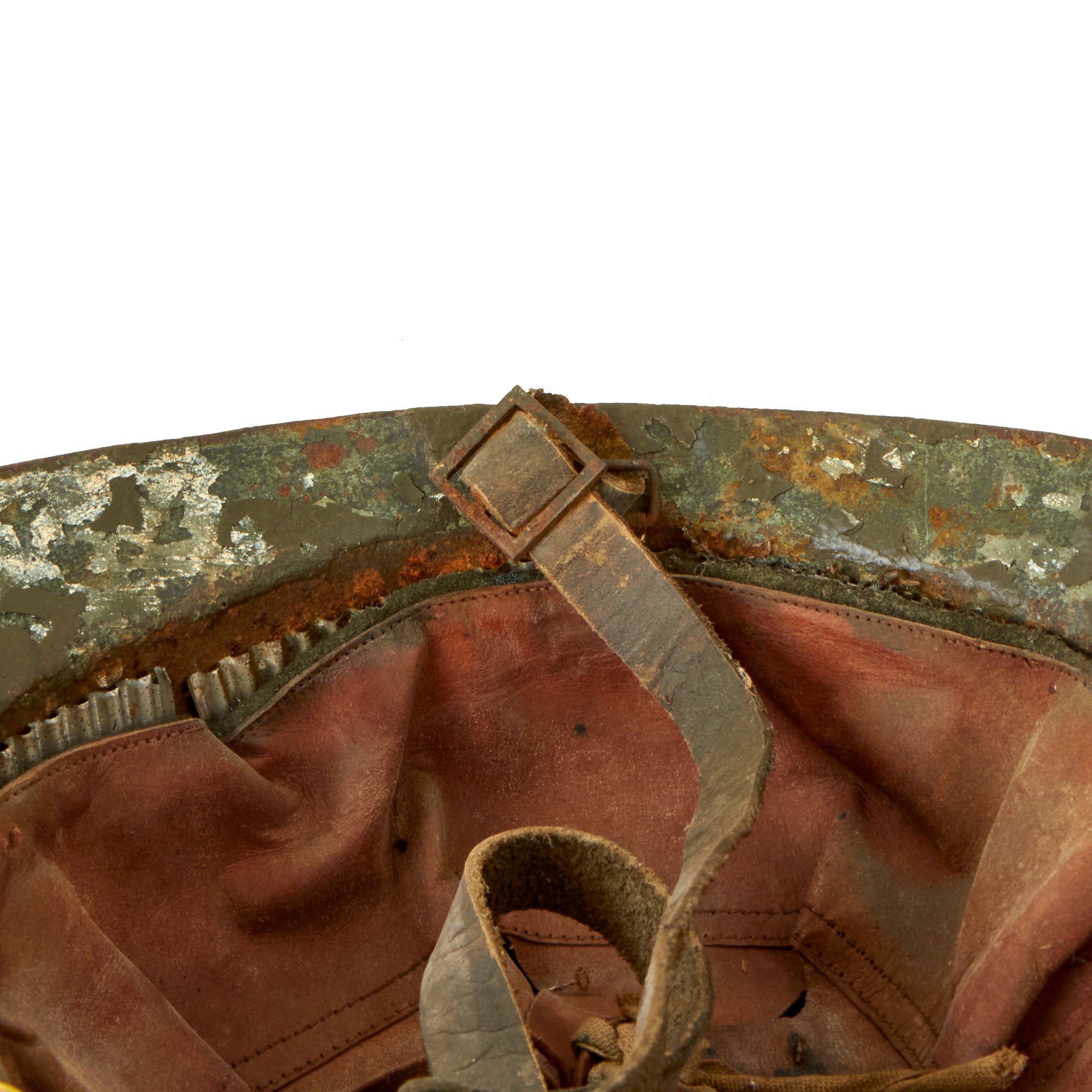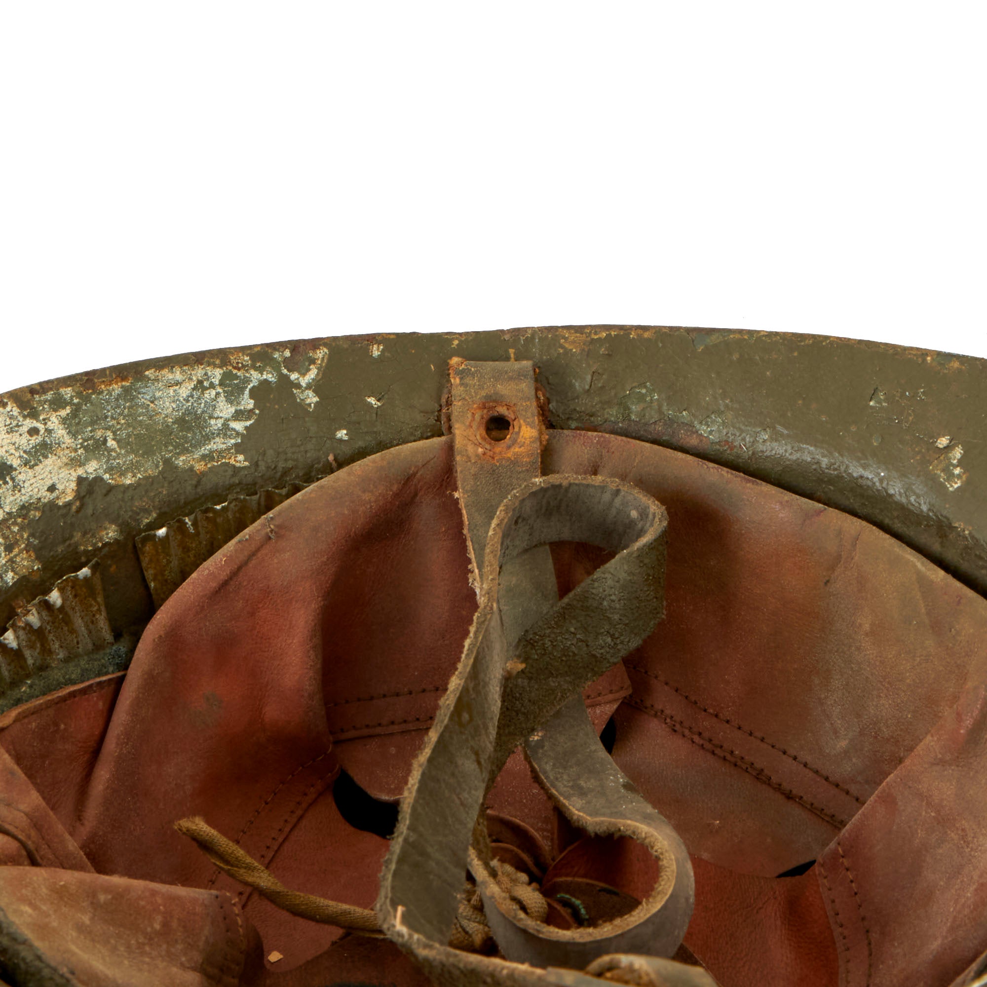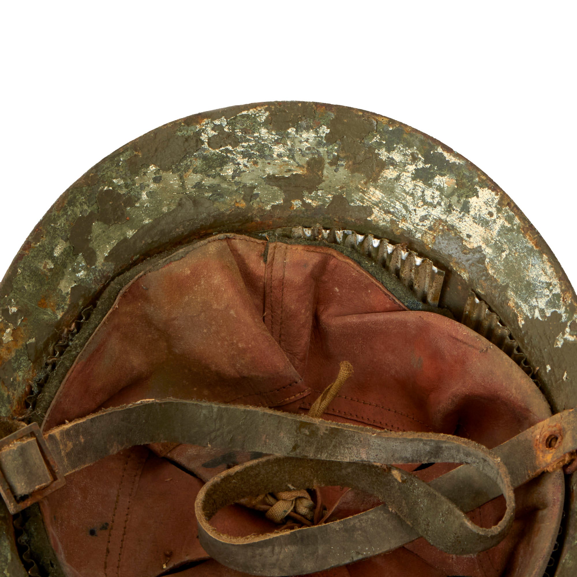 The helmet retains its original green paint but it is heavily cracking. There is a white circle with a Red Cross painted on the front, although much of the insignia is chipped away. This example features a complete original leather liner with wool backing behind the liner band which is characteristic of the Italian Model 1916 vs the French Model 1915. The edges of the liner are worn through in spots but is in solid condition. Offered in overall very good condition, with complete leather chinstrap. Shell shows some minor dings, scratches and paint chips consistent with age, and the underside of the brim has very heavy paint chipping. Ready to display!