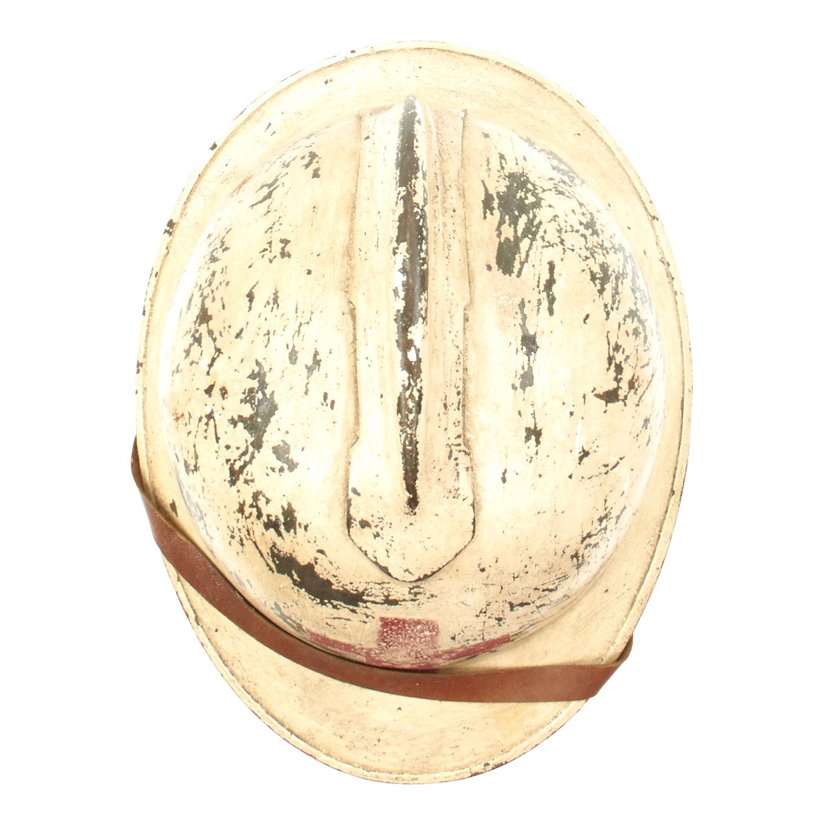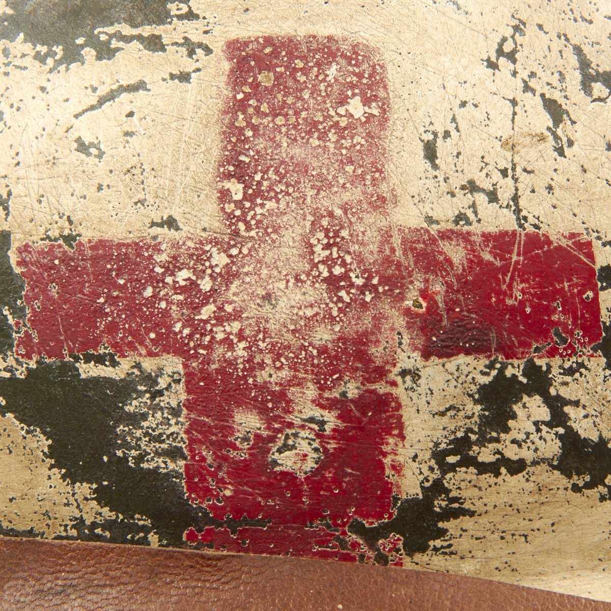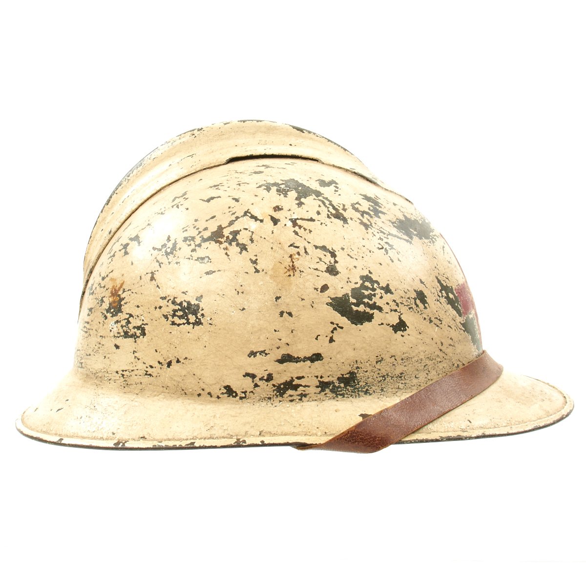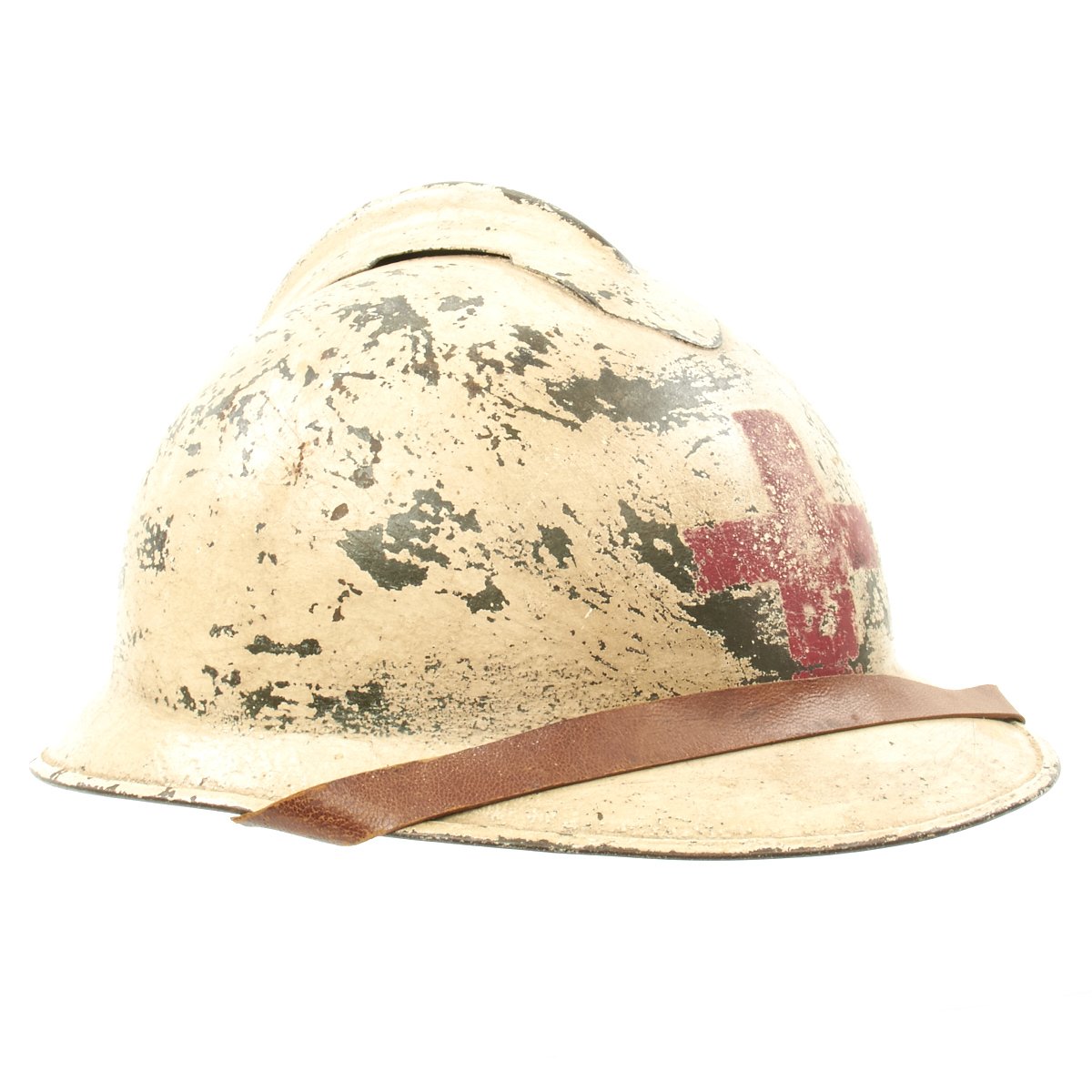 The helmet retains the original green paint which was over-painted in white with the an addition of a medic's red cross to the front. Features a wonderful complete original leather liner with wool backing behind the liner band which is characteristic of the Italian Model 1916 vs the French Model 1915. Offered in overall very good condition, with complete leather chinstrap. Shell shows some minor dings, scratches and paint chips consistent with age.