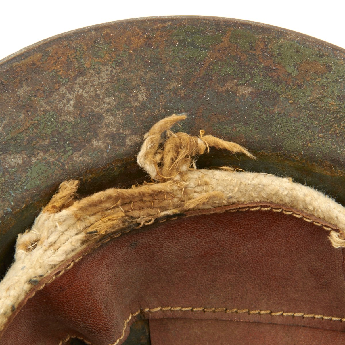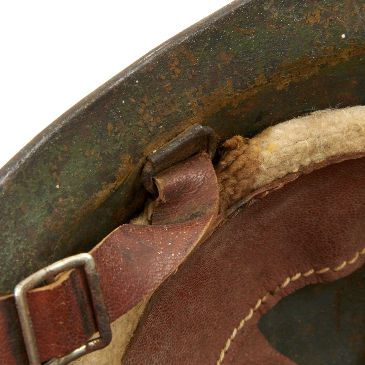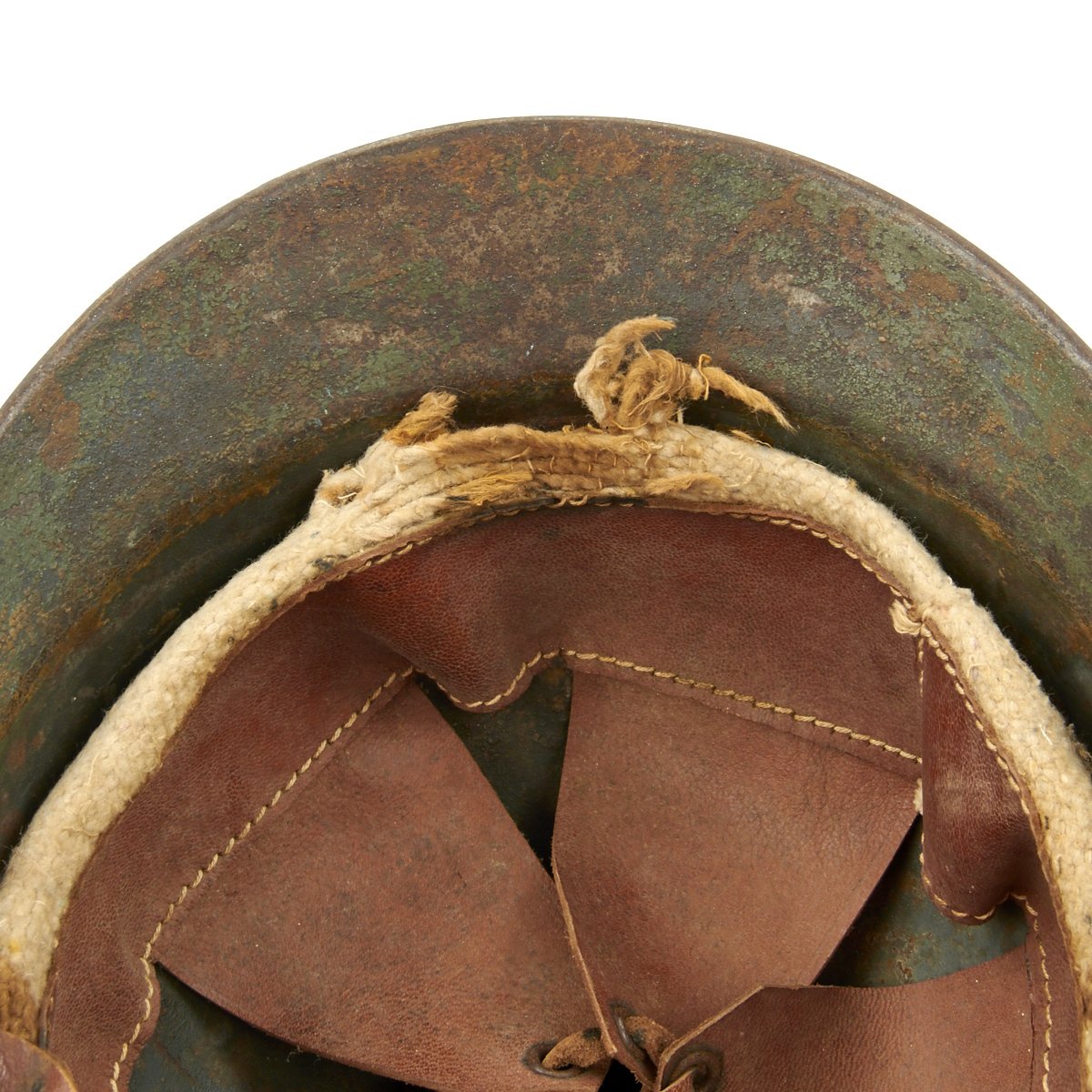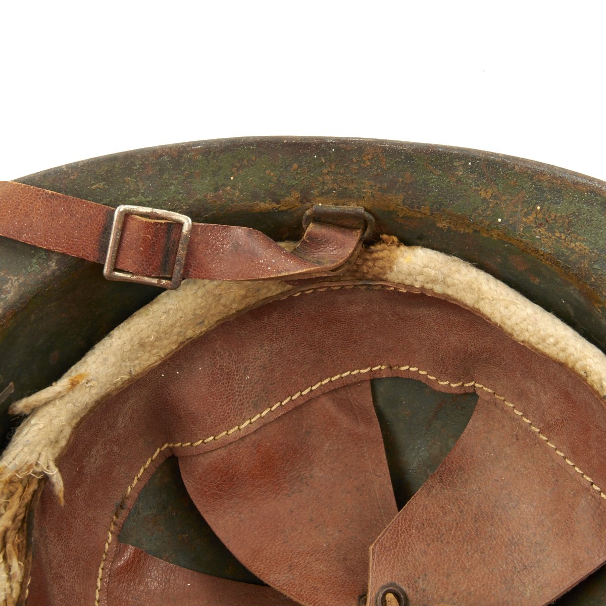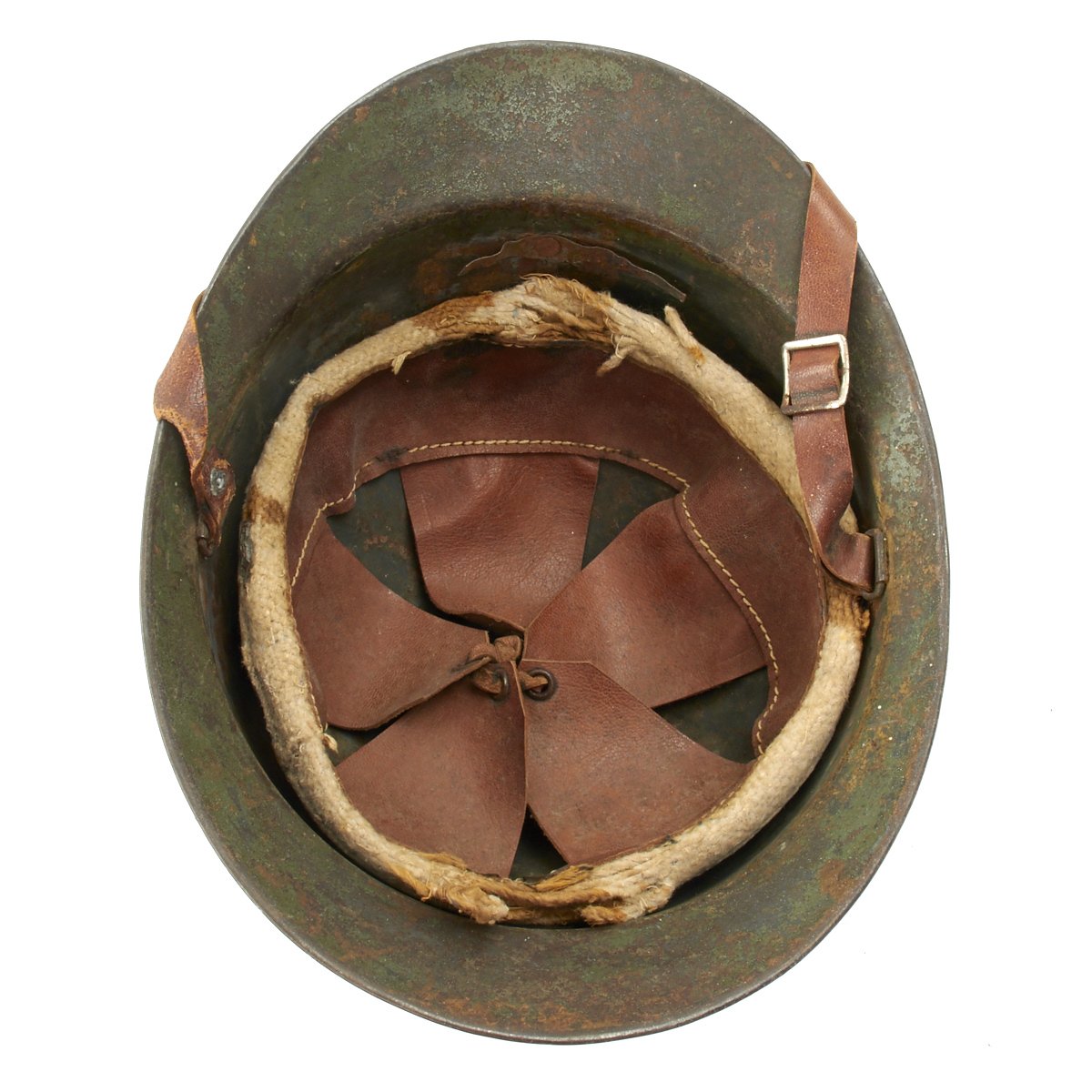 The helmet retains the original green paint which was over-painted in white with the an addition of a medic's red cross to the front. Features a wonderful complete original leather liner with wool backing behind the liner band which is characteristic of the Italian Model 1916 vs the French Model 1915. Offered in overall very good condition, with complete leather chinstrap. Shell shows some minor dings, scratches and paint chips consistent with age.