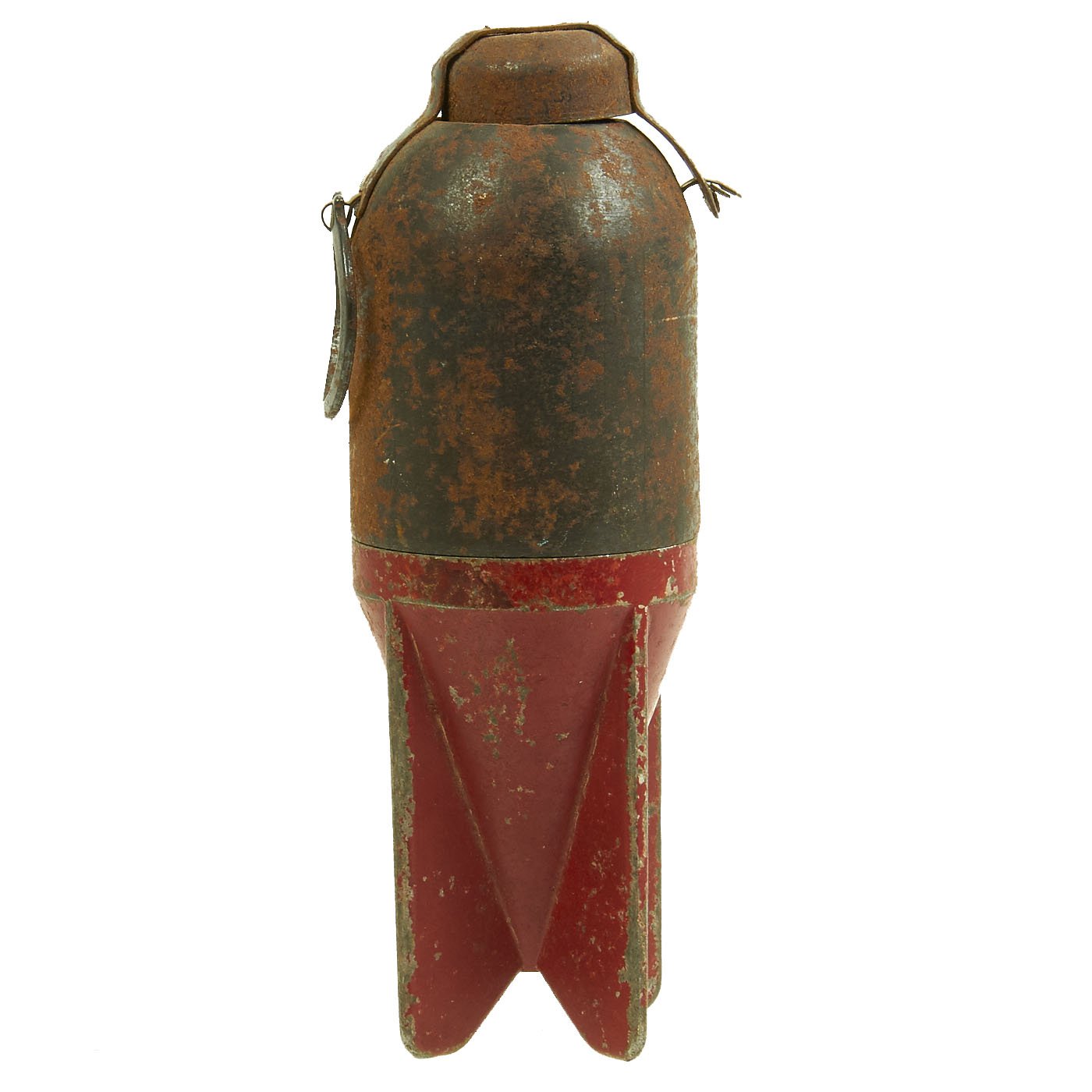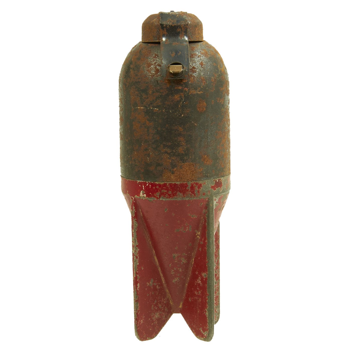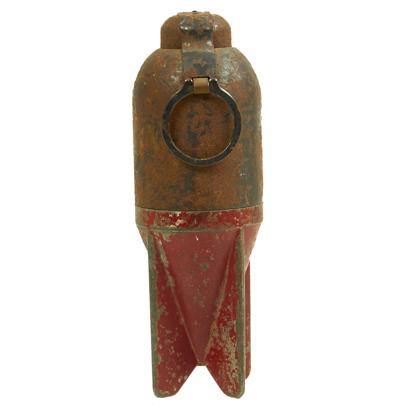 Original Item: Only One Available. This is a very nice condition Italian WW2 45mm Brixia Mortar bomb offered in totally inert condition. This example unscrews to reveal the internal explosive cavity and fuse mechanism (no explosives). This example is marker marked GP in an oval on the bottom center of the fin assembly, and has original red paint, which indicated the type of round it is. It has the original cover for the detonator button, held in place by a brass pull clip. These are exceptionally rare!