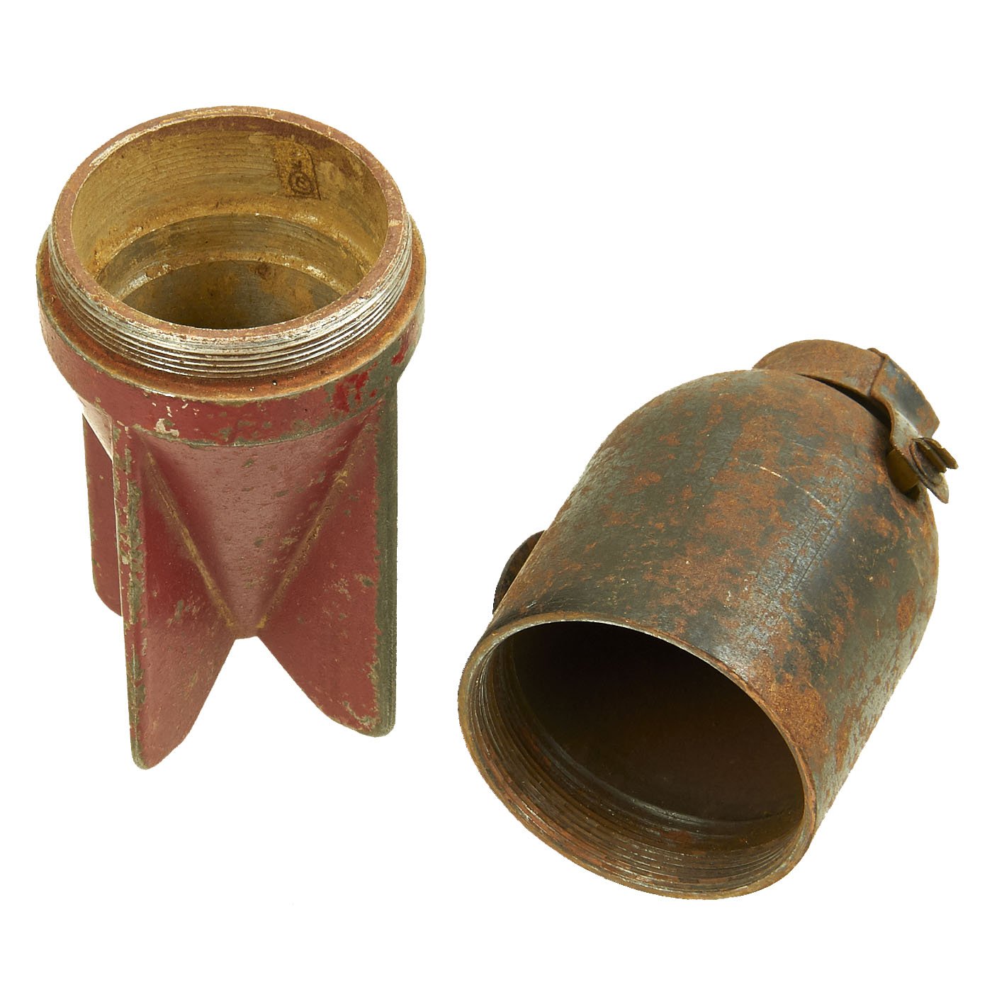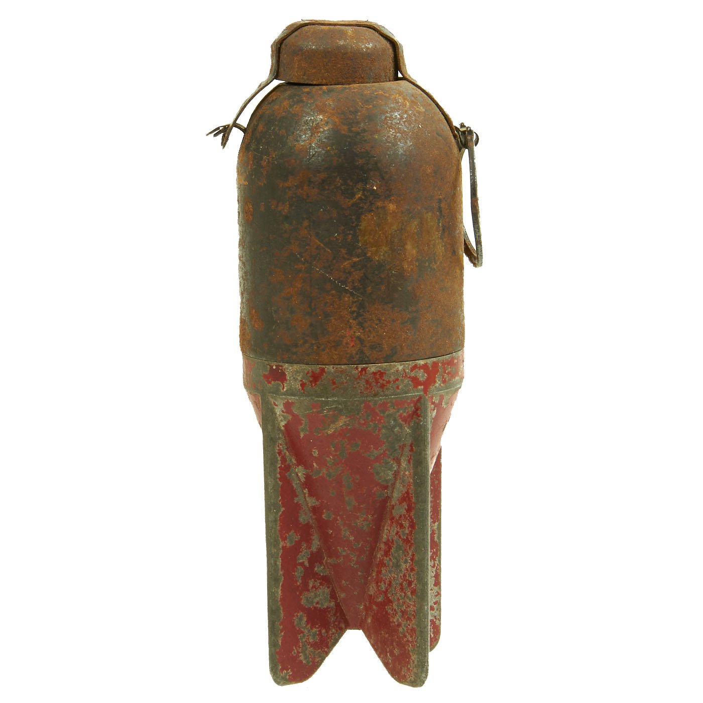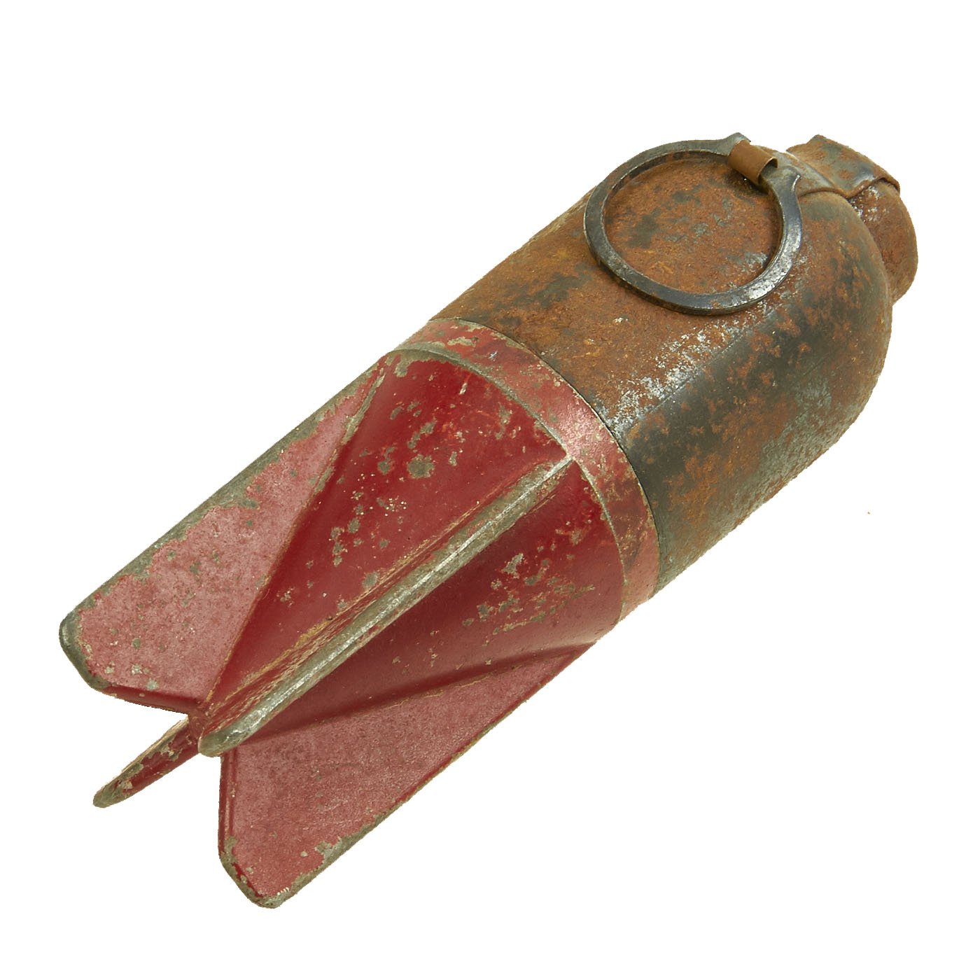 Original Item: Only One Available. This is a very nice condition Italian WW2 45mm Brixia Mortar bomb offered in totally inert condition. This example unscrews to reveal the internal explosive cavity and fuse mechanism (no explosives). This example is marker marked GP in an oval on the bottom center of the fin assembly, and has original red paint, which indicated the type of round it is. It has the original cover for the detonator button, held in place by a brass pull clip. These are exceptionally rare!
