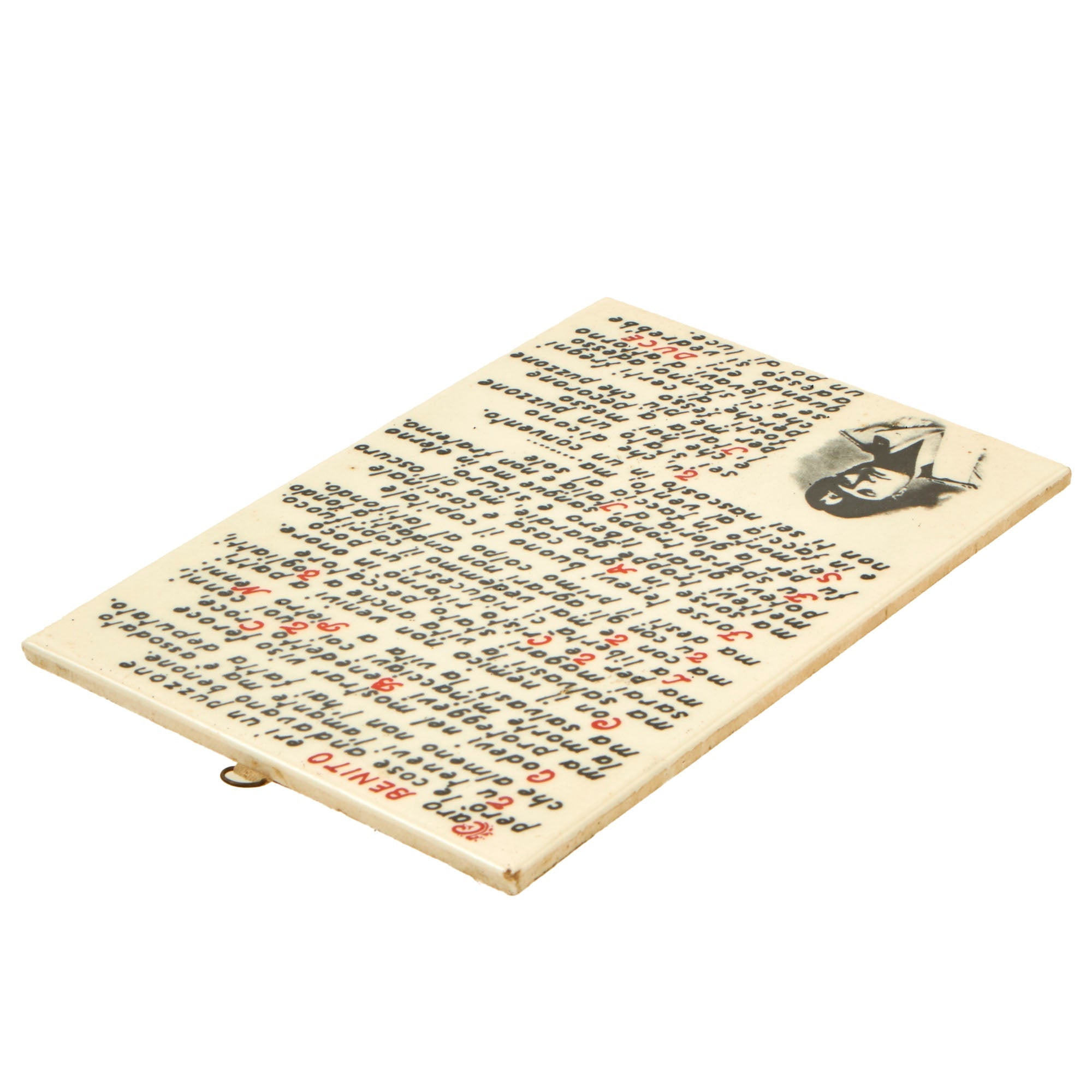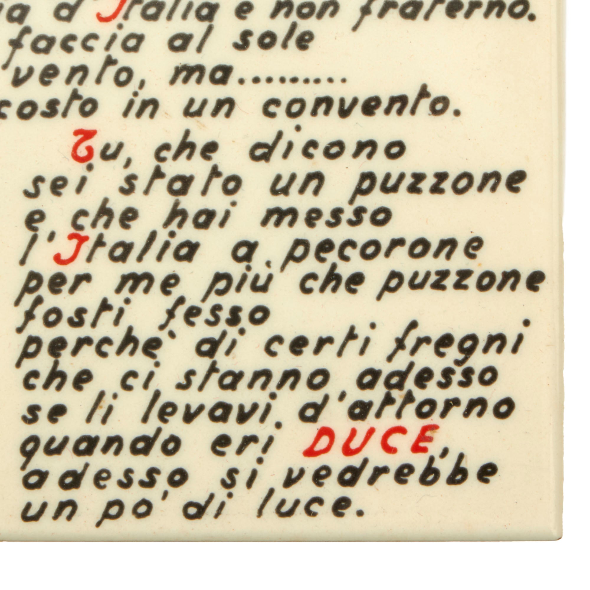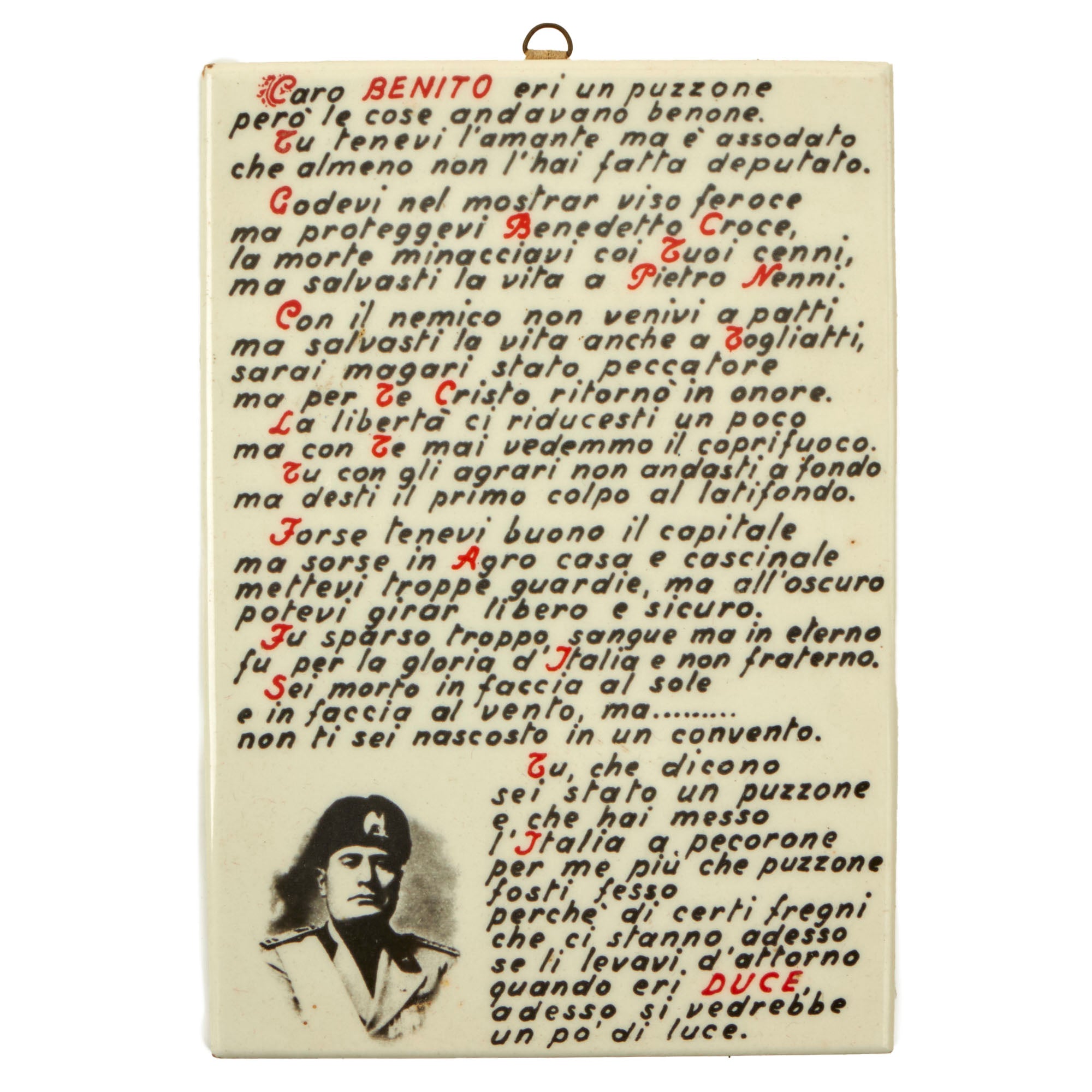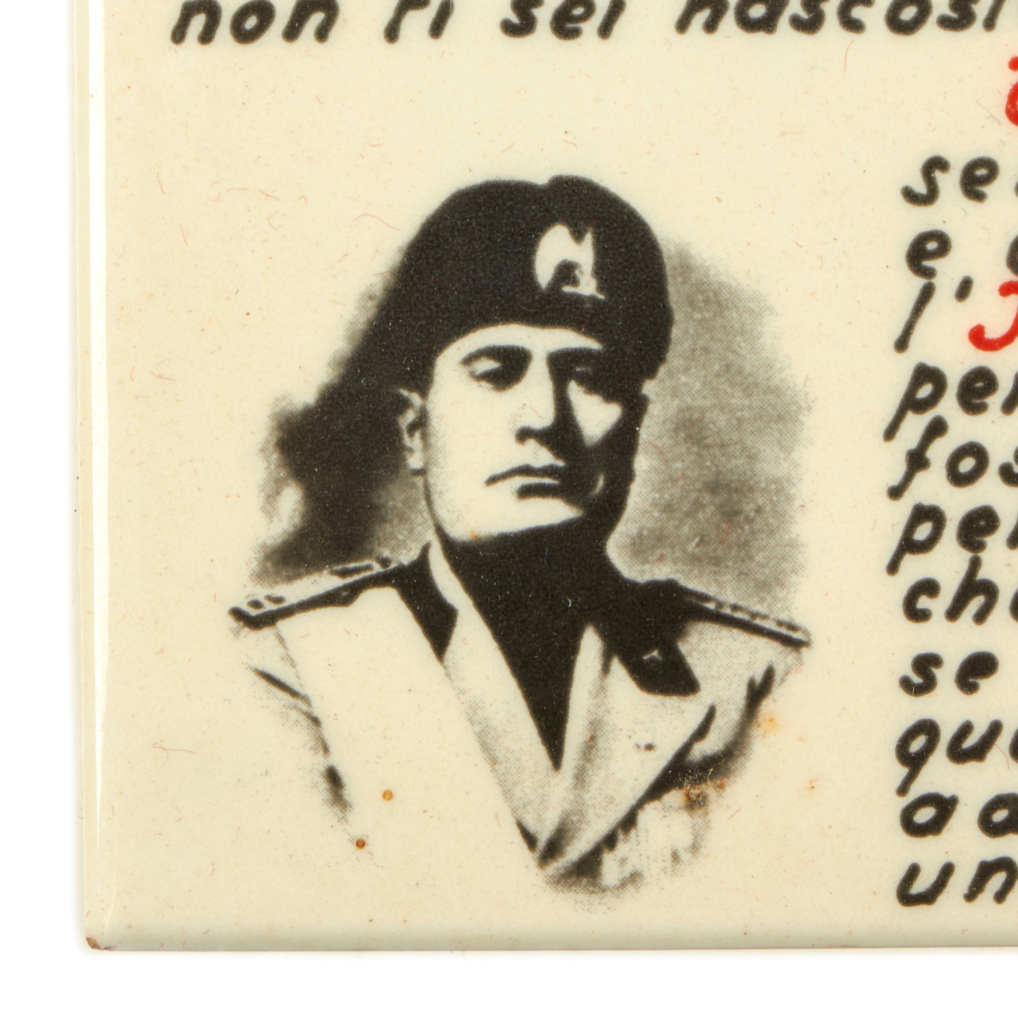 Original Item. Only One Available. This is a very interesting Italian-made tile with a small depiction of Benito Mussolini under a message written to him. At first glance, the tile appears to be pro-Mussolini, but the context of the message makes it clear.