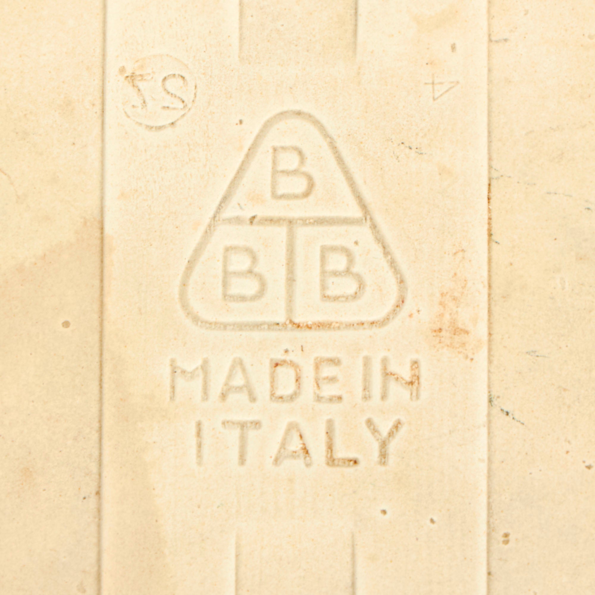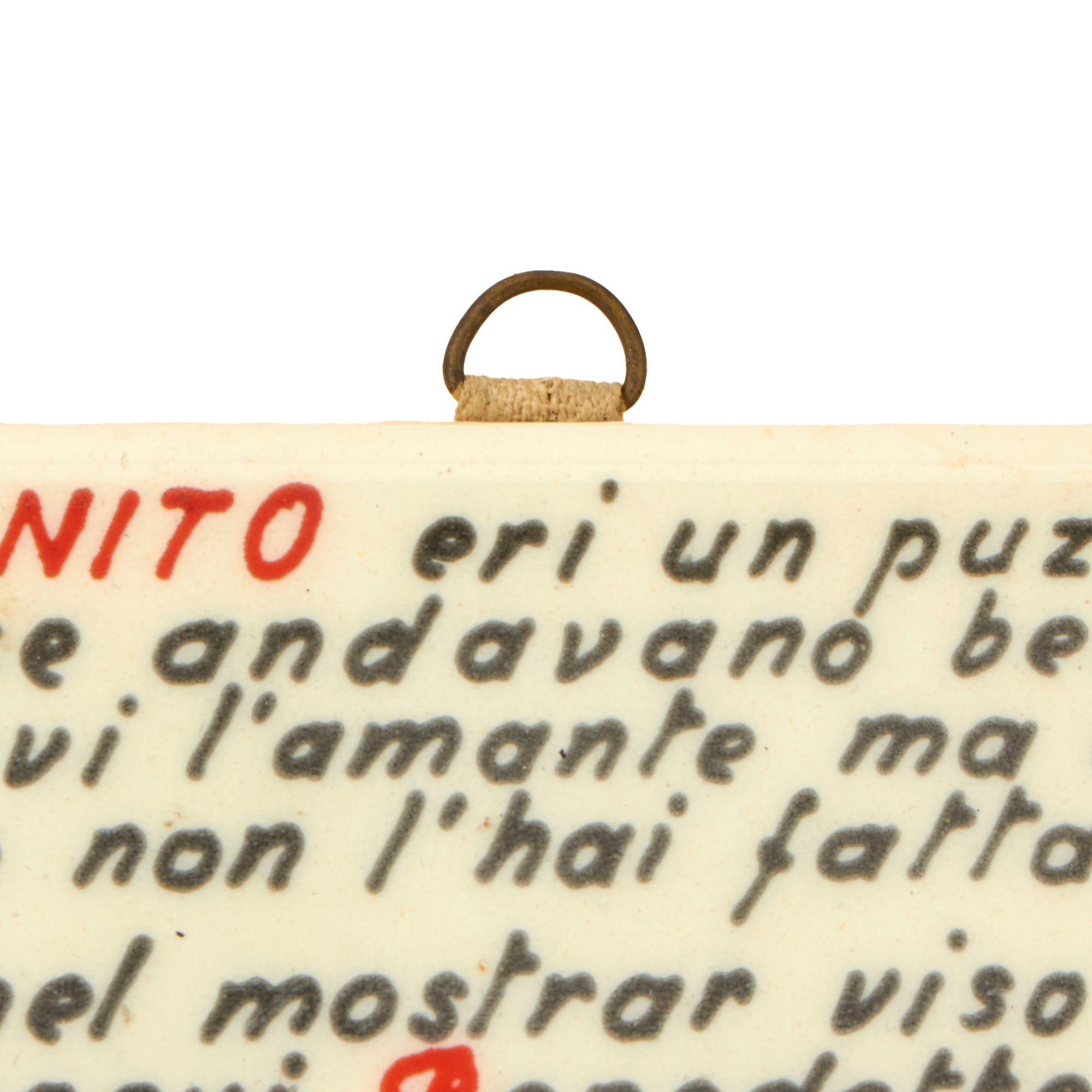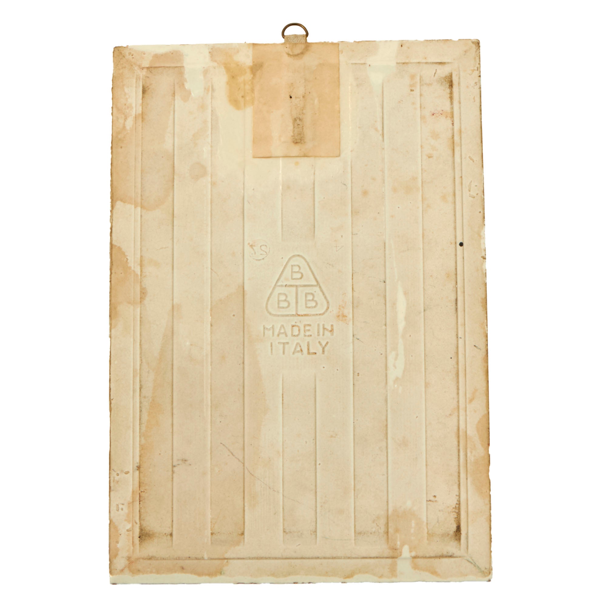 With the translation, it’s clear this piece was meant to criticize the life and career of Mussolini, highlighting his failings and hypocrisies. The tile measures 5¼ x 7¼” and retains its hanging hook. The back shows the maker’s logo, BBB in a Triangle, over MADE IN ITALY.