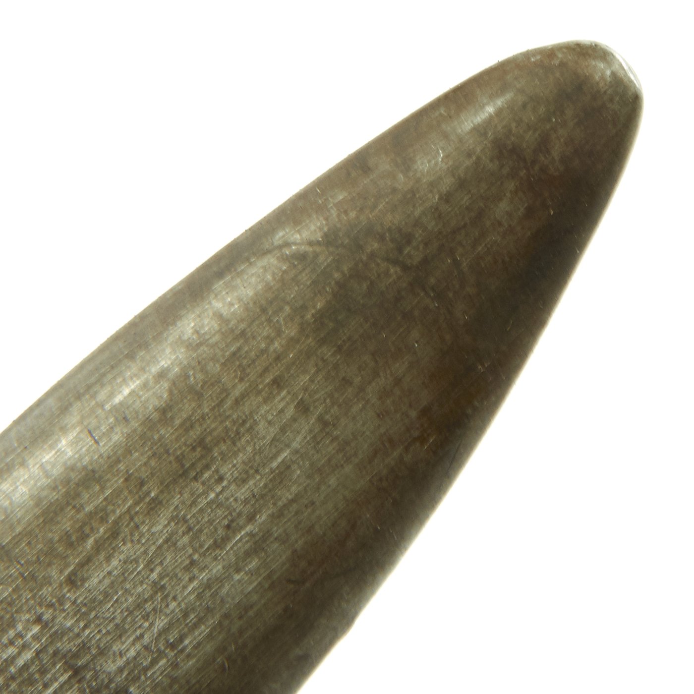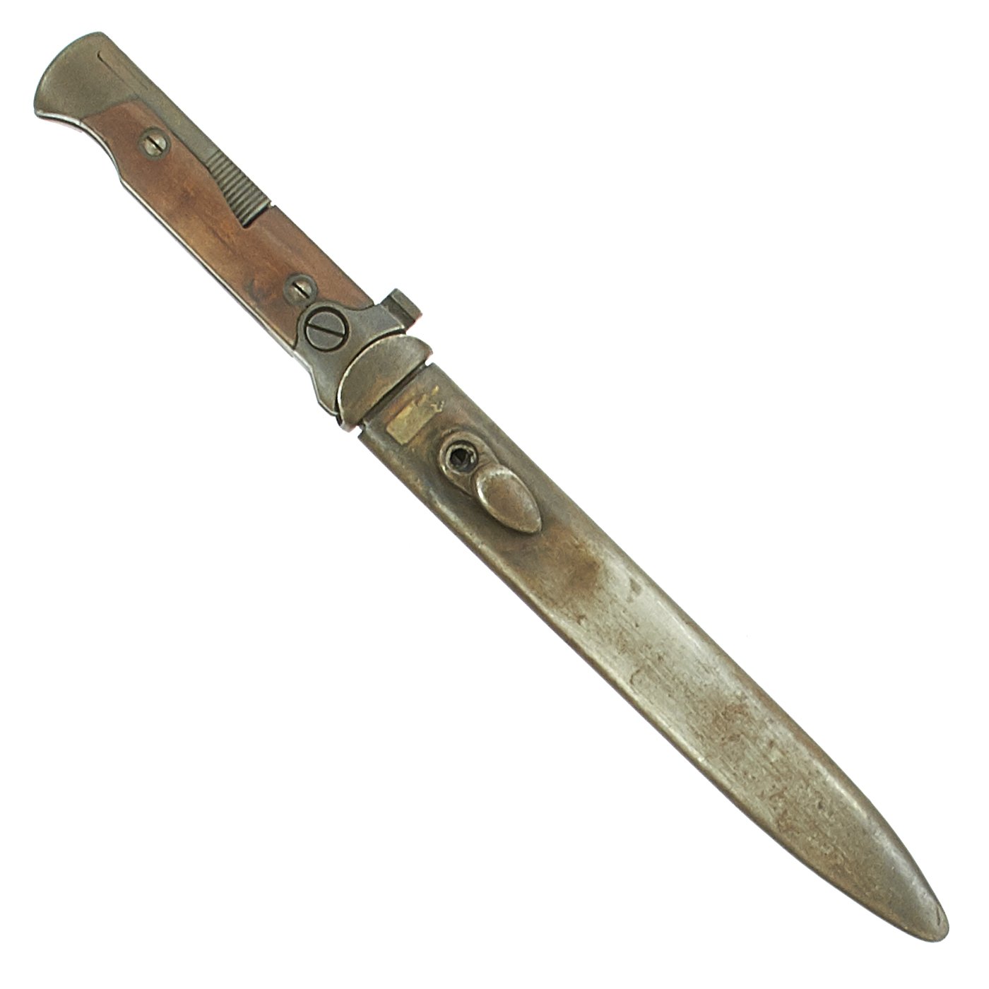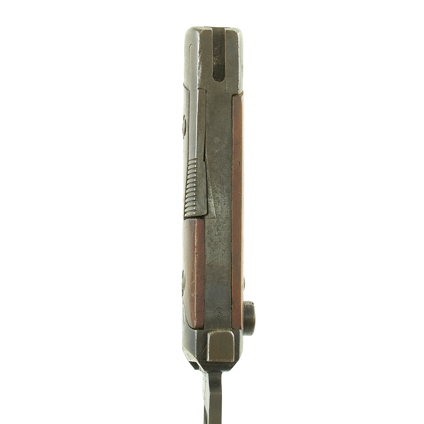 This example is the push-button folding model, where blade folds into handle like a pocket knife. This was done because the bayonet was intended to remain fixed to the SMG during regular use. When the bayonet was not needed, it would be folded up under the barrel jacket. It did not fold into a slot as the Carcano version did.