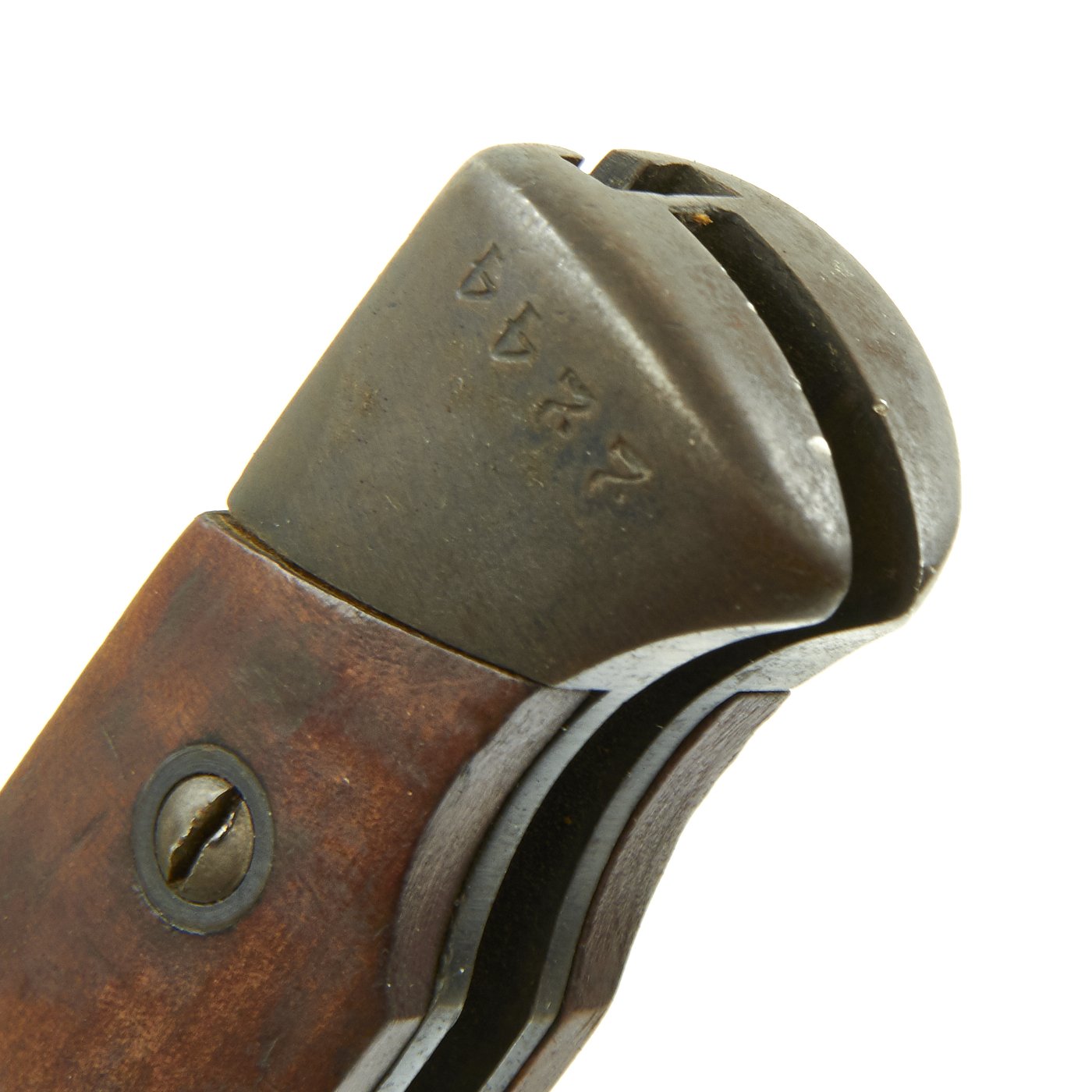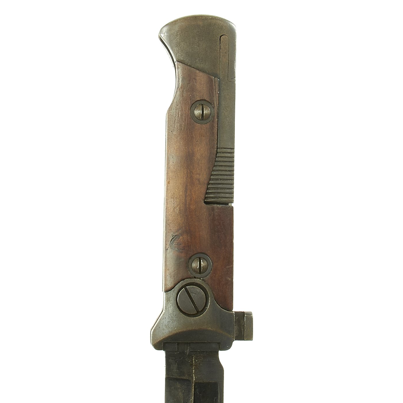 This particular example is complete and has not been modified into a fixed configuration, so it still folds up correctly. Overall condition is very good, with functional rear catch and original finish on blade and wood grips. A wonderful rare bayonet perfect for any WWII Italian or bayonet collection.
