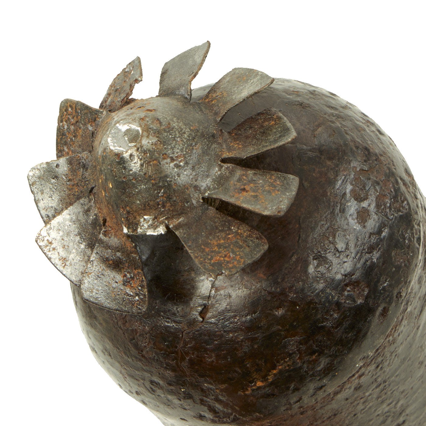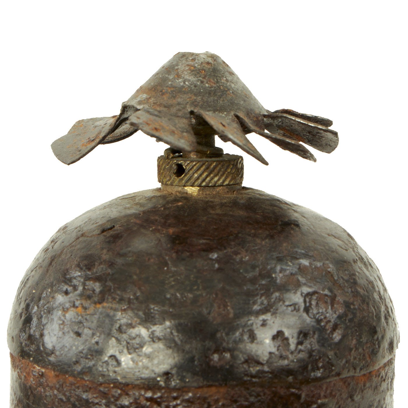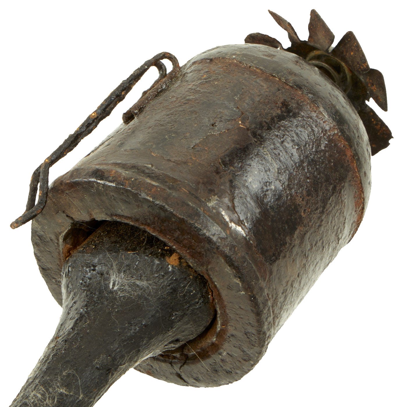 This example definitely looks to be one such "dud", and probably was left on the field for some time, resulting in oxidation to the warhead, as well as rotting out of the "skirt". The bottom fitting of the warhead is missing, so the stick has been put directly inside the explosives cavity, but can be removed. Measures about 13 1/2" long with a diameter of 2 1/2