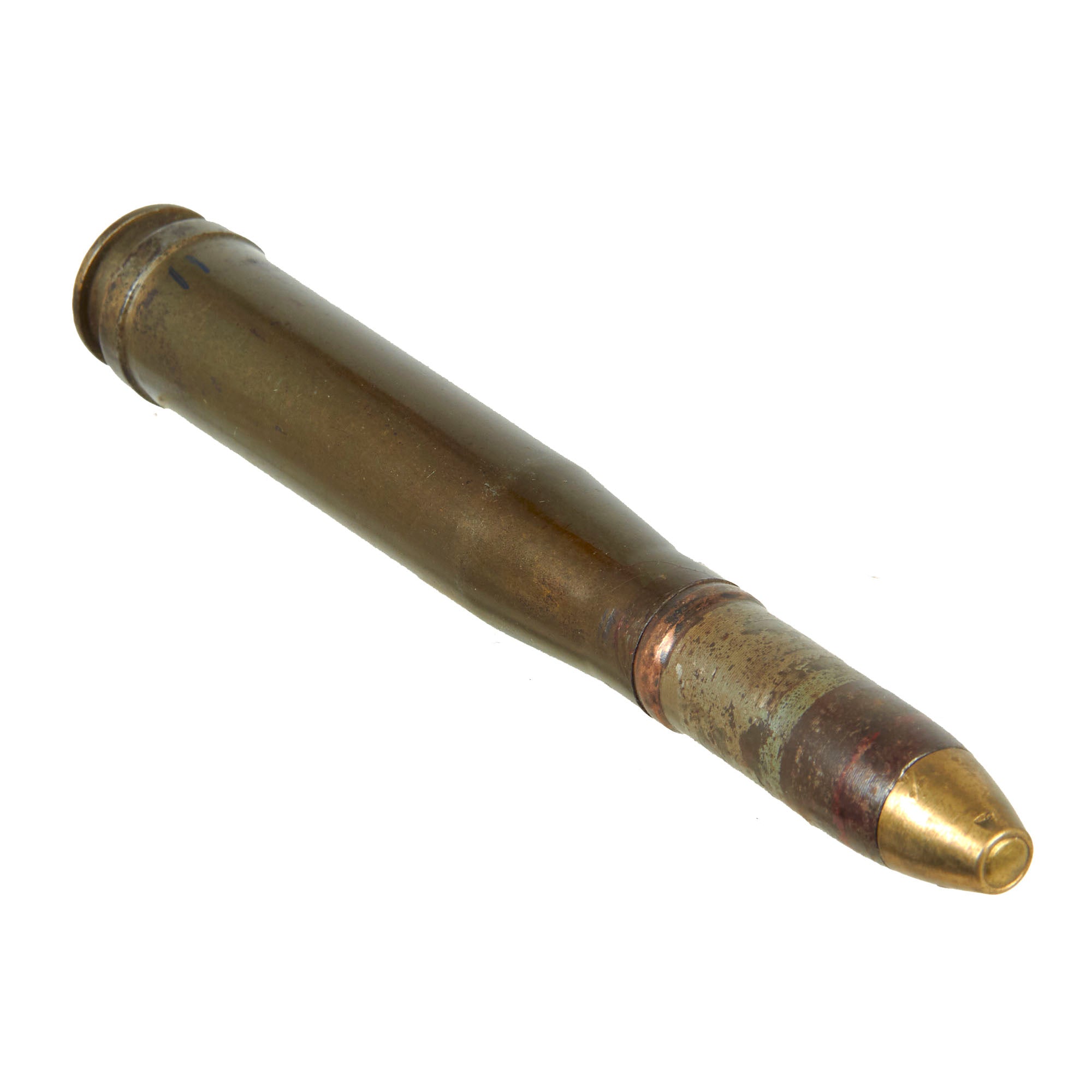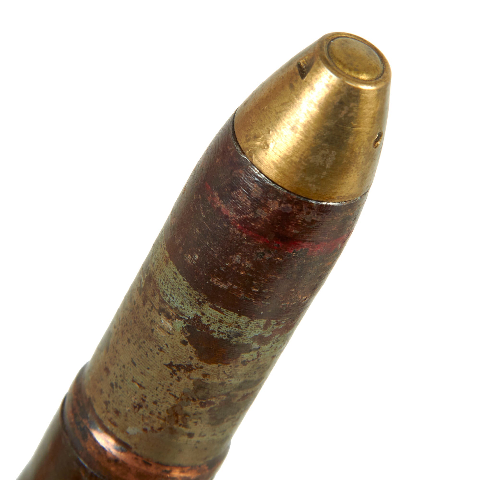 Original Item. Only One Available. The Breda 20/65 mod.35, also simply known as 20 mm Breda or Breda Model 35, among other variations, was an Italian 20 mm (0.787 in) anti-aircraft gun produced by the Società Italiana Ernesto Breda of Brescia company during the 1930s and early 1940s. It saw heavy usage during the Spanish Civil War and World War II, among other conflicts. It was designed in 1932 and adopted by the Italian armed forces in 1935, becoming one of two major 20 mm caliber anti-aircraft guns used by Italy during World War II, along with the Scotti-Isotta Fraschini 20/70 (Scotti 20 mm), both of which fired the Swiss 20x138mmB "Solothurn Long" cartridge. Like all deactivated ordnance, this round is Not Available for Export.