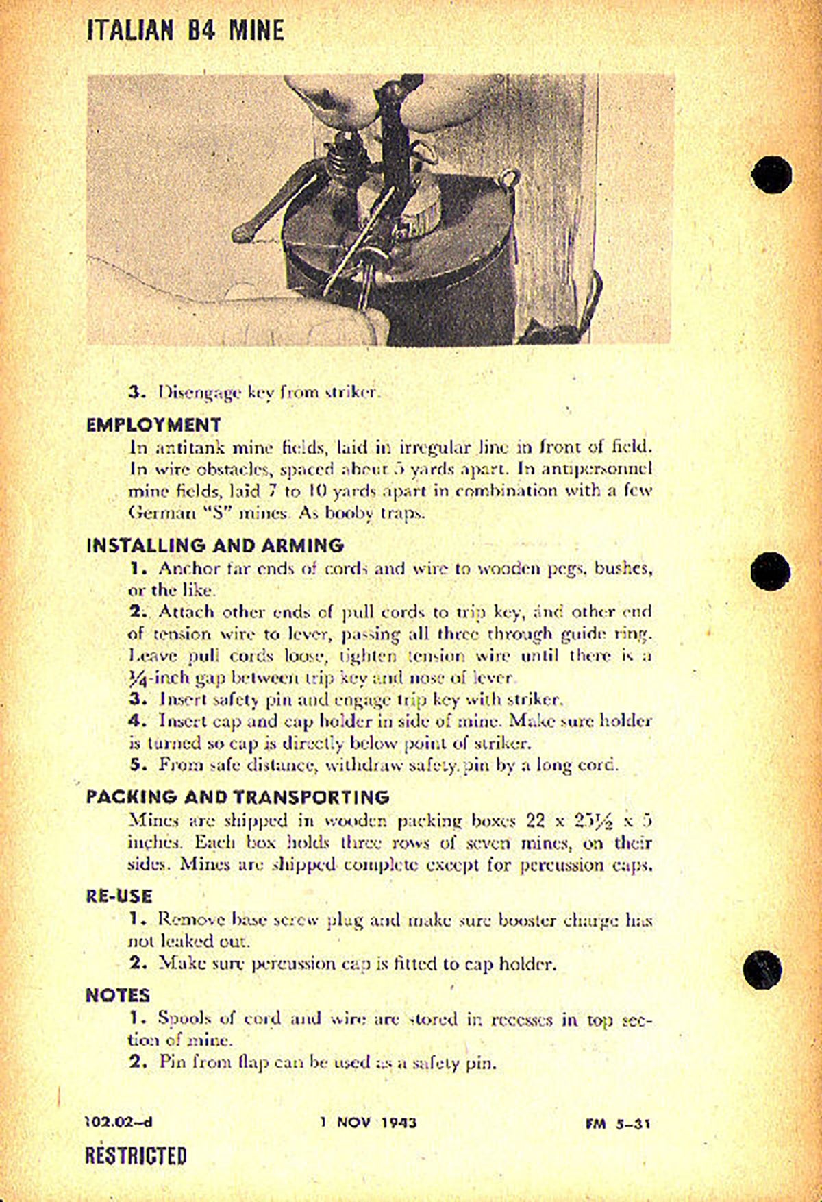 The mine measures 6¼ x 1½”. It retains all of its original parts and has been made inert. The cap on the bottom attached to a chain still unscrews. The side of the mine is stamped B4. This is a shrapnel mine and on discharge scatters scrap metal. It is usually fixed above the ground to a tree or post as it has no "jack-in-the-box" effect like the British and German types, but has been used buried. It is fired by pulling a trip wire or by cutting a tension wire.