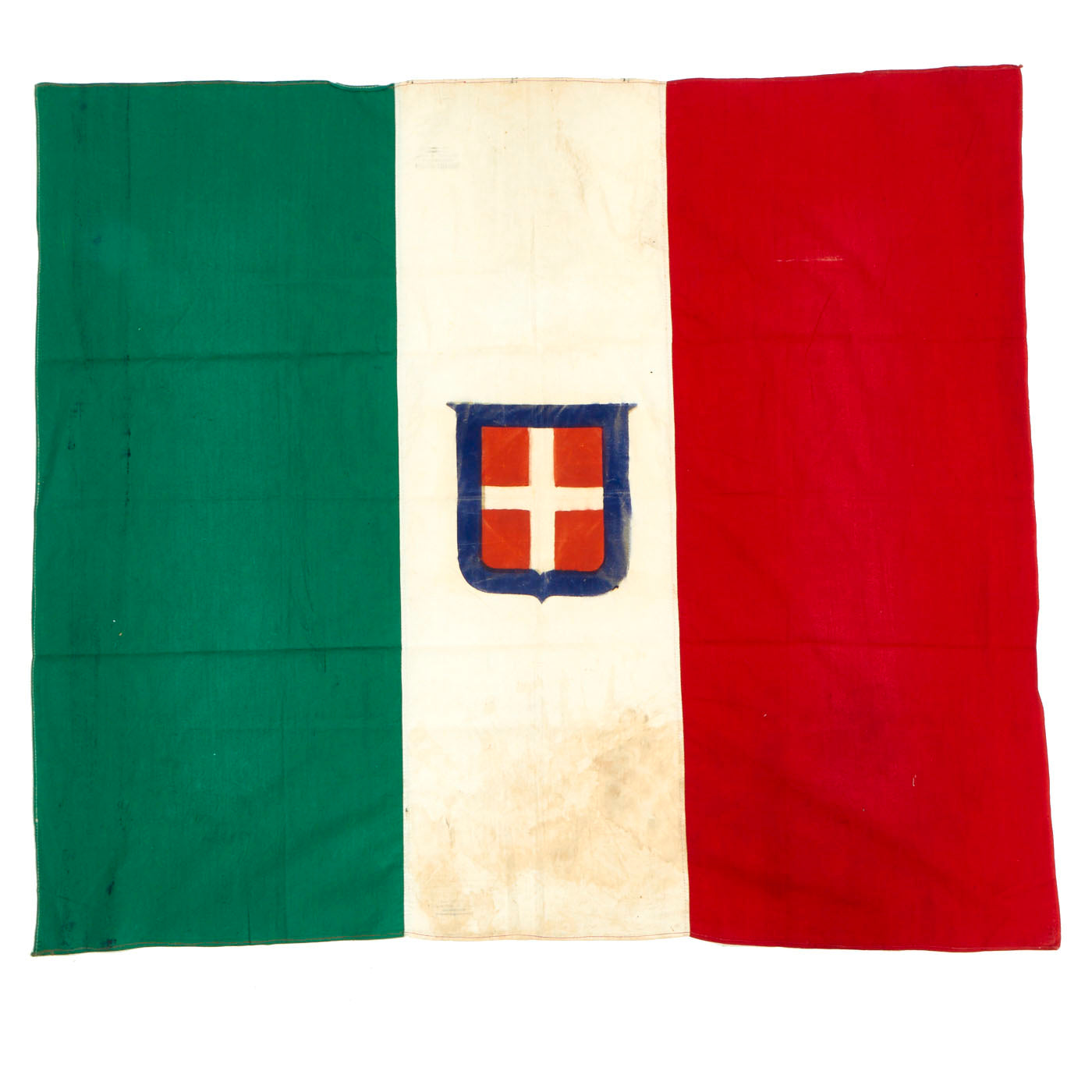 Original Item: Only One Available. Brought back by a US Soldier after WWII, this is a very nice Italian National Flag, which looks to have seen moderate service during the war. It measures approximately 43" X 38", is of three piece construction, with each color being a different piece. The Savoy Coat of Arms is dyed onto the white central portion. It does not have a separate header or hanging ties. The Savoy Flag was adopted in 1861 and relinquished in 1946 with the current flag design.
