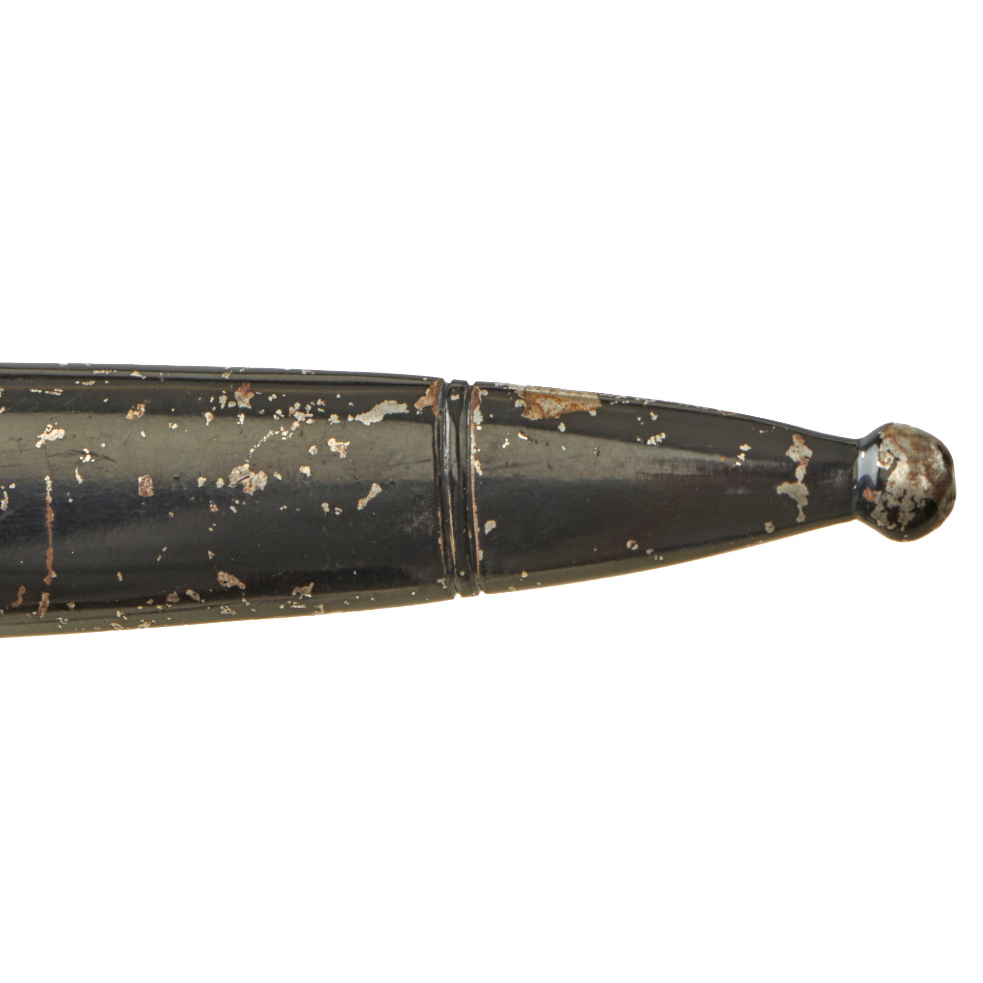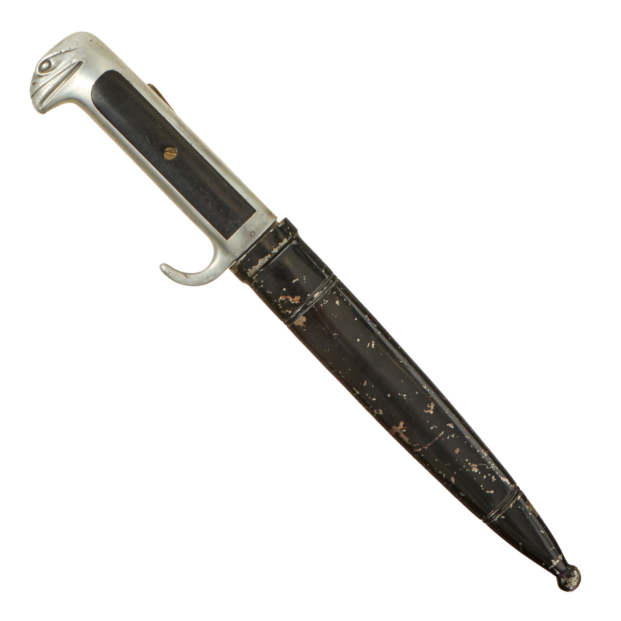 The dagger comes complete with its black-painted scabbard, with a leather belt loop on the back. The scabbard is in good condition, but has heavy chipping in the paint.
