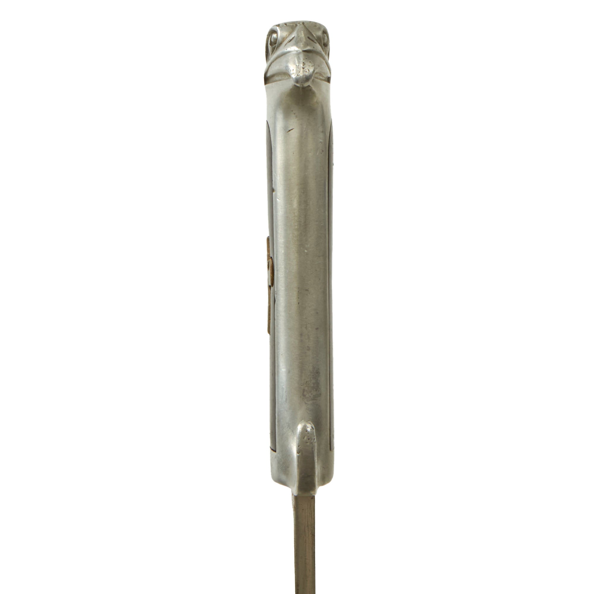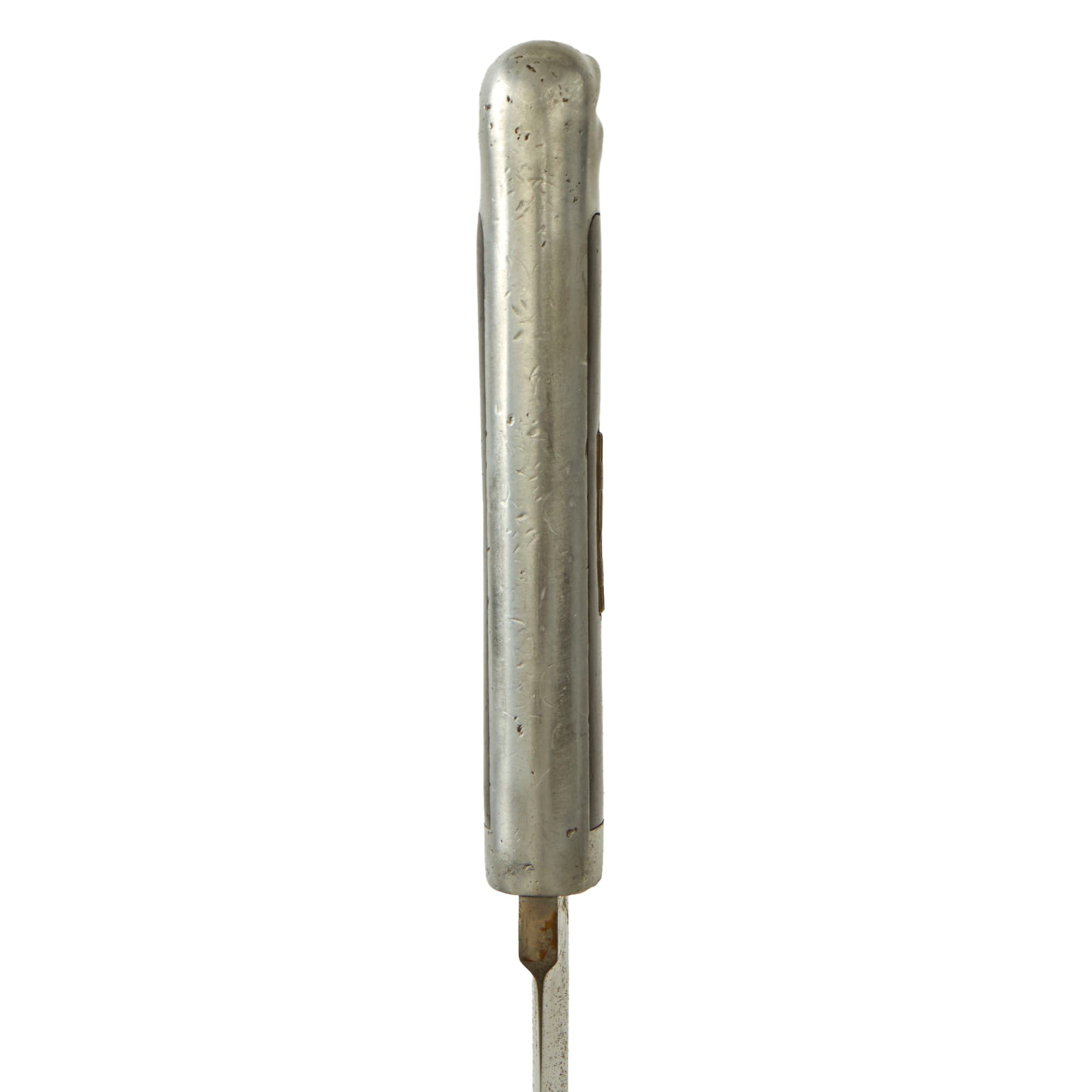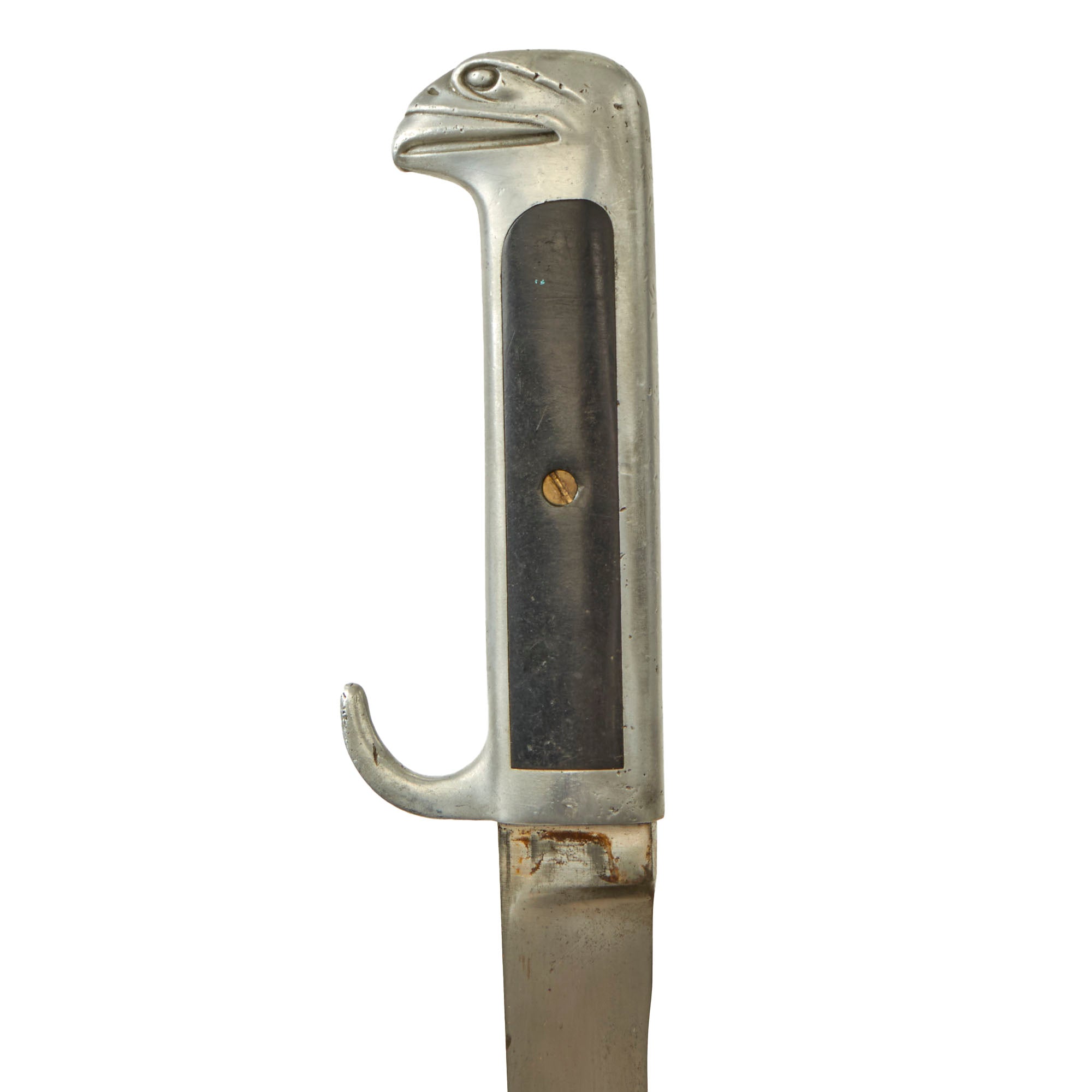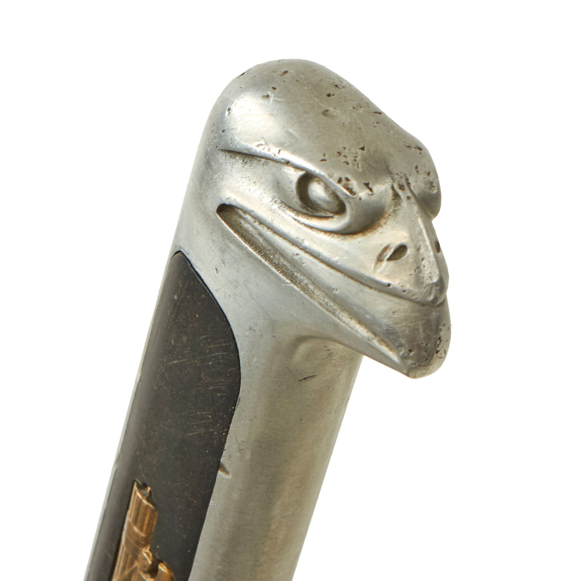 The eagle's head shaped handle is fabricated from aluminum and has a small quillon/crossguard. It is in excellent condition, with light oxidation & scaling, which is rarely seen. The are black plastic plates embedded on either side and held in place by a single brass screw, which screws into the back of a brass Fasces insignia on the other side. The Fasces is a bundle of sticks with an axe head, and is the symbol of the Fascist party in Italy. Most likely the insignia was originally gilt, but that has faded.