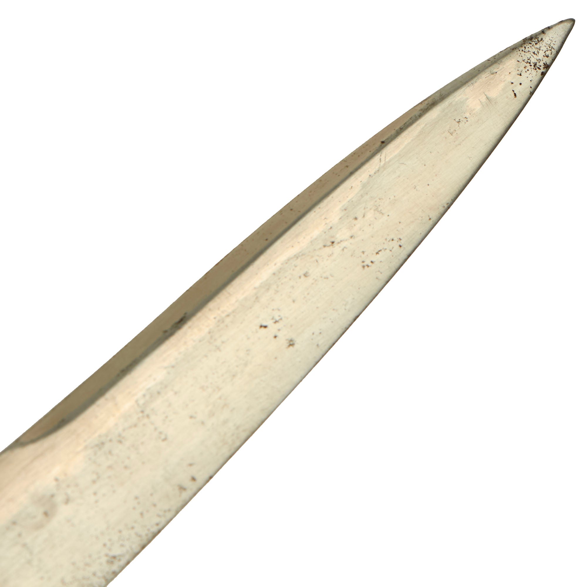 This type of MVSN dagger was a mostly ceremonial item, worn by members of the Blackshirts as a symbol of authority, much as the SA in Germany did. The dagger measures 10 7/8 inches overall, with a 6 5/8 inch nickel-plated blade. The blade does have a sharp edge on the bottom, so it definitely could be used, but they rarely were, as "Pugio" daggers were much more up to the task. This example however has had the lower edge sharpened, and was used, though not much. It also has runner wear from the scabbard.