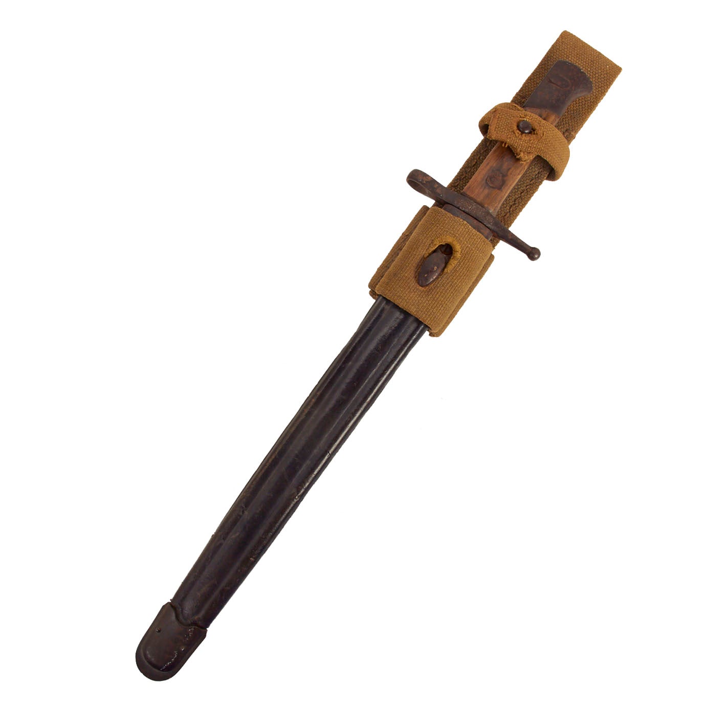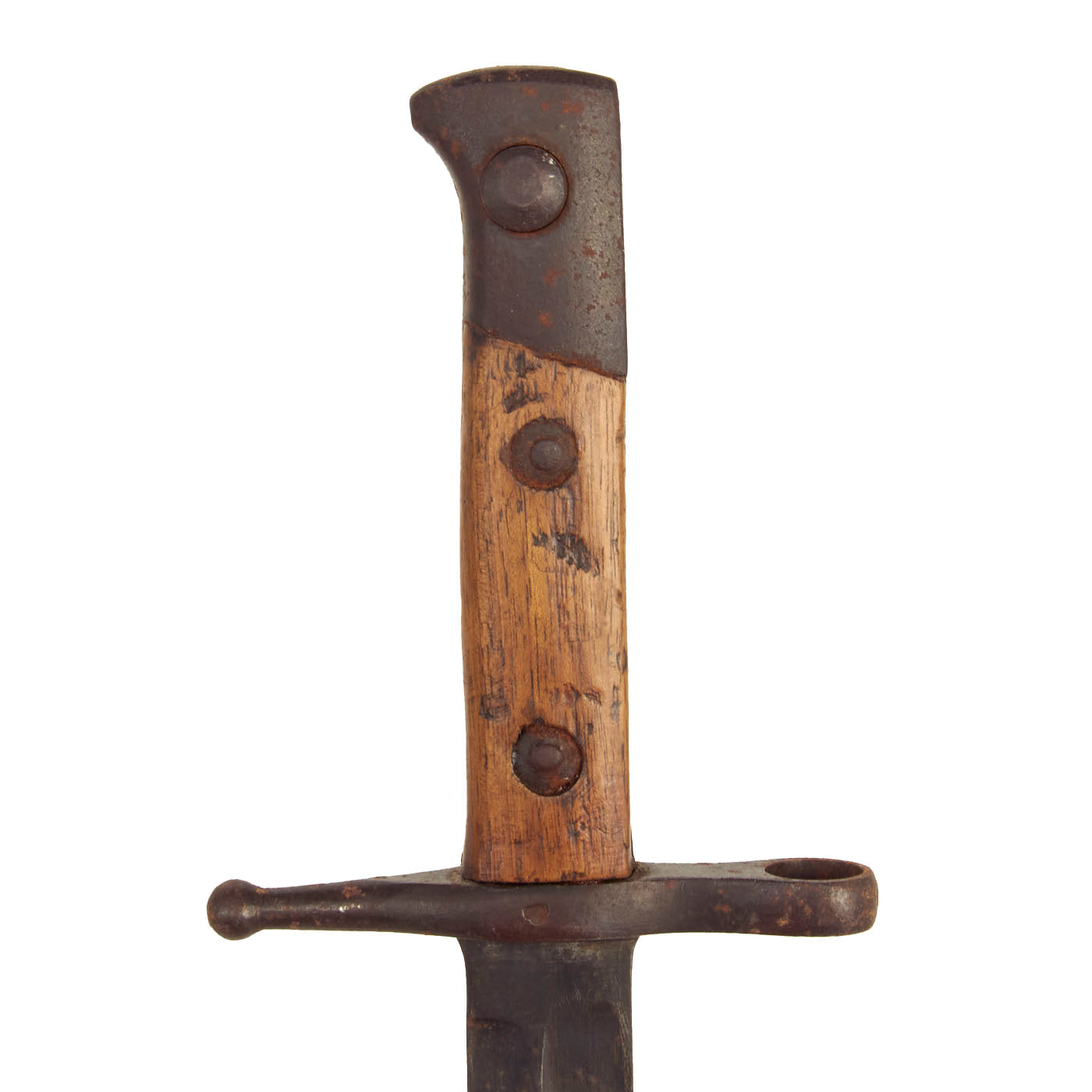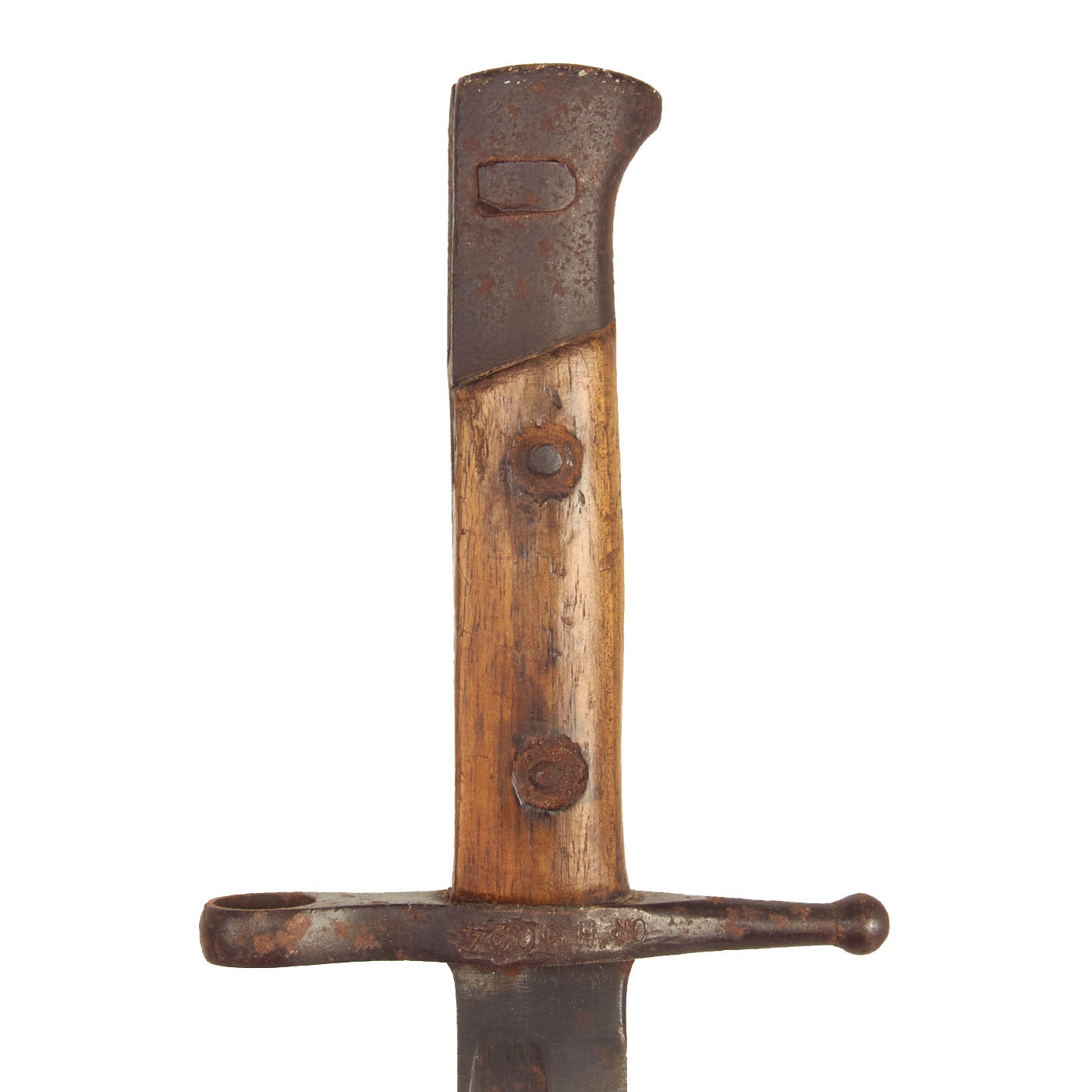 This example has no visible maker markings on the grip spine, and does not appear to have been arsenal refurbished, as the machine marks are still visible. It is faintly marked on the cross guard, most likely the serial number of the rifle it was fitted to. The blade has the original arsenal sharpening, and is in fair condition, with a lot of finish wear from the scabbard. The wooden grip scales are also quite worn, with some chips, dents and dark staining present.