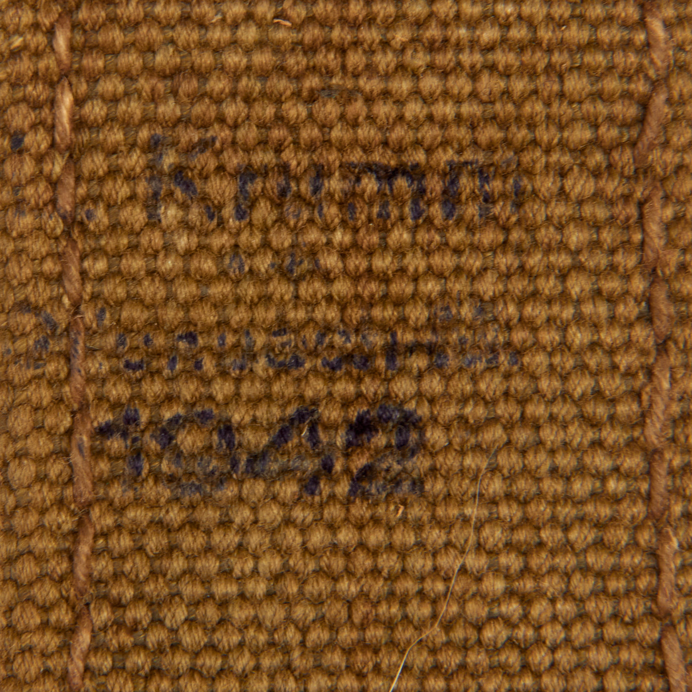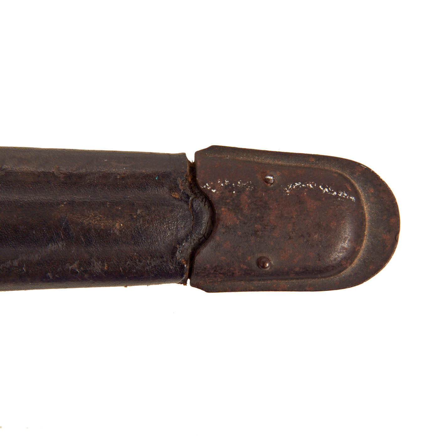 The steel-fitted leather scabbard has held up quite well, and still has a good deal of the original finish on the leather. The stitching is intact, and the throat is still tight on the blade. The Olive-green colored web frog is fully intact, though there is some wear to the stitching around the hole for the scabbard button. There are some legible markings on the frog, though we can only make out the year of 1942.