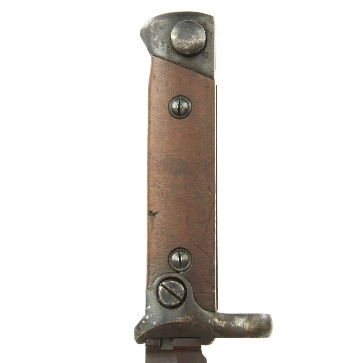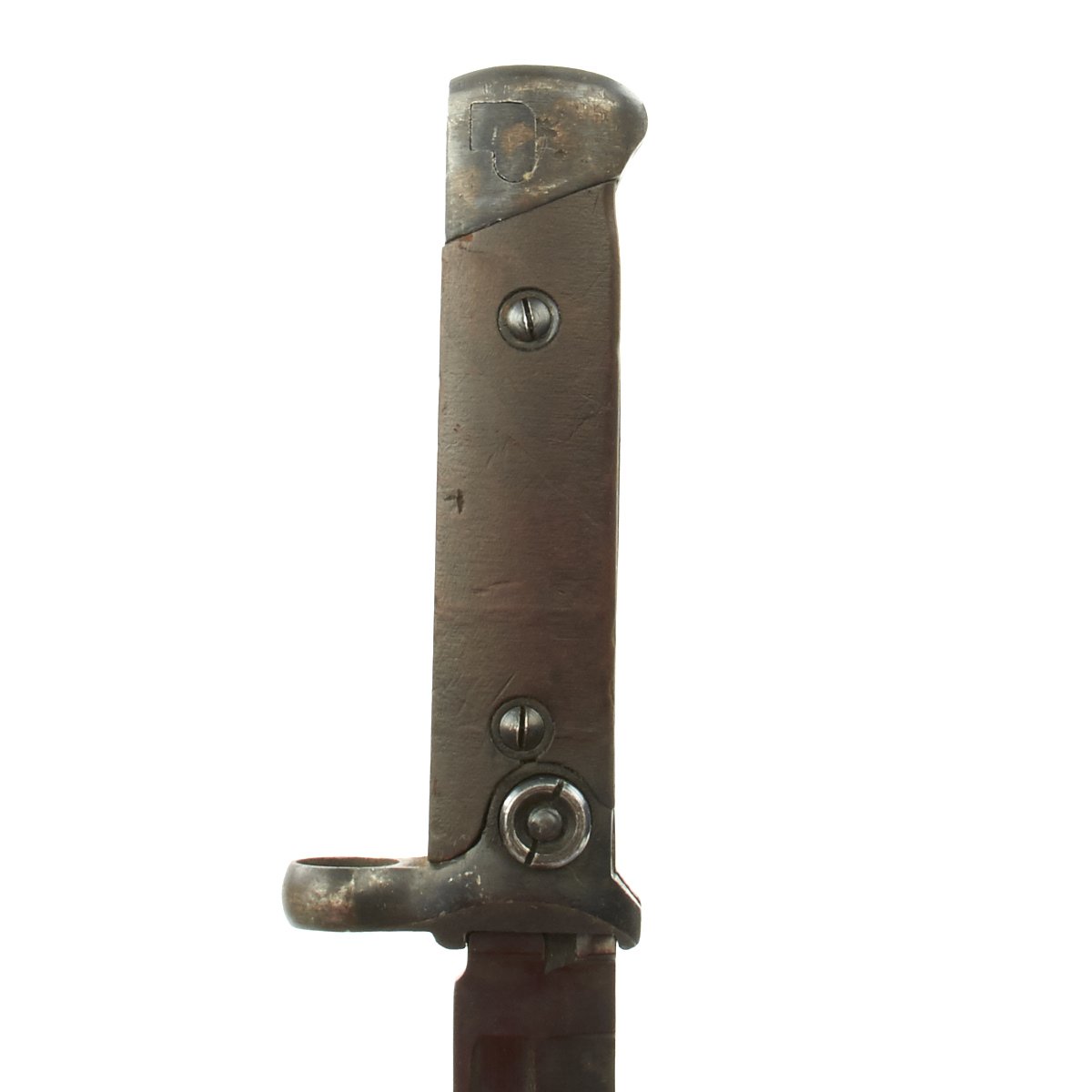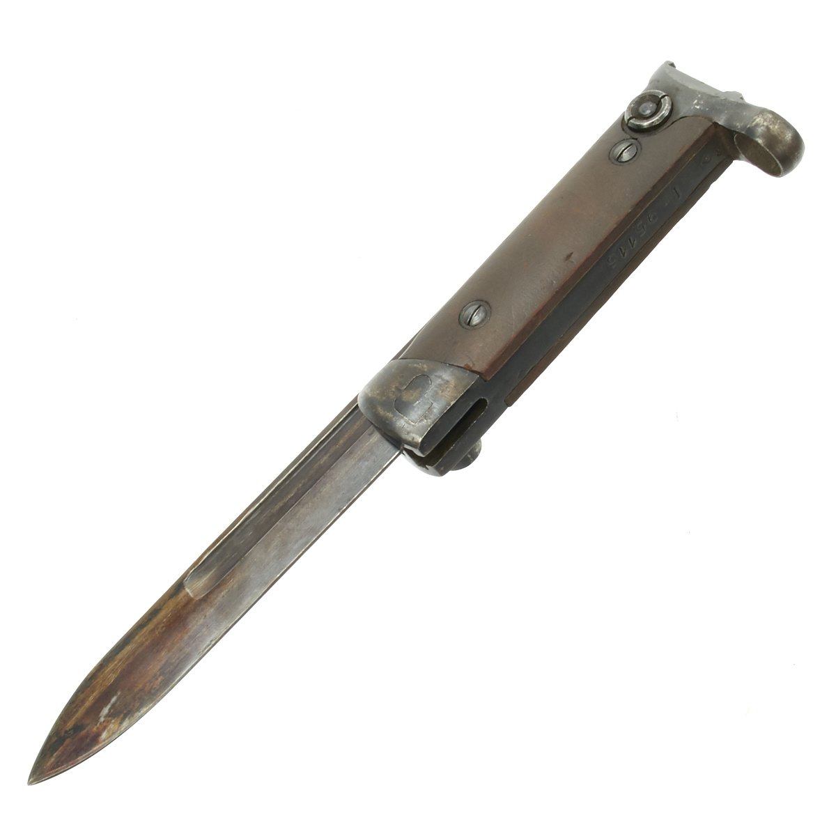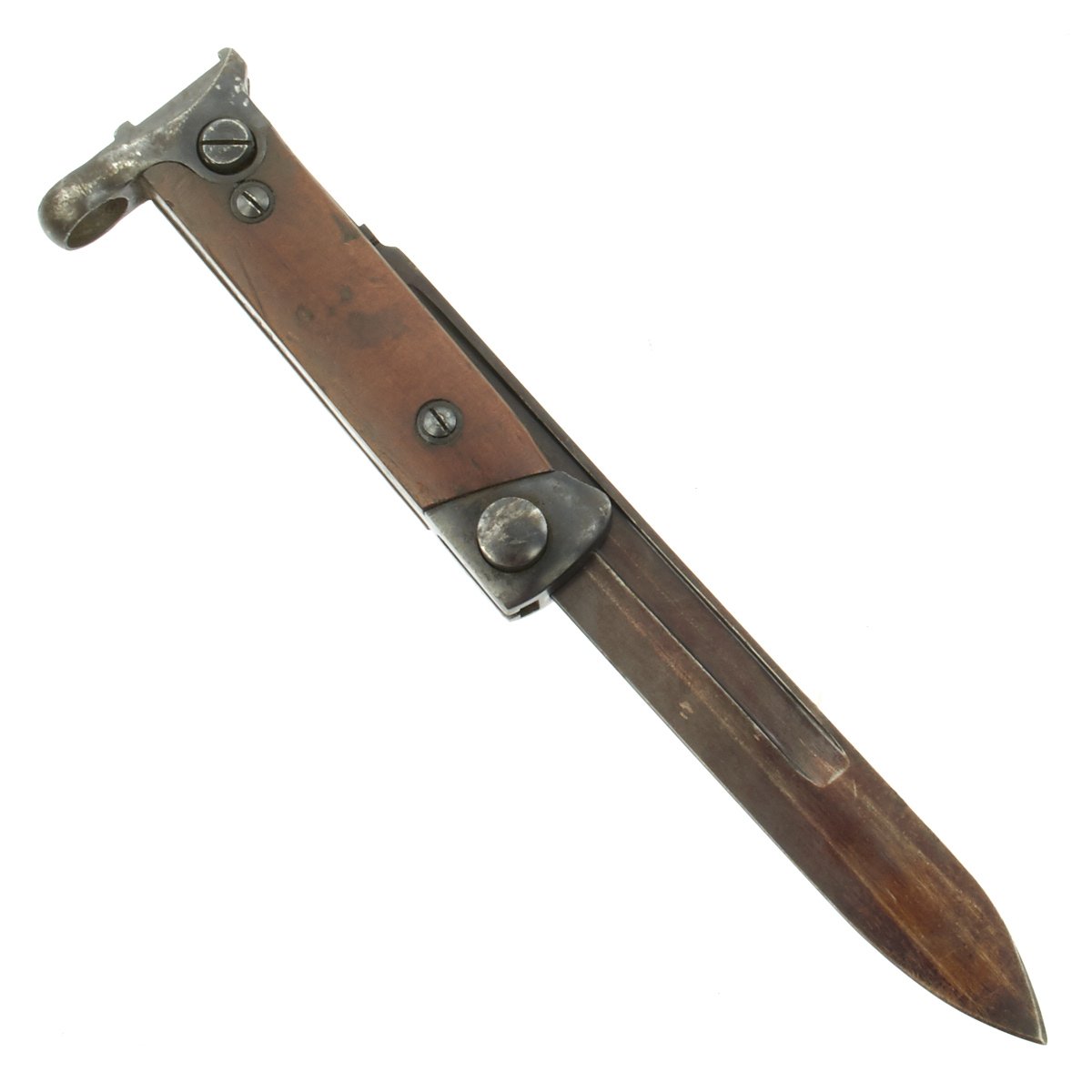 This particular example is complete and has not been modified, so it still folds up correctly. Overall condition is very good, with functional push button and original finish on blade and wood grips. A wonderful rare bayonet perfect for any WWII Italian or bayonet collection.