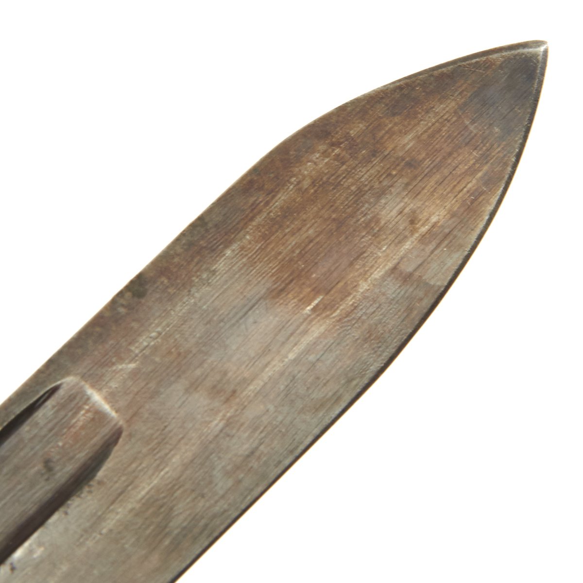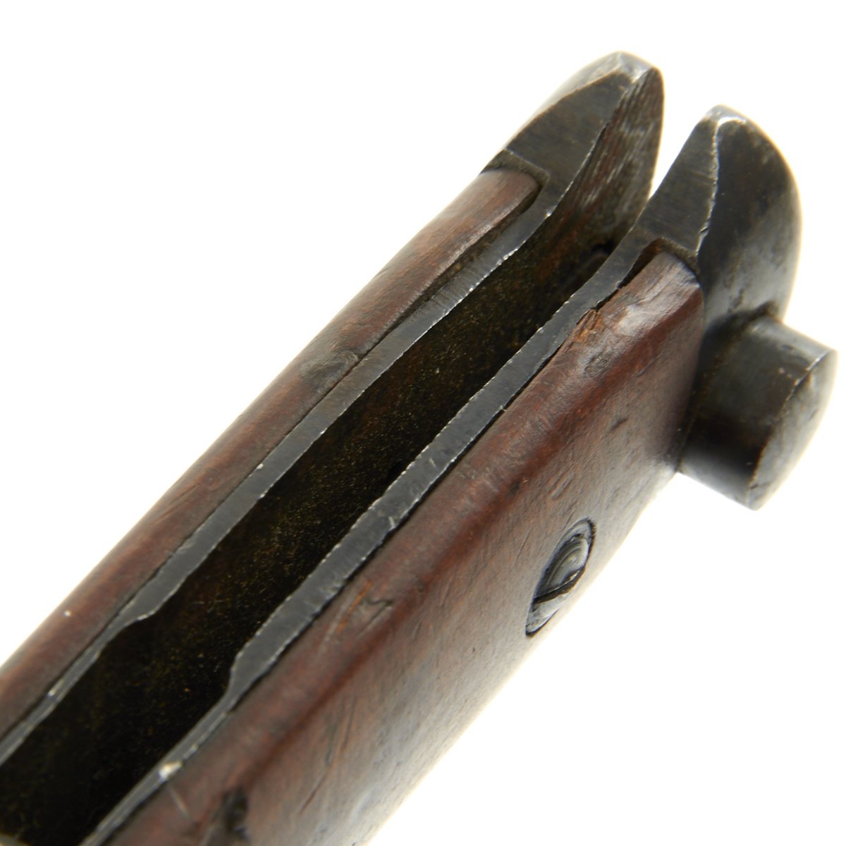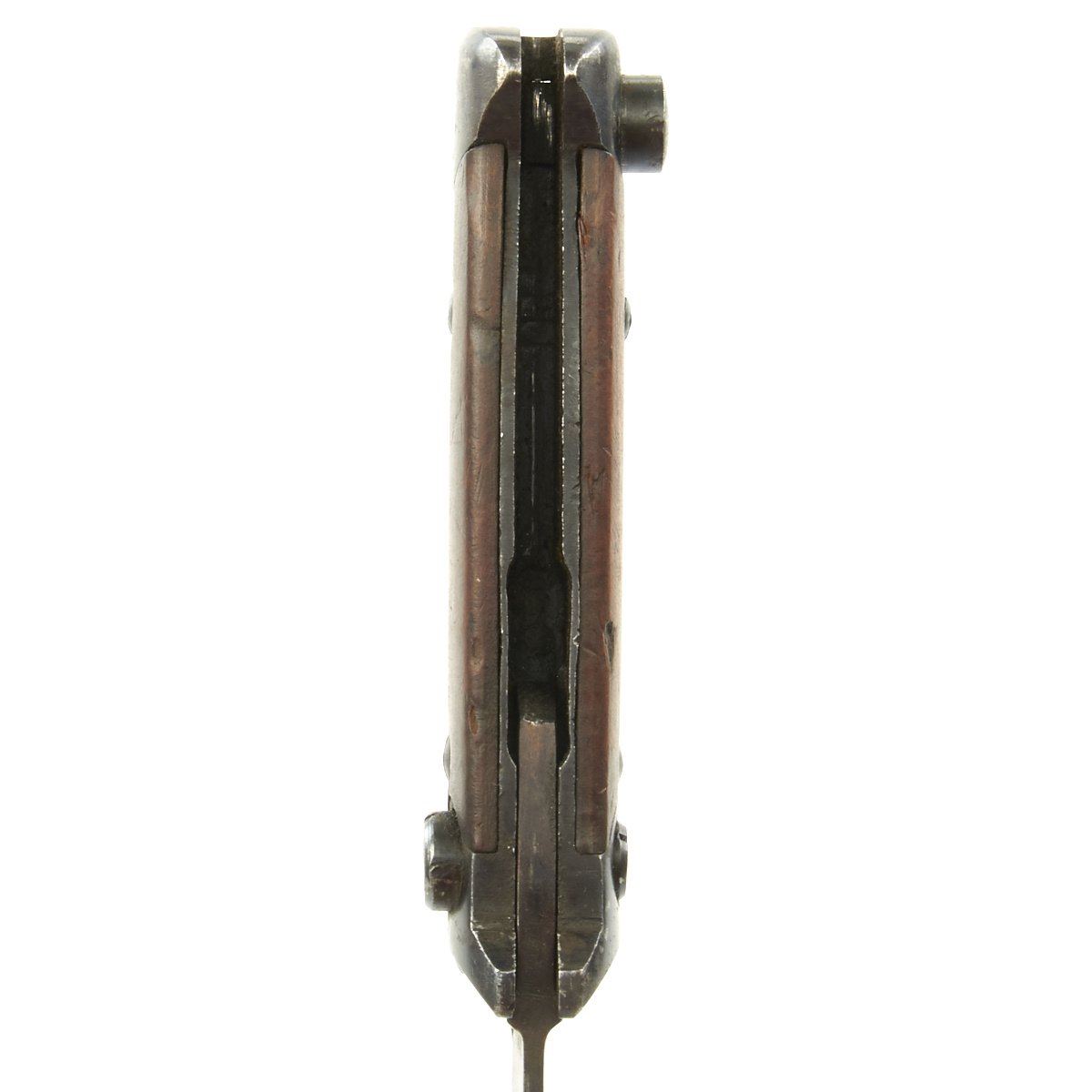 This example is the push-button folding model, where blade folds into handle like a pocket knife. This was done because the bayonet was intended to remain fixed to the rifle during regular use. When the bayonet was not needed, it would fold into a slot in the nose of the stock. This did not work well in practice, so the folding feature was discontinued and a steel scabbard provided. Many of the folding bayonets were converted to fixed-blade versions.
