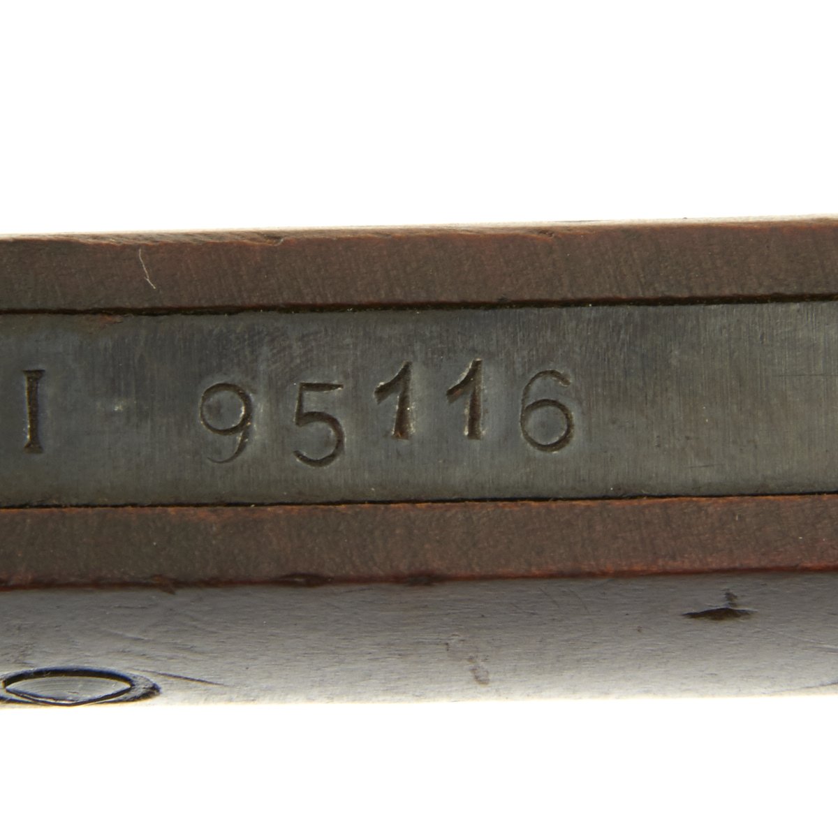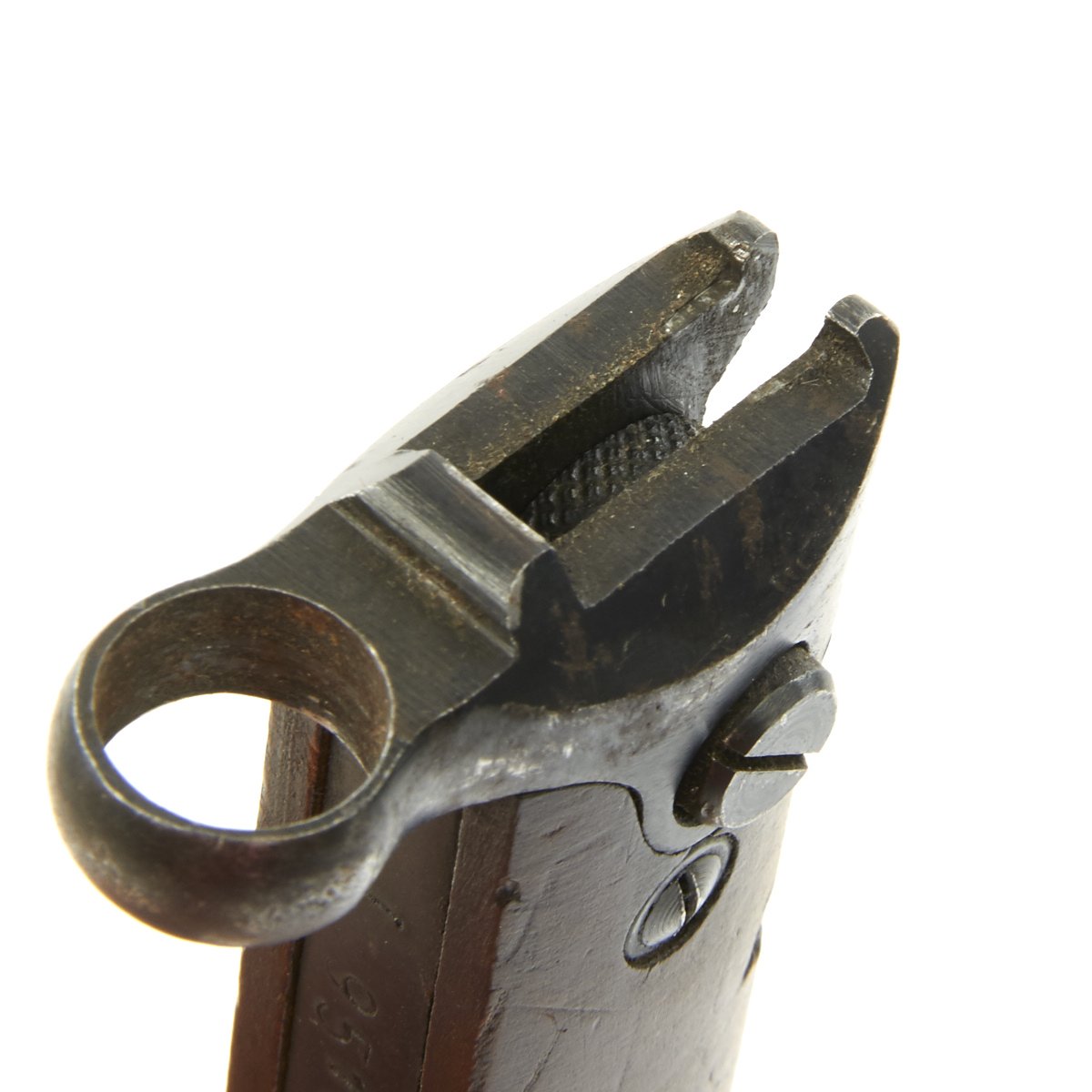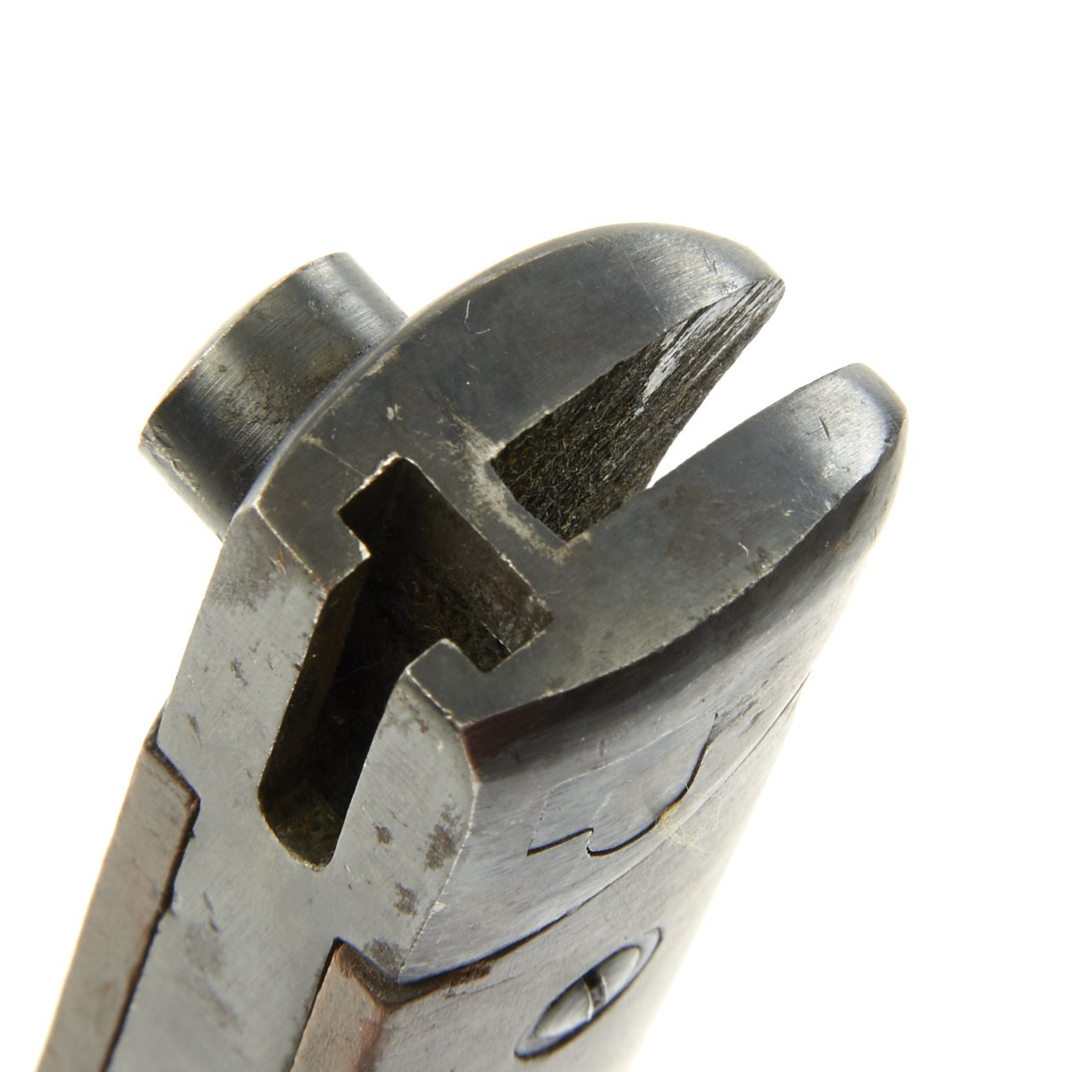 This example is the push-button folding model, where blade folds into handle like a pocket knife. This was done because the bayonet was intended to remain fixed to the rifle during regular use. When the bayonet was not needed, it would fold into a slot in the nose of the stock. This did not work well in practice, so the folding feature was discontinued and a steel scabbard provided. Many of the folding bayonets were converted to fixed-blade versions.