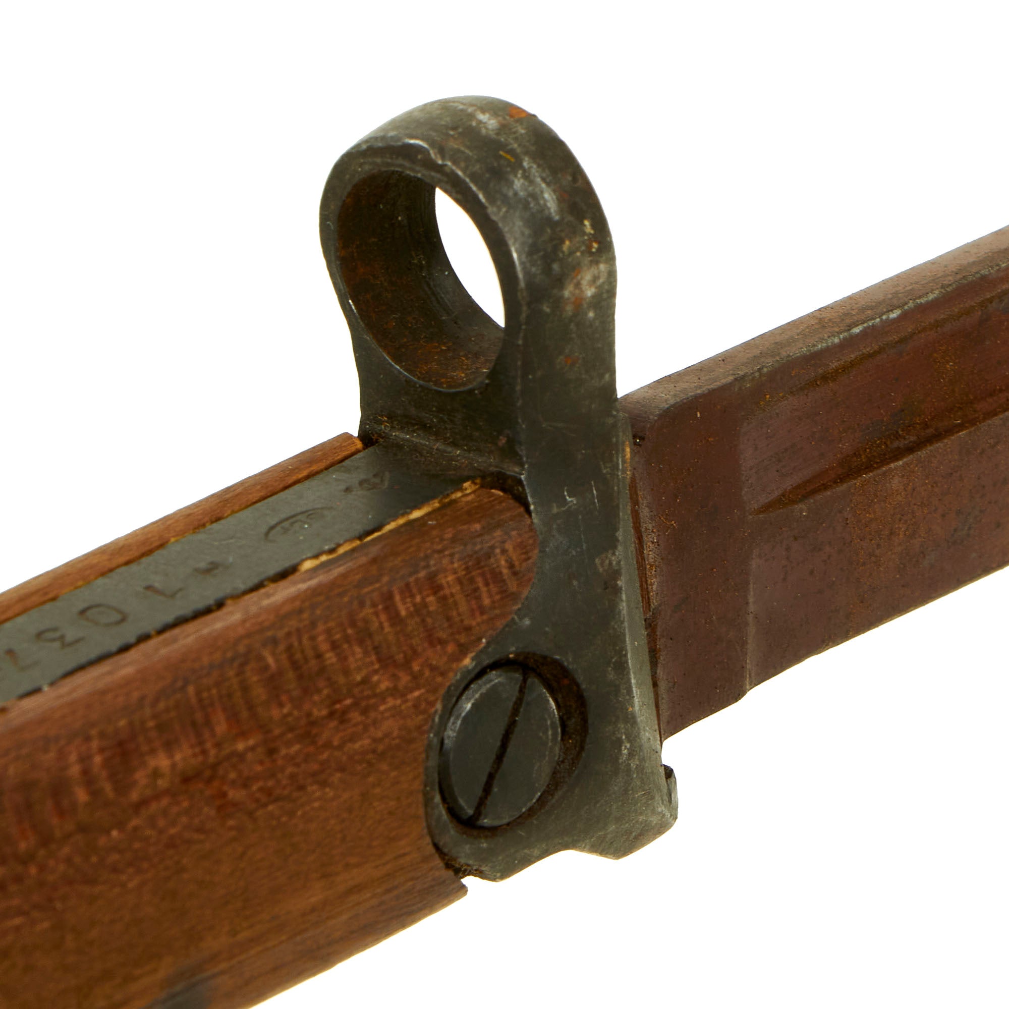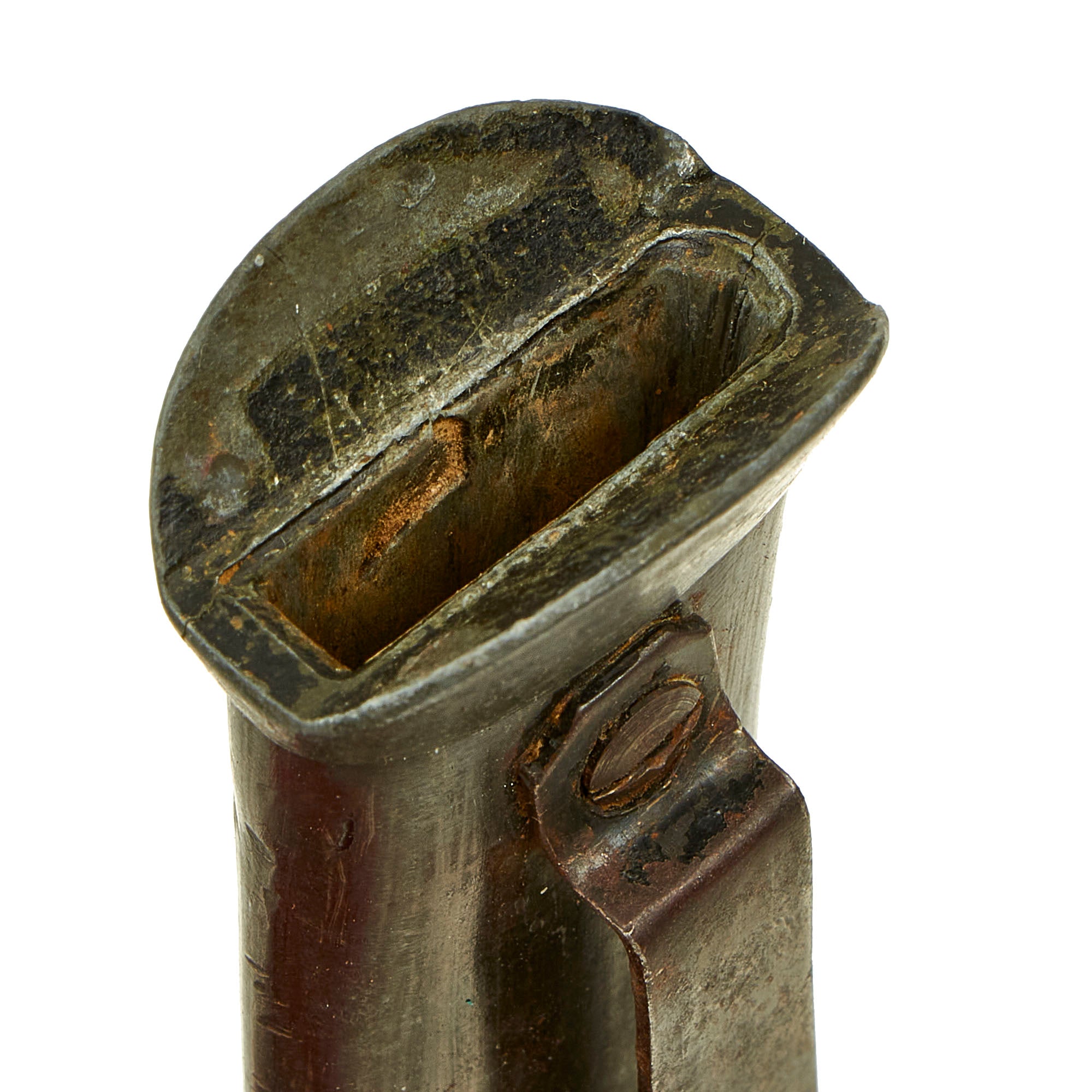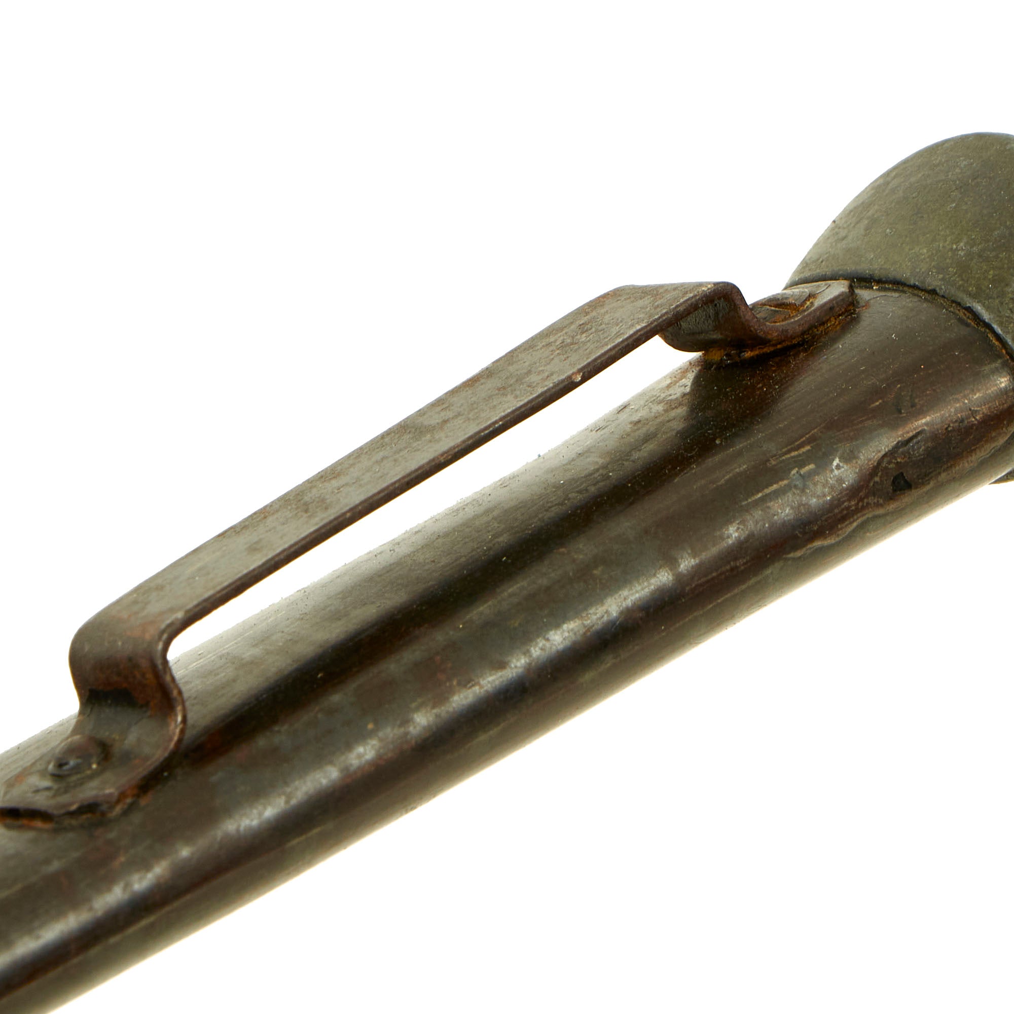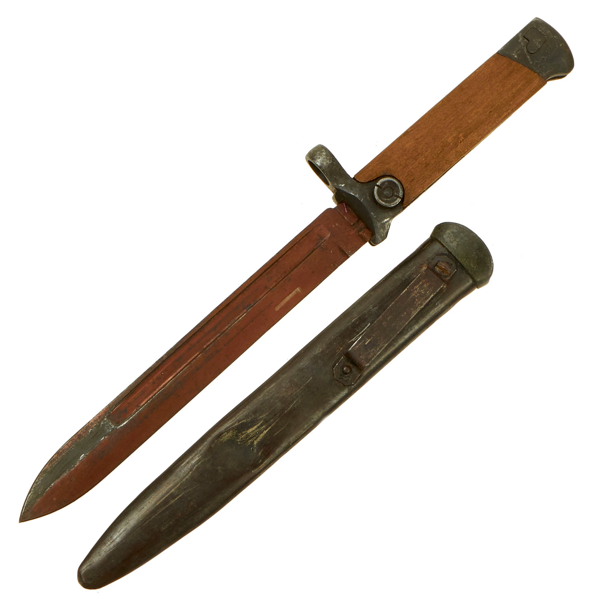 Original Item: Only One Available. This is a very nice example of a WWII Italian M1938 Carcano folding bayonet, complete with the rare steel scabbard. This unique folding knife bayonet for use on the Mannlicher-Carcano M1938 Short Rifle (fucile corto). Officially named the Fucile di Fanteria Mod. 1938 ("infantry rifle" Model 1938), it was adopted in 1938 in 7.35×51mm caliber, and had fixed sights, a detachable folding knife bayonet, and 20.9 inch barrel. These rifles were produced in both 6.5 mm. and 7.35 mm.