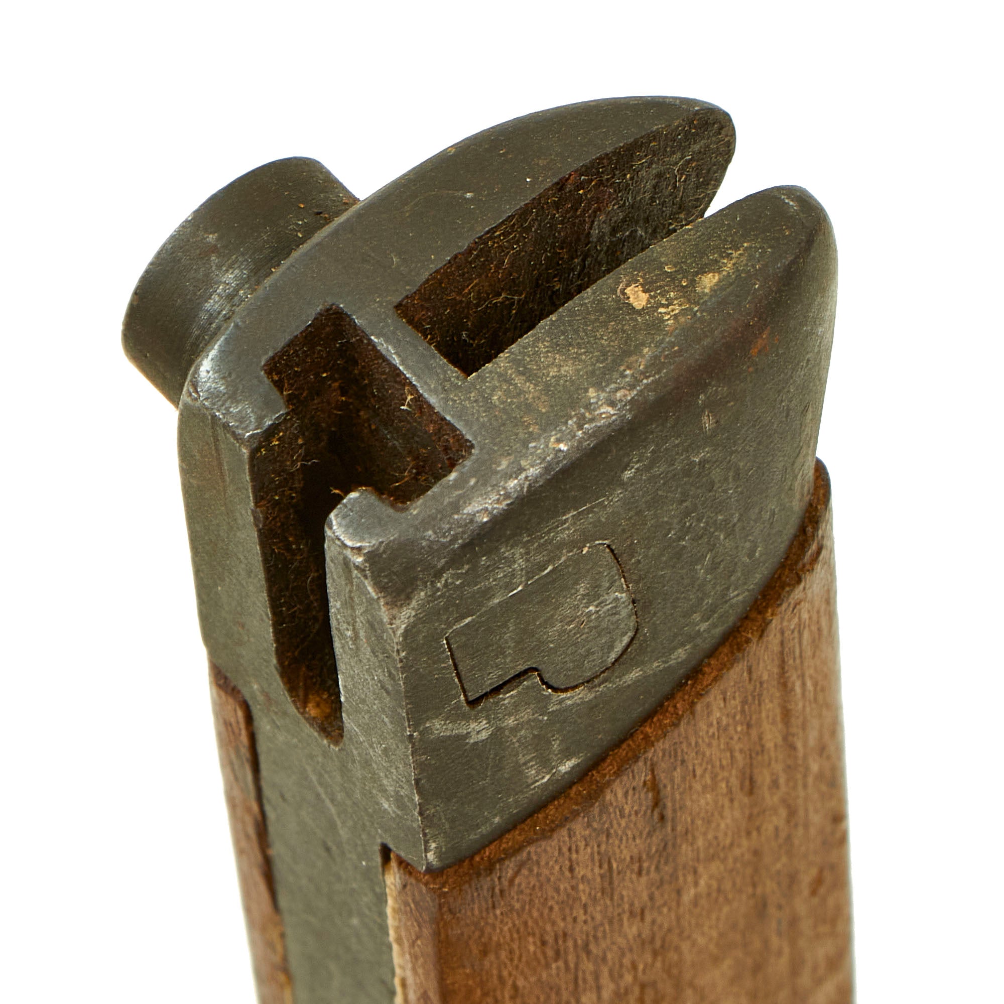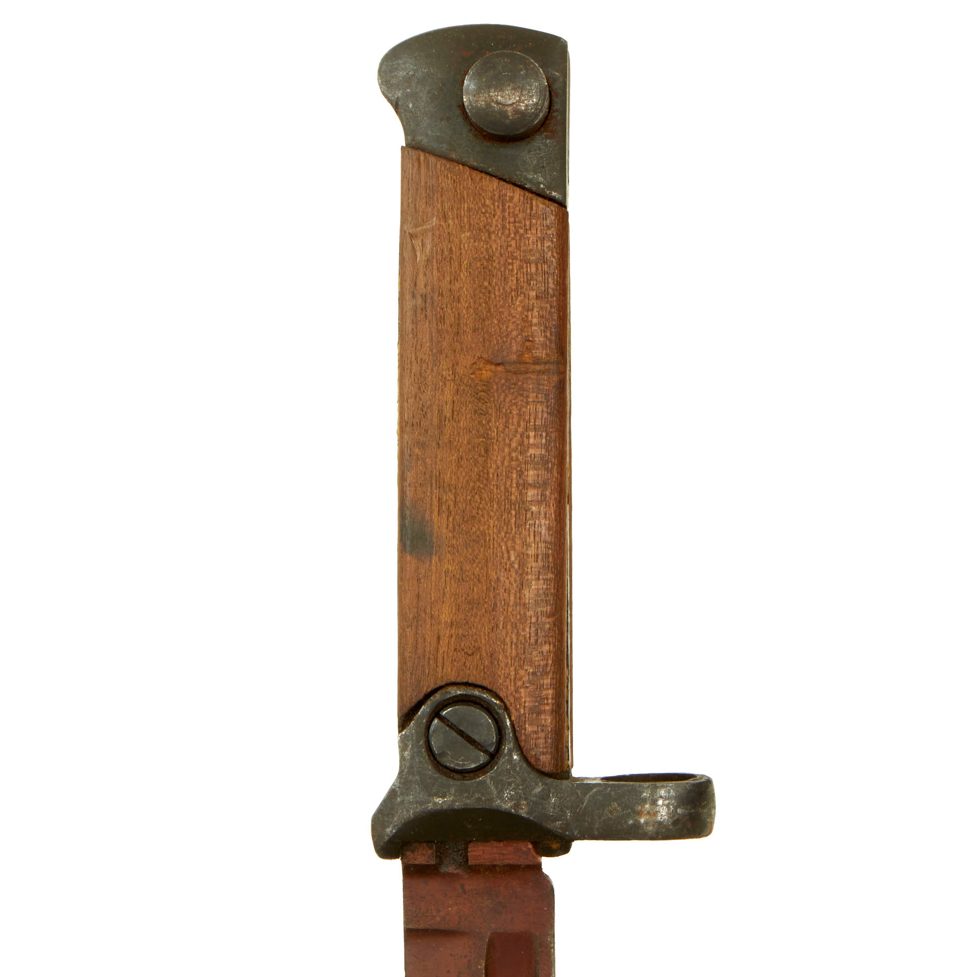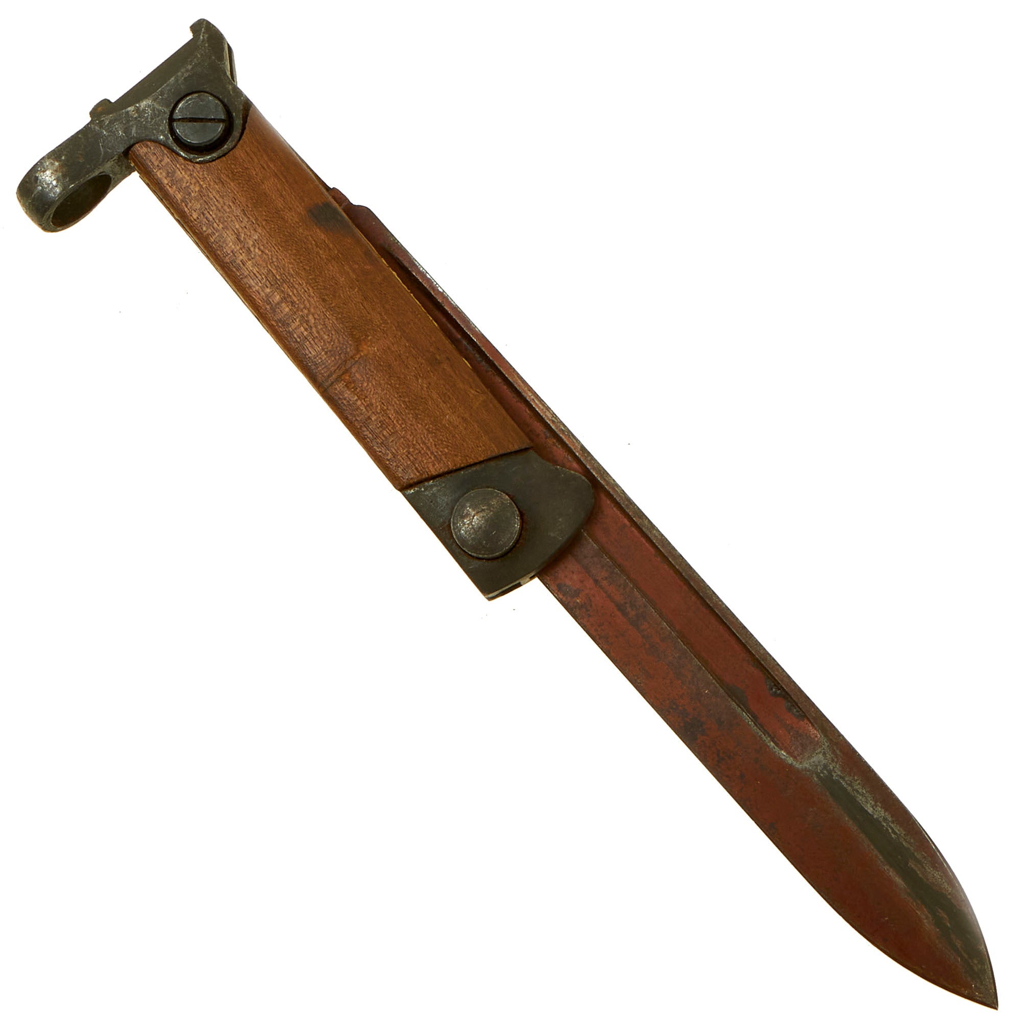 This example is the push-button folding model, where the blade folds into the handle like a pocket knife. This was done because the bayonet was intended to remain fixed to the rifle during regular use. When the bayonet was not needed, it would fold into a slot in the nose of the stock. This did not work well in practice, so the folding feature was discontinued and a steel scabbard provided. Many of the folding bayonets were converted to fixed-blade versions.