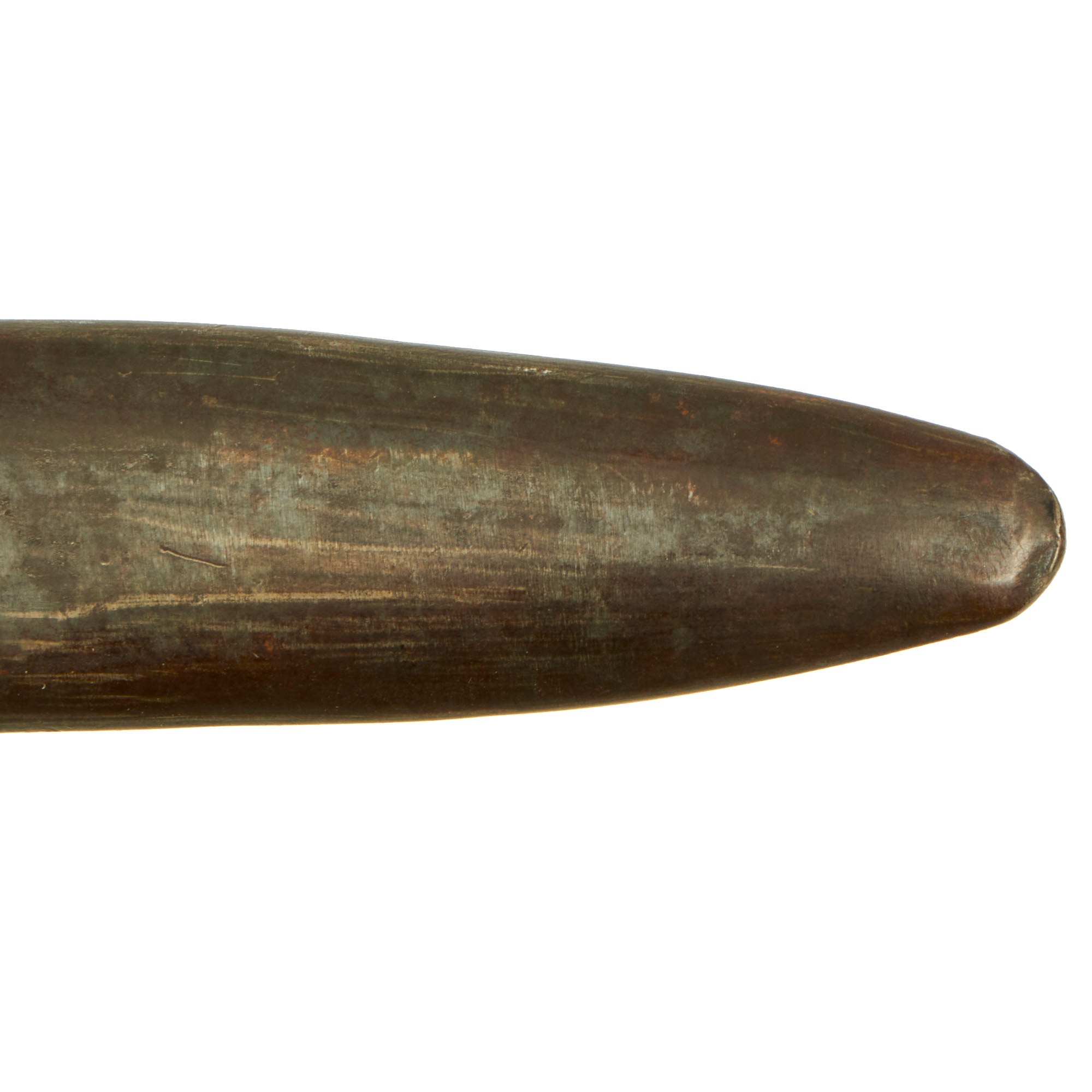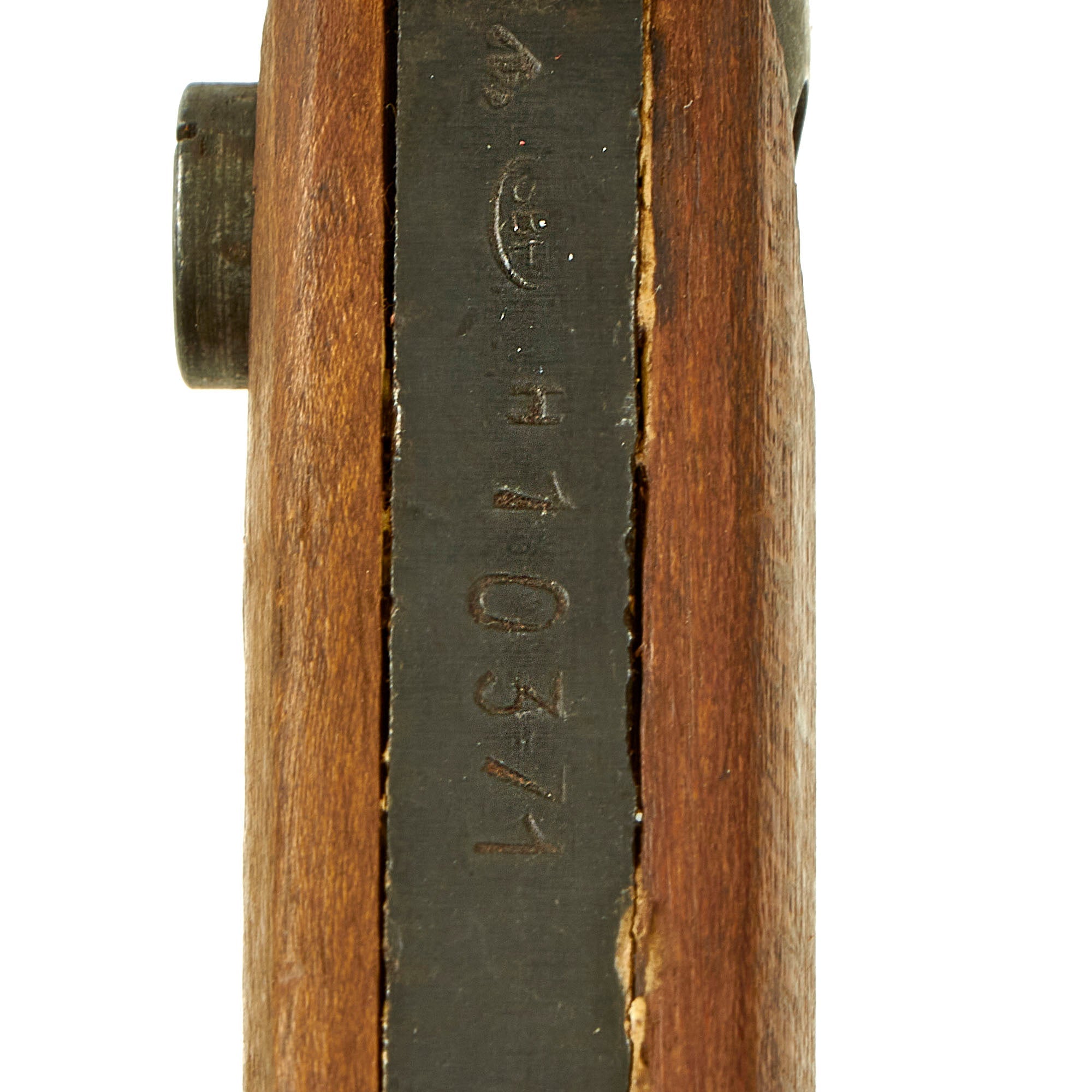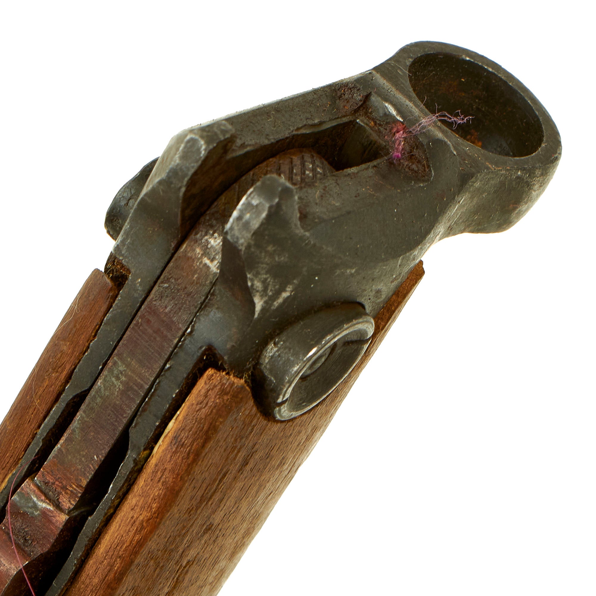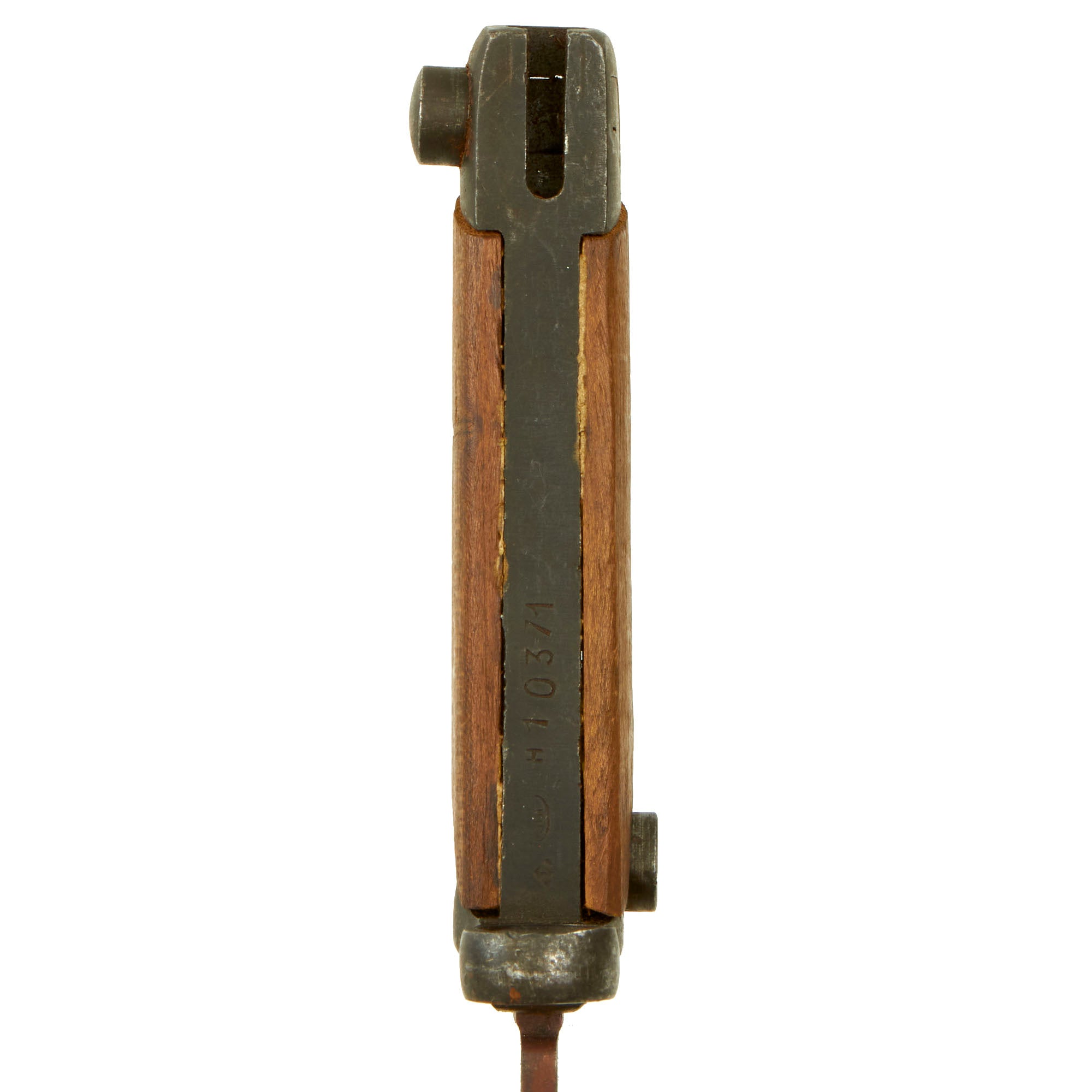This example is the push-button folding model, where the blade folds into the handle like a pocket knife. This was done because the bayonet was intended to remain fixed to the rifle during regular use. When the bayonet was not needed, it would fold into a slot in the nose of the stock. This did not work well in practice, so the folding feature was discontinued and a steel scabbard provided. Many of the folding bayonets were converted to fixed-blade versions.