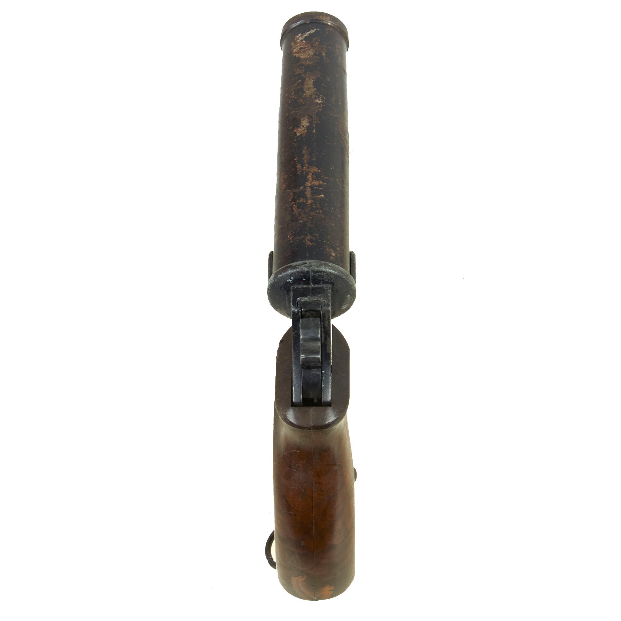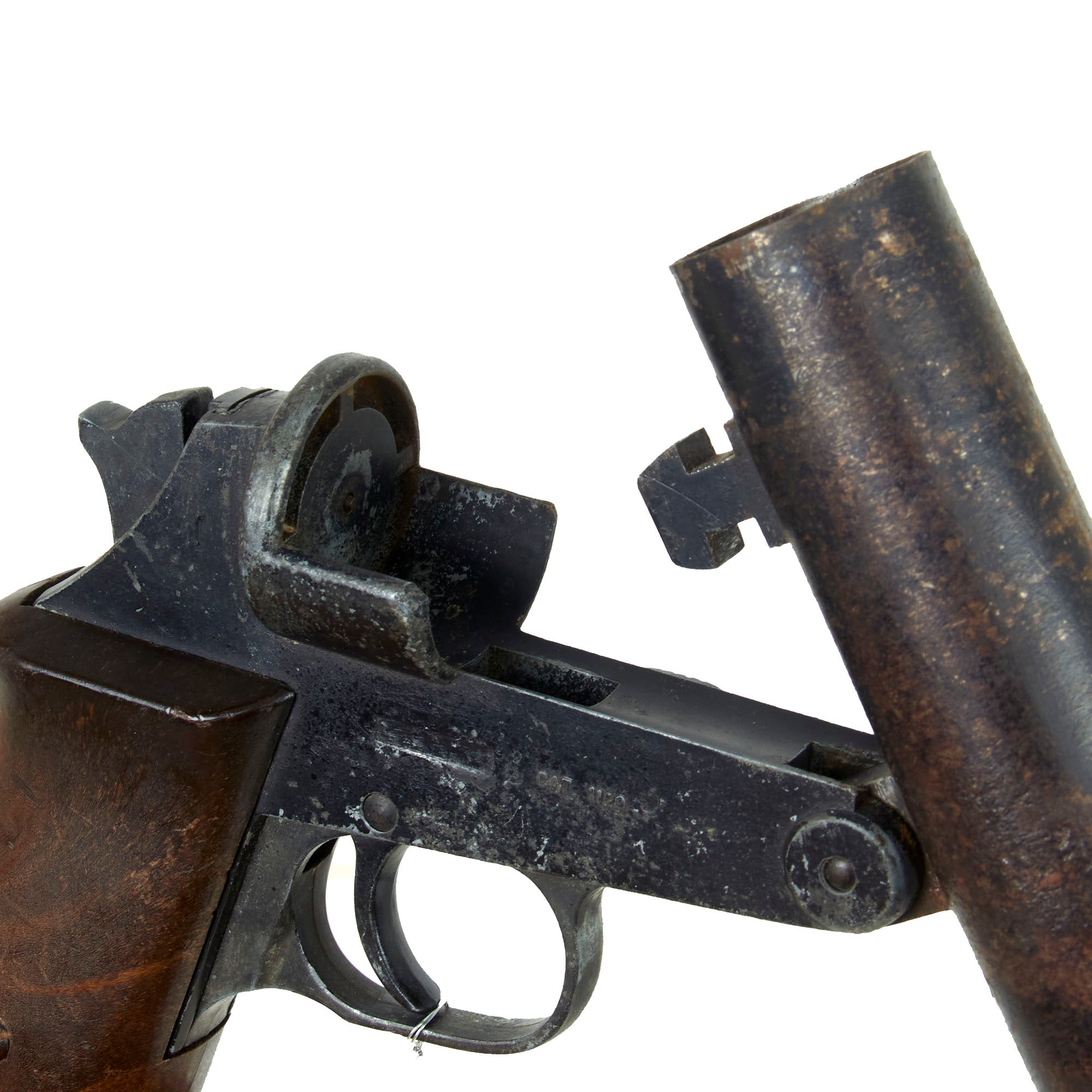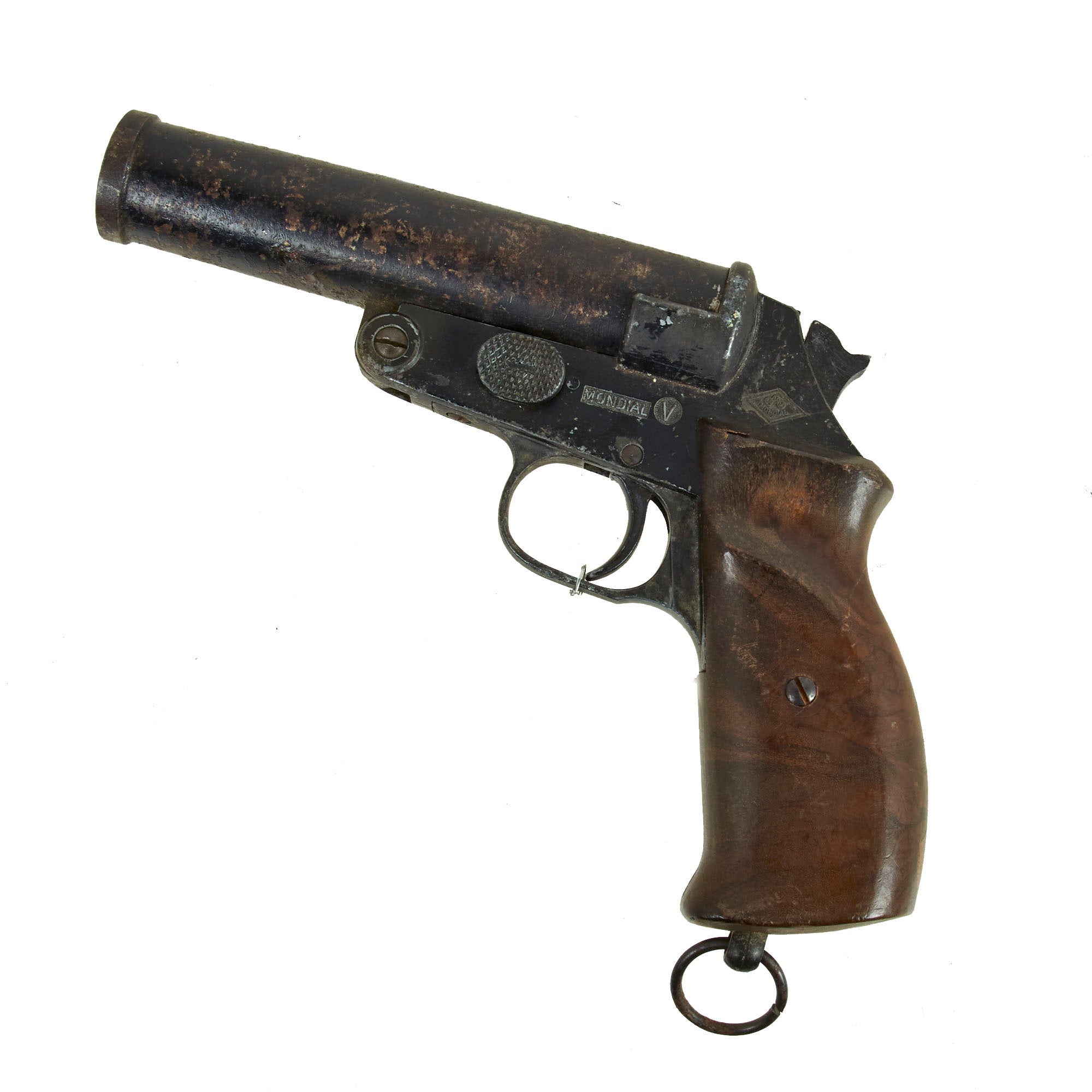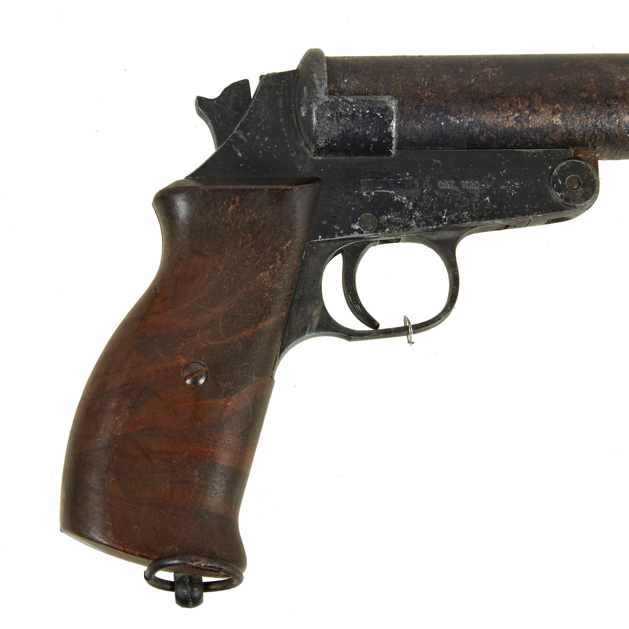Original Item. Only One Available. This is a nice WWII Italian Mondial Model V Signal Pistol, marked at the left frame "Mondial", "V in circle", above left grip on frame within a diamond form "three circles with M in each over Mondial". This was used by the Italians during World War II, and this example is still in working order. It’s marked with CAT. 1129 on the right side of the frame.