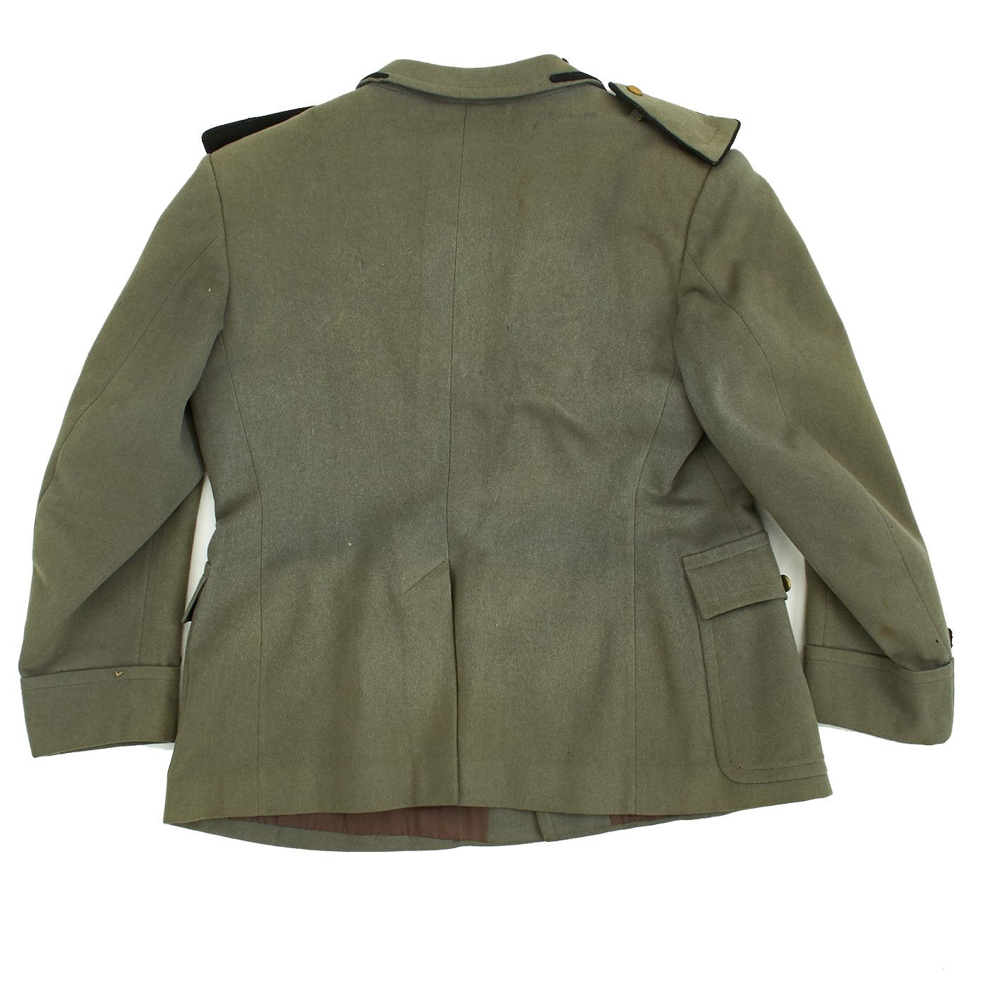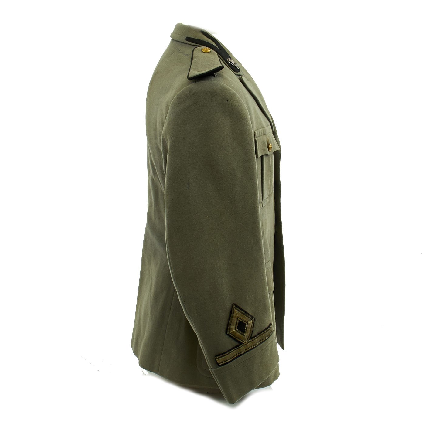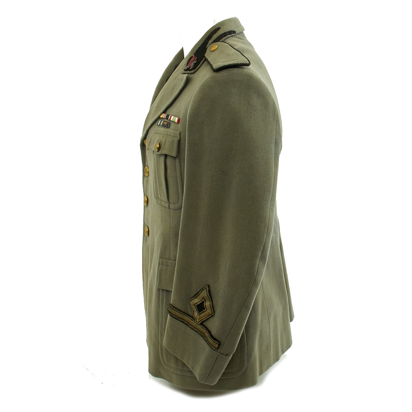 Original Item: Only One Available. World War Two Italian MVSN Aspirante Sottocapomanipolo (Officer Cadet) tunic constructed of green wool. Features MVSN black collar tabs with fascist axe inside M collar pins, Aspirante sleeve rank insignia and multiple medal ribbons. Front has four button closure, two hip pockets and two chest pockets. Overall very good condition.